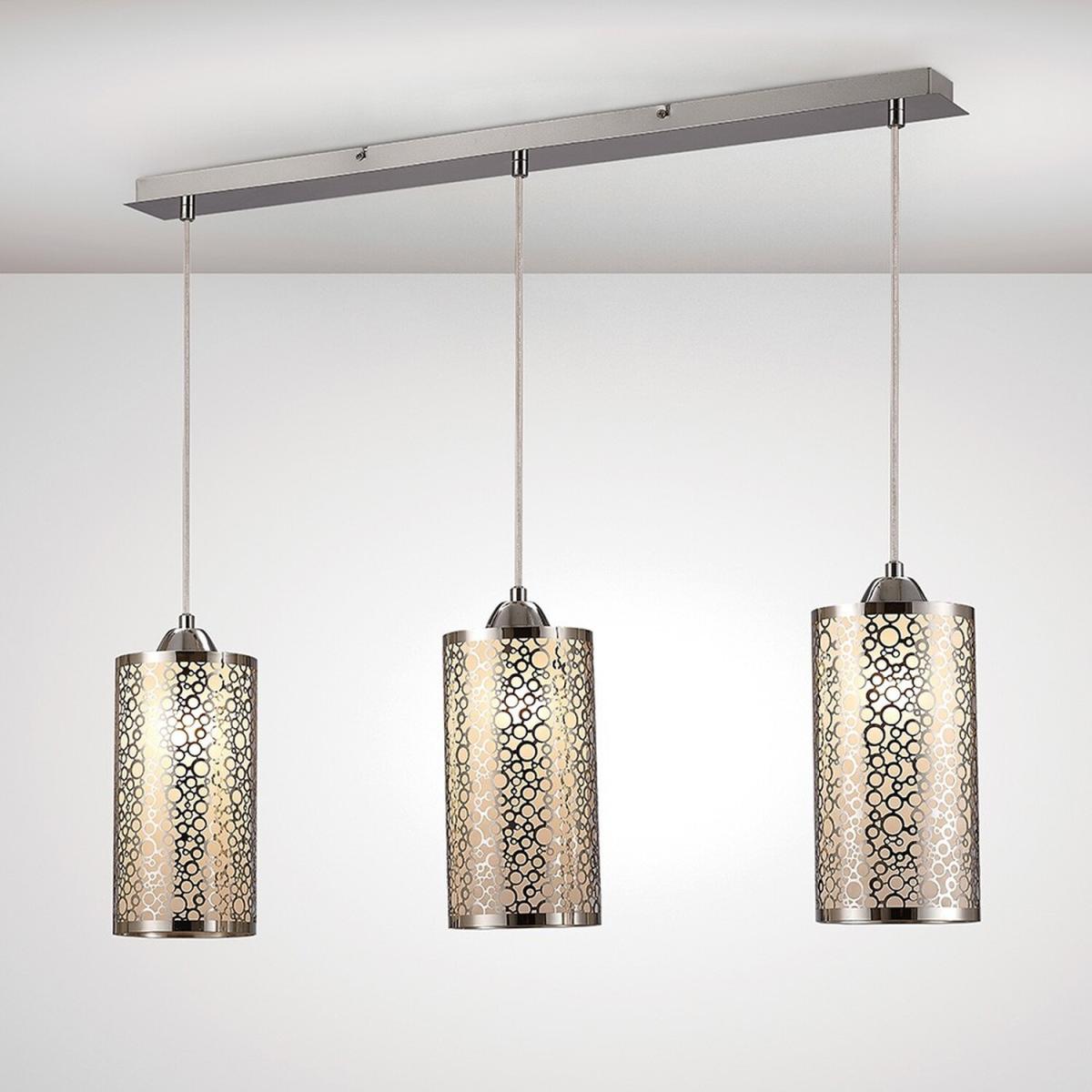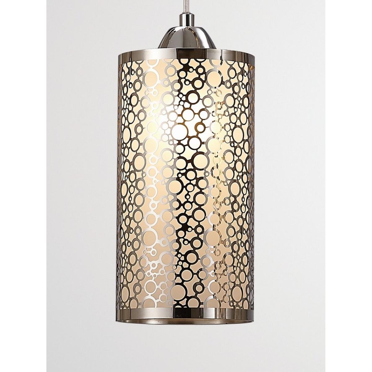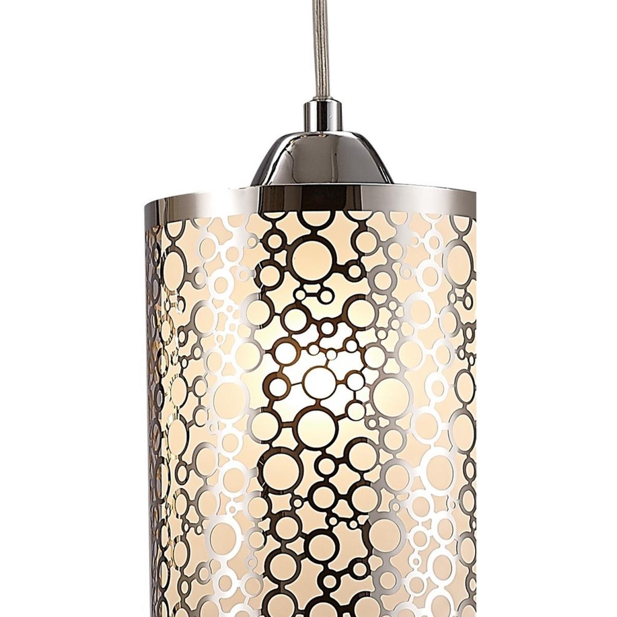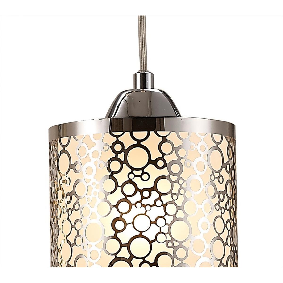 This range utilizes slim cylindrical glass shades. Every glass is frosted and decorated with round chrome patterns. The 3 light line and one of the single pendants displays a pattern consisting of multiple circles in different sizes. The second single pendant has a symetrical oval design contributing variety to the collection. This uses E27 lampholders and takes 60W maximum lamps.