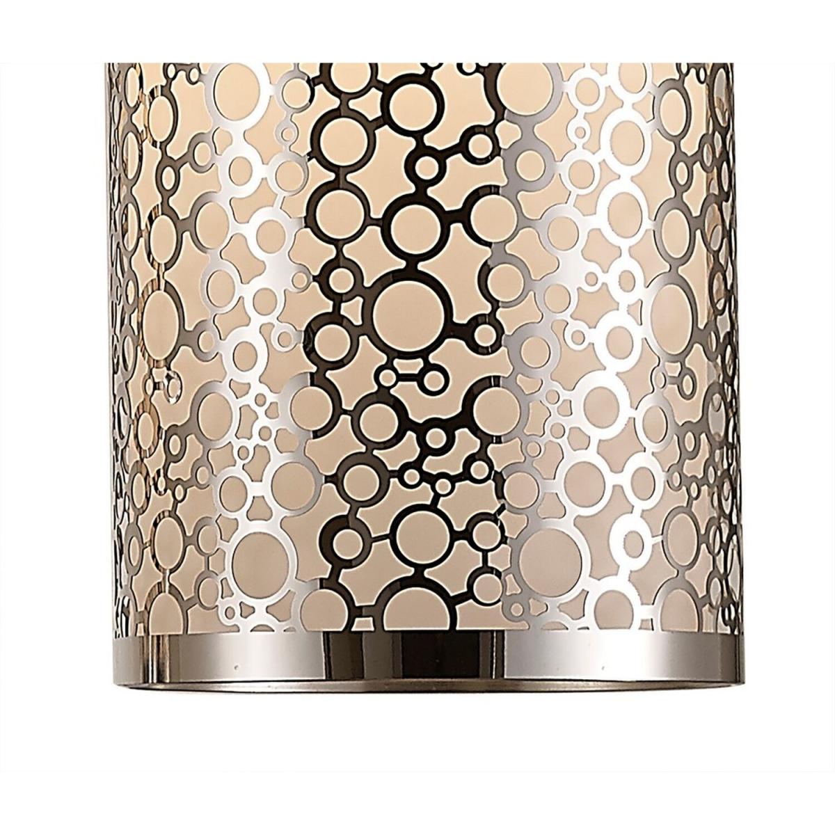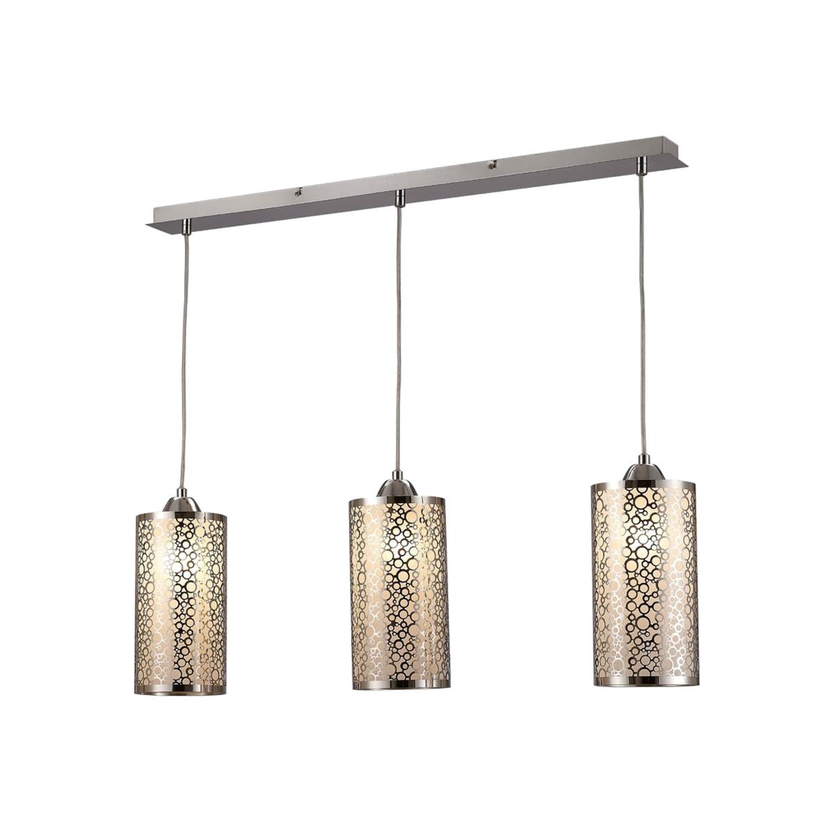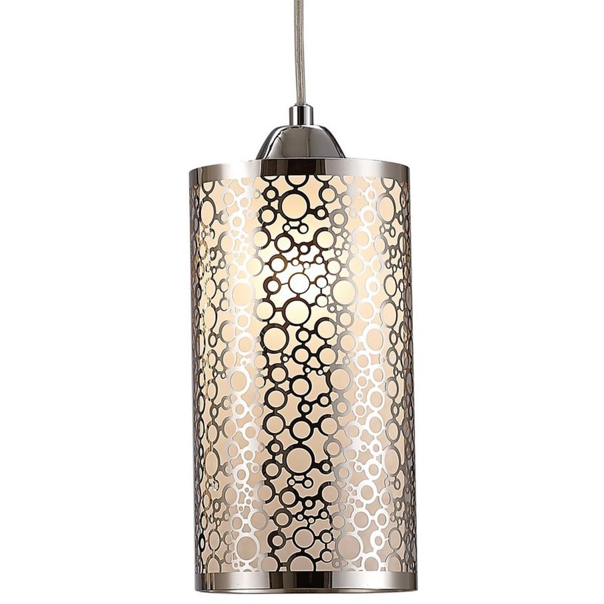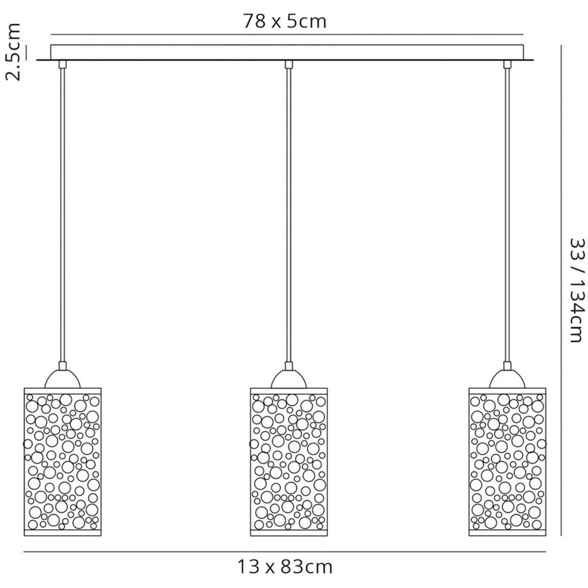 This range utilizes slim cylindrical glass shades. Every glass is frosted and decorated with round chrome patterns. The 3 light line and one of the single pendants displays a pattern consisting of multiple circles in different sizes. The second single pendant has a symetrical oval design contributing variety to the collection. This uses E27 lampholders and takes 60W maximum lamps.