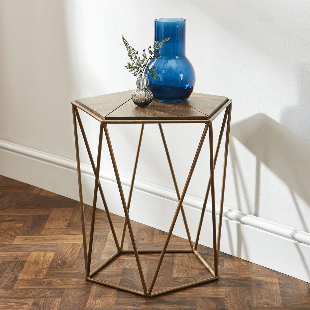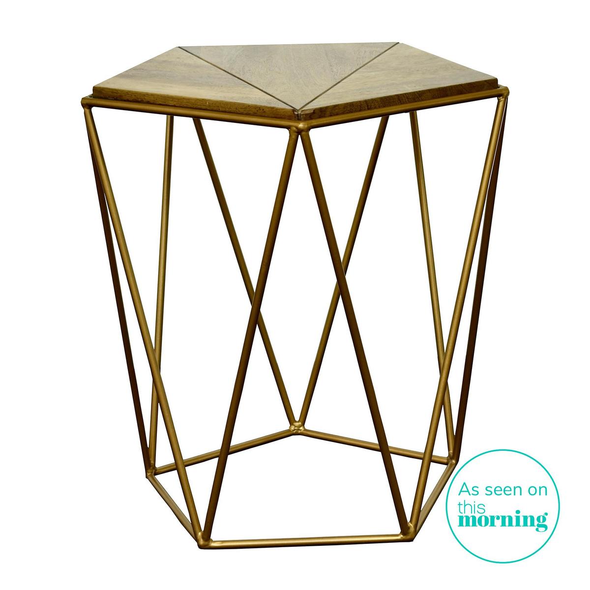 Dunelm Exclusive - Designed and Developed by Dunelm. Inspired by clean, simplistic styling, this fully assembled side table features a mango wood top and a stylish, brass effect finished frame.