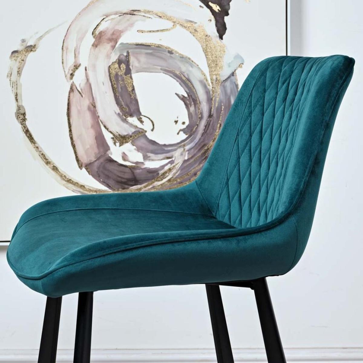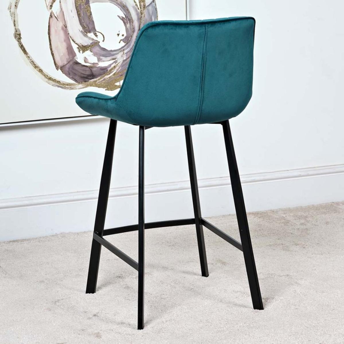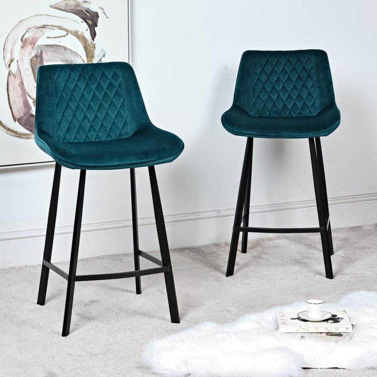 I love this set of teal bar stools for their bold colour and modern yet versatile design. They work particularly well in contemporary or eclectic interiors, adding a pop of colour to neutral kitchens or breakfast bars. The velvet upholstery offers a touch of luxury, while the quilted detailing adds visual interest without overpowering the space. Practical styling tips include pairing them with a minimalist marble or wood-topped counter to let the teal really stand out, or layering with patterned cushions for added comfort and personality. Their sleek black legs and understated silhouette make them adaptable to both casual and more refined settings, making them a smart choice for a stylish yet functional seating option.