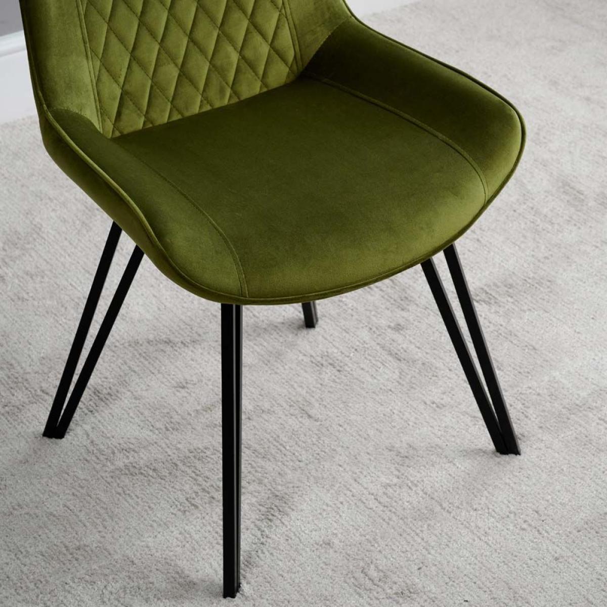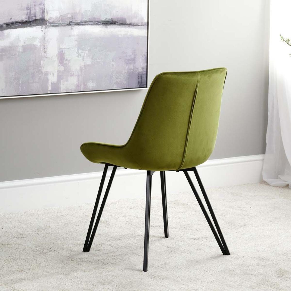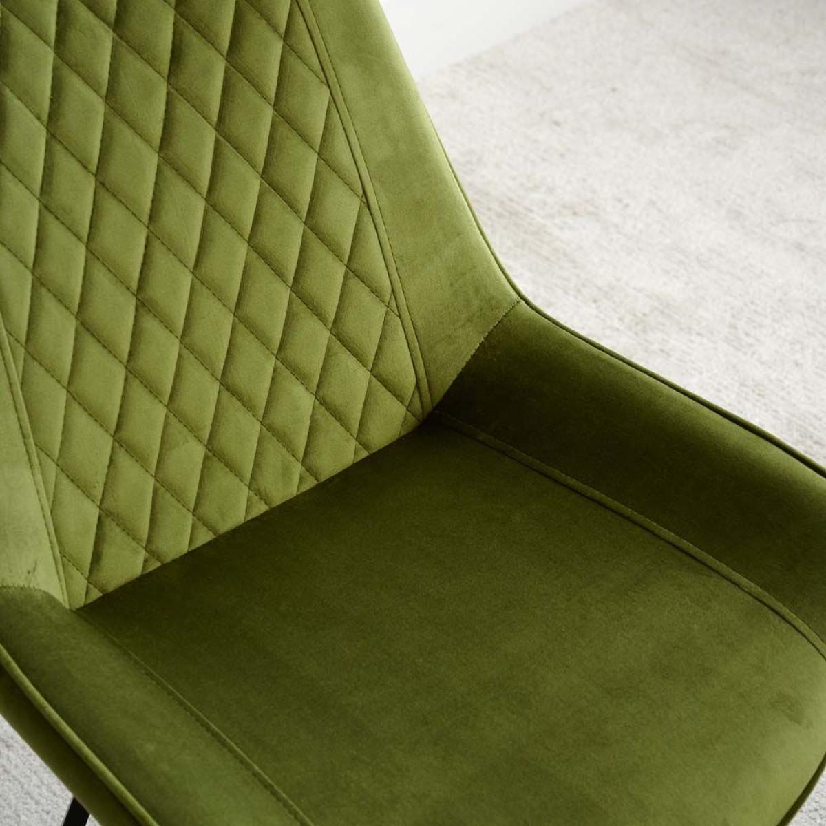 The sumptuous Chase Green Velvet Dining Chairs are perfectly comfortable and supportive, featuring a slightly bucketed seat with quilted upholstery and piping details, and industrial style black powder coated metal legs for support. The Chase green velvet dining chairs are sold as a pair and are also available in four other colour tones: Light Blue, Light Grey, Teal and Gold. Dimensions: W54cm x D63cm x H87cm Seat Height 48cm Velvet Upholstery Industrial style metal legs. Simple self assembly
