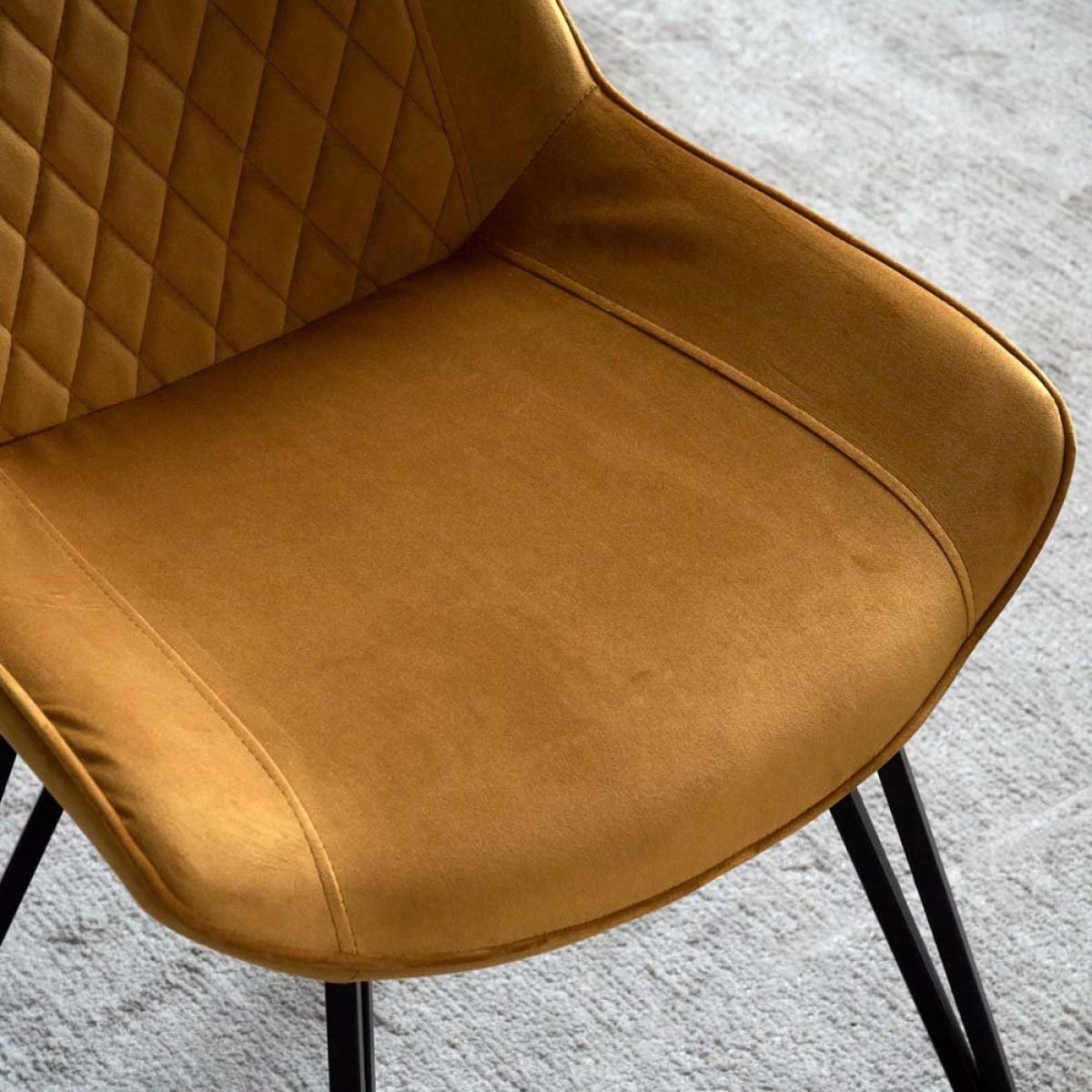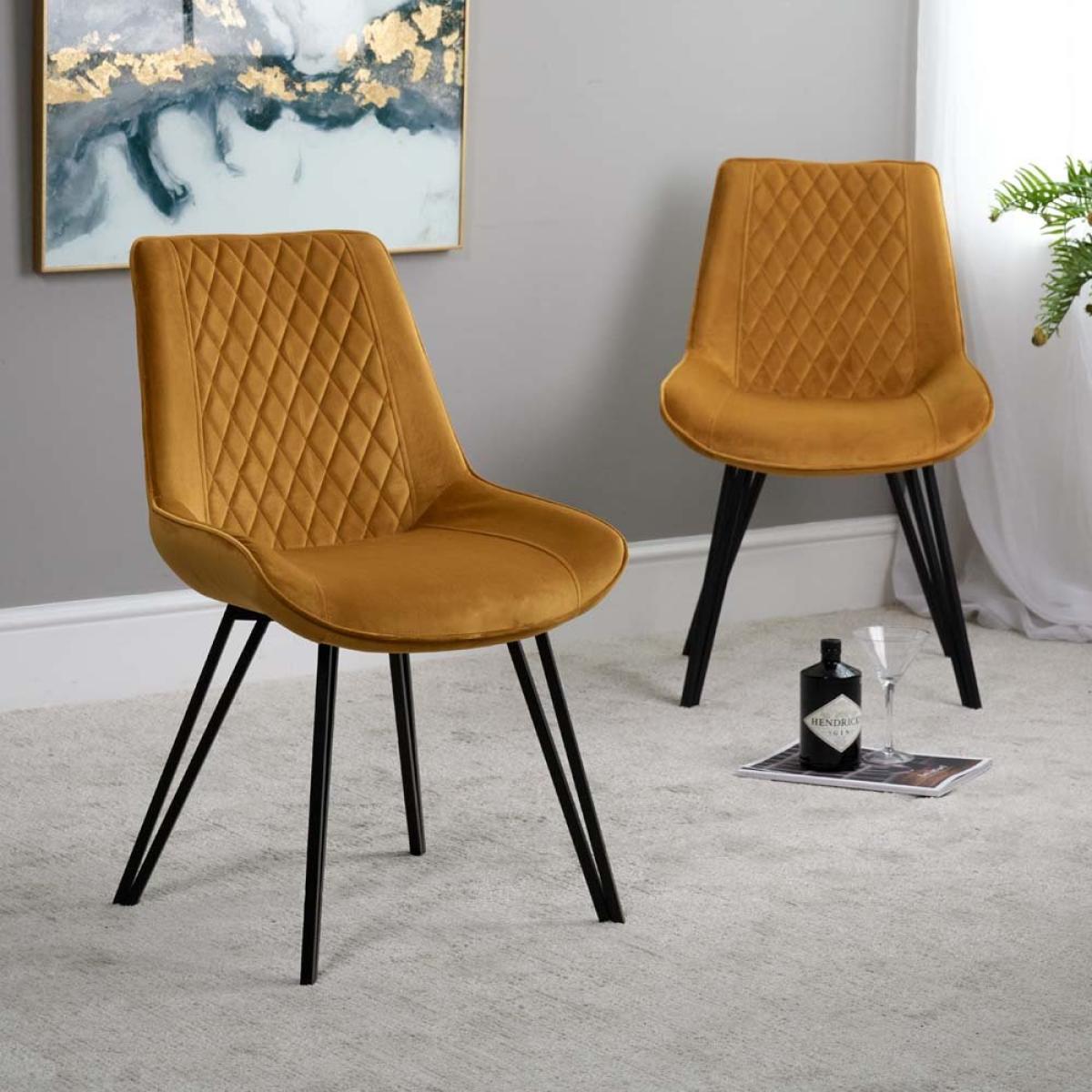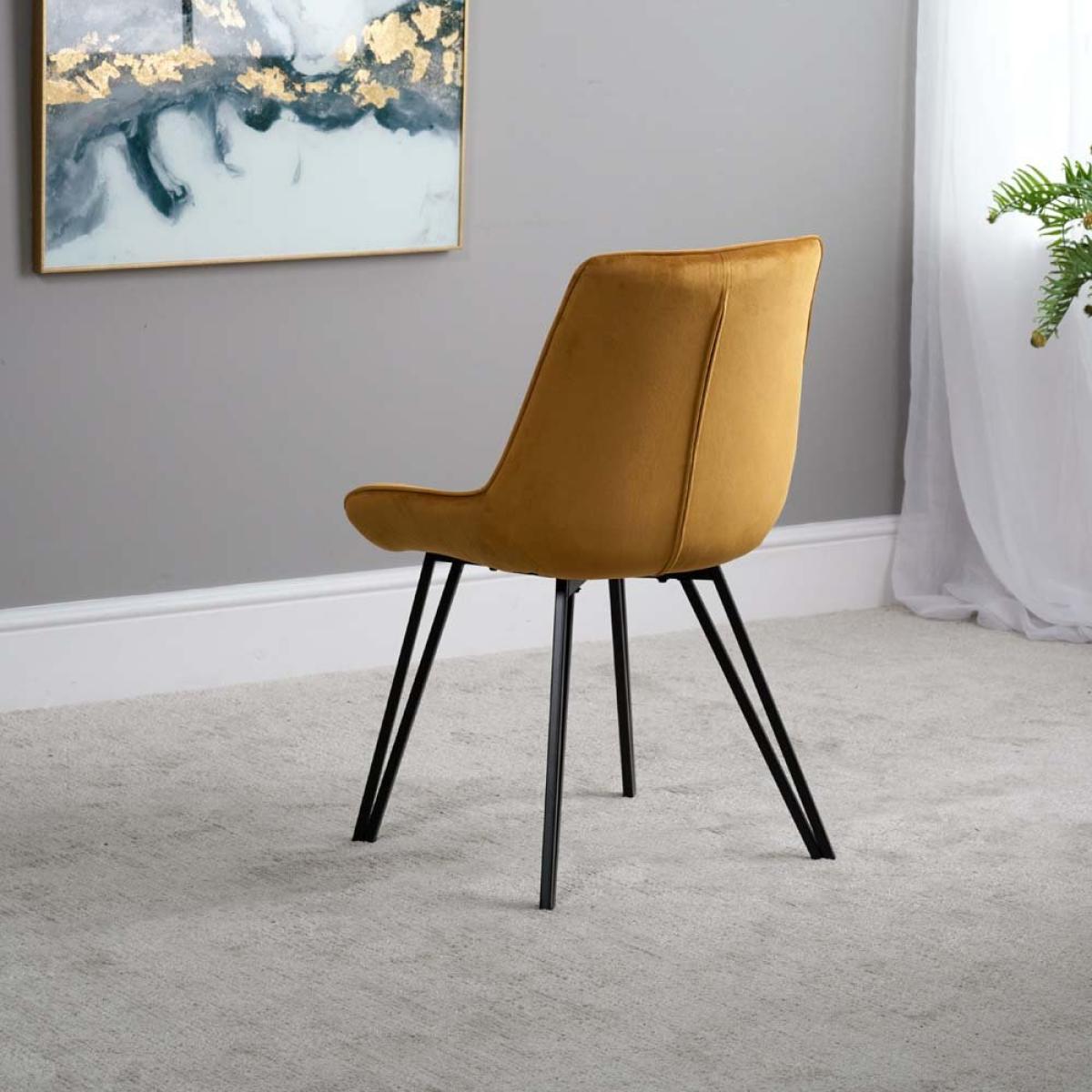 These Chase chairs bring modern luxury to the everyday dining room. With soft velvet upholstery, a slightly bucketed seat and piping details, practicality and style combine to make the ideal versatile chair for any space in your home. Its gold fabric and industrial black powder coated metal legs help to maintain a contemporary aesthetic. Sold as a pair, these stunning dining chairs are also available in four other colour tones: light blue, light grey, teal and green.