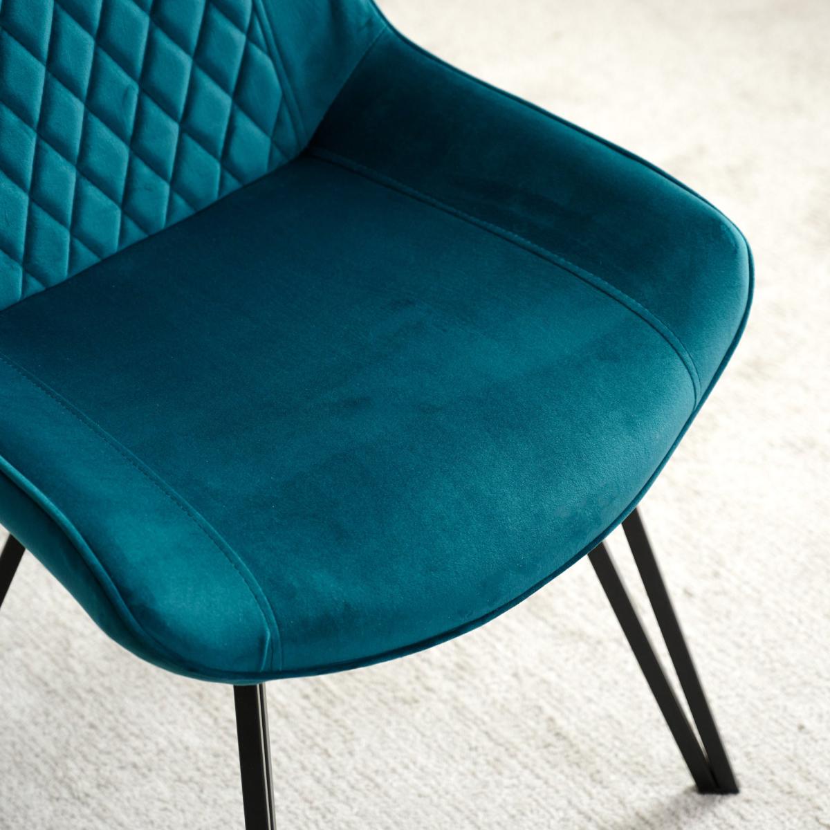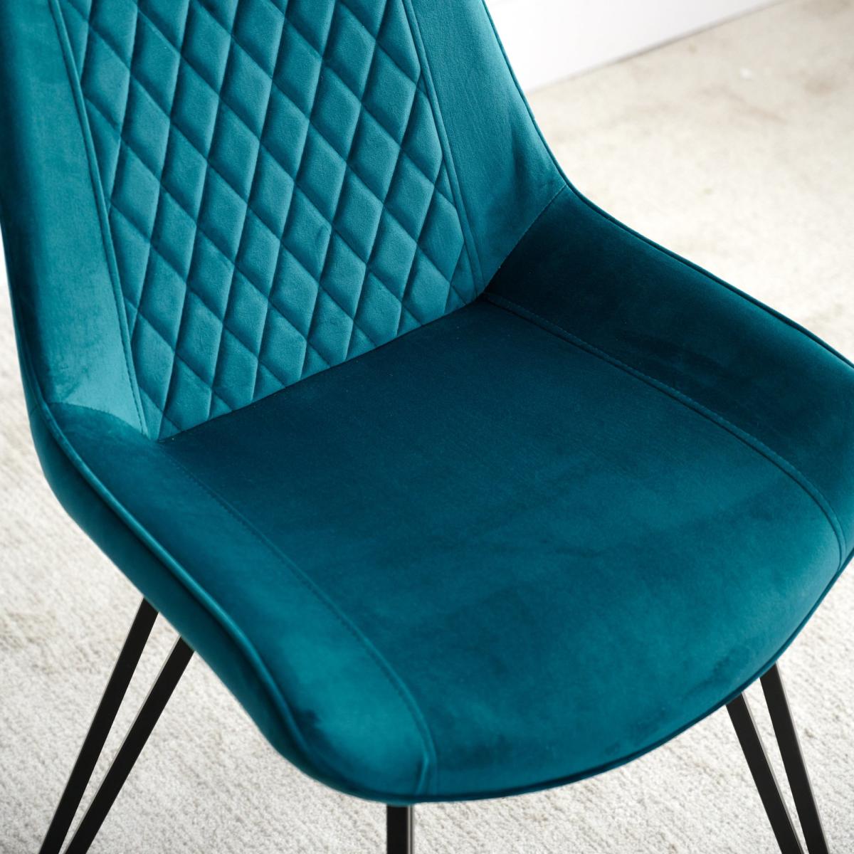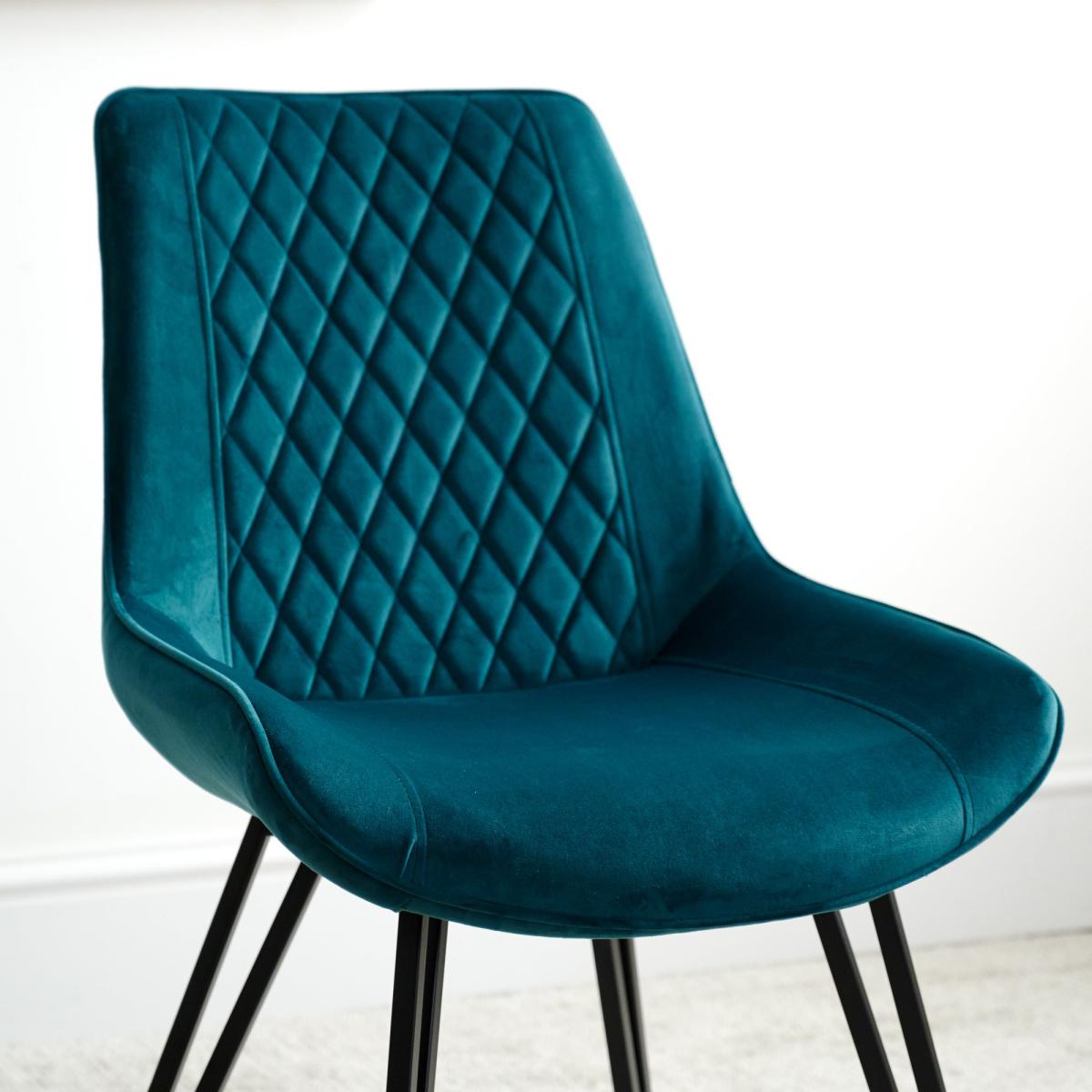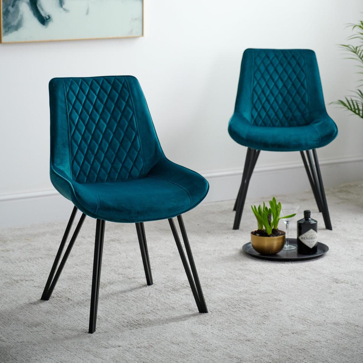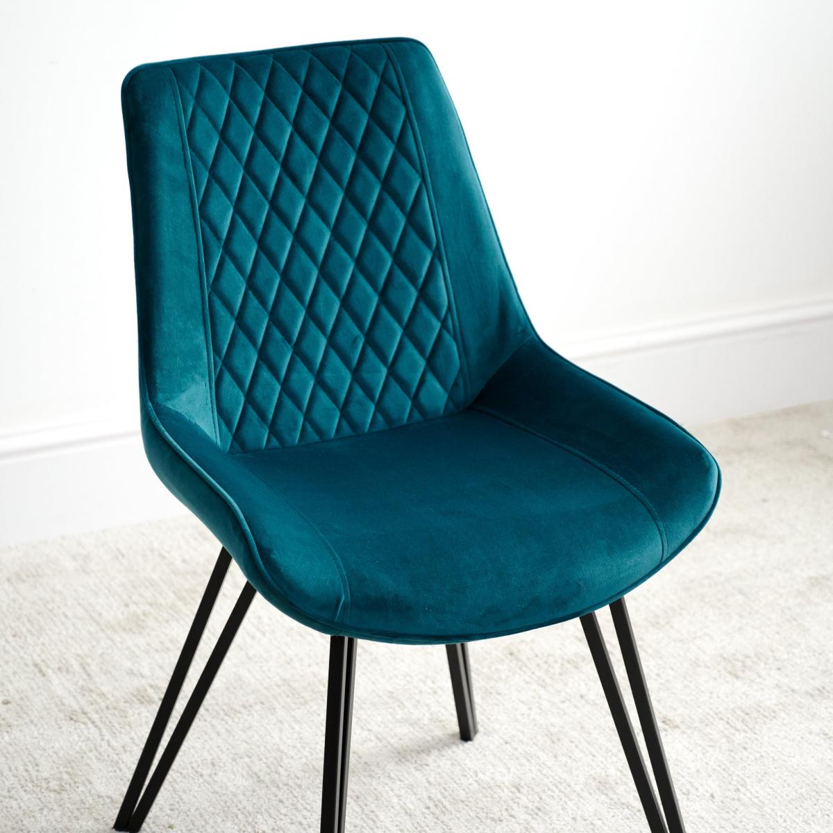 These Chase dining chairs bring style to dining. Featuring a slightly bucketed seat with quilted teal velvet upholstery, this chair is both comfortable and versatile and will bring a luxuriously modern aesthetic to any room in the house. The supportive black powder coated metal legs add to their practicality for an industrial flair. Sold as a pair, the Chase dining chair is also available in four other colour tones: light blue, light grey, gold, and green.