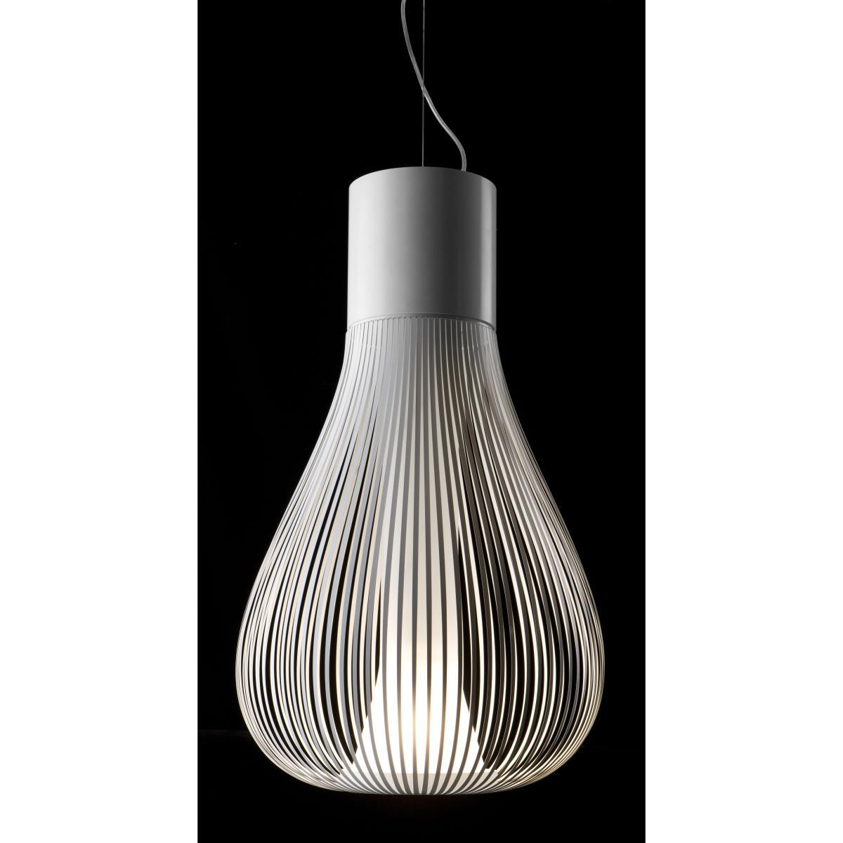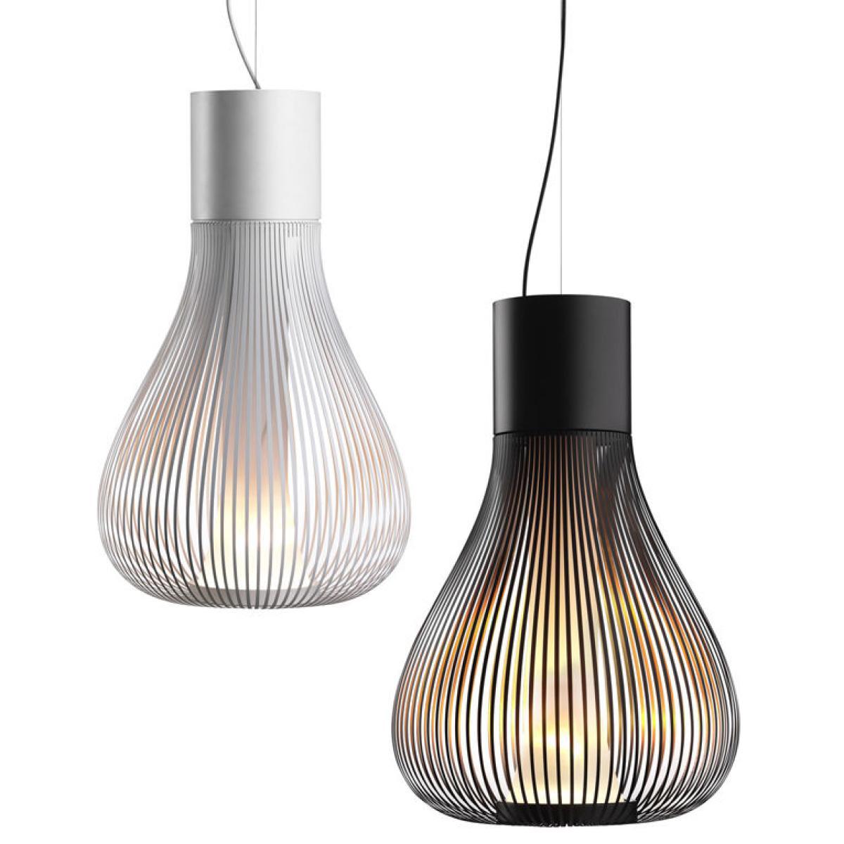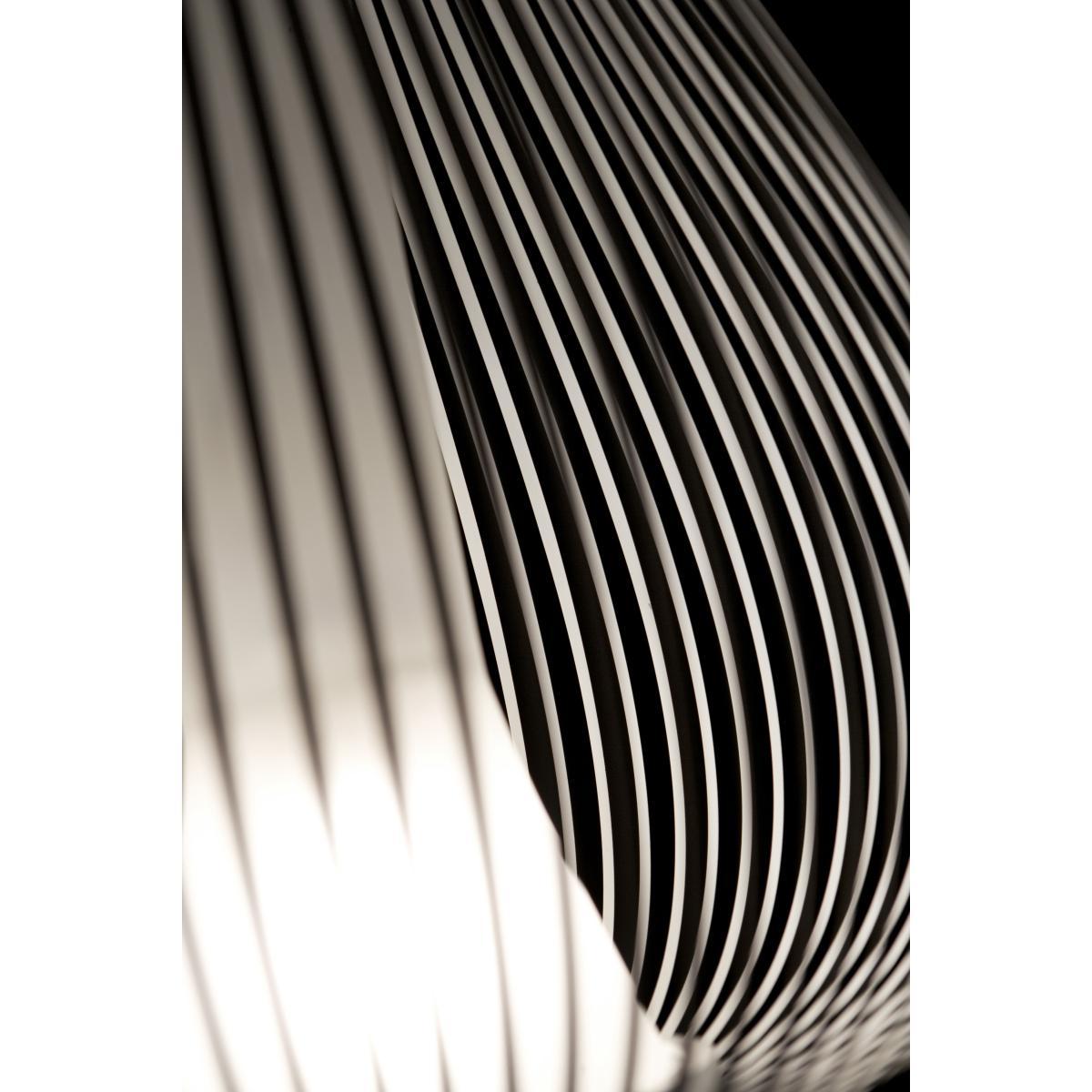Table and suspension light with diffused light emission. Chemically photo-etched stainless steel body and borosilicate diffuser. Liquid paint protection. Die-cast aluminum base, 30% fiberglass-reinforced polyamide ceiling rose attached to a pressed and galvanized steel ceiling fixture. In this version the light emission can be adjusted by means of a mechanical movement that opens the louvers, thereby varying the shape of the luminaire. Steel suspension cable, FEP/PVC power cord of the same color as the luminaire.