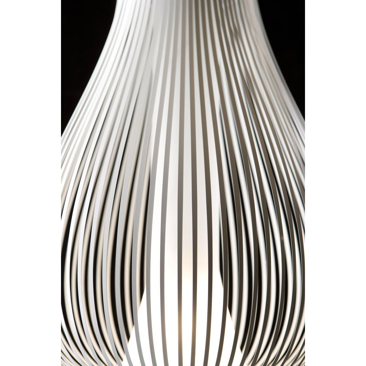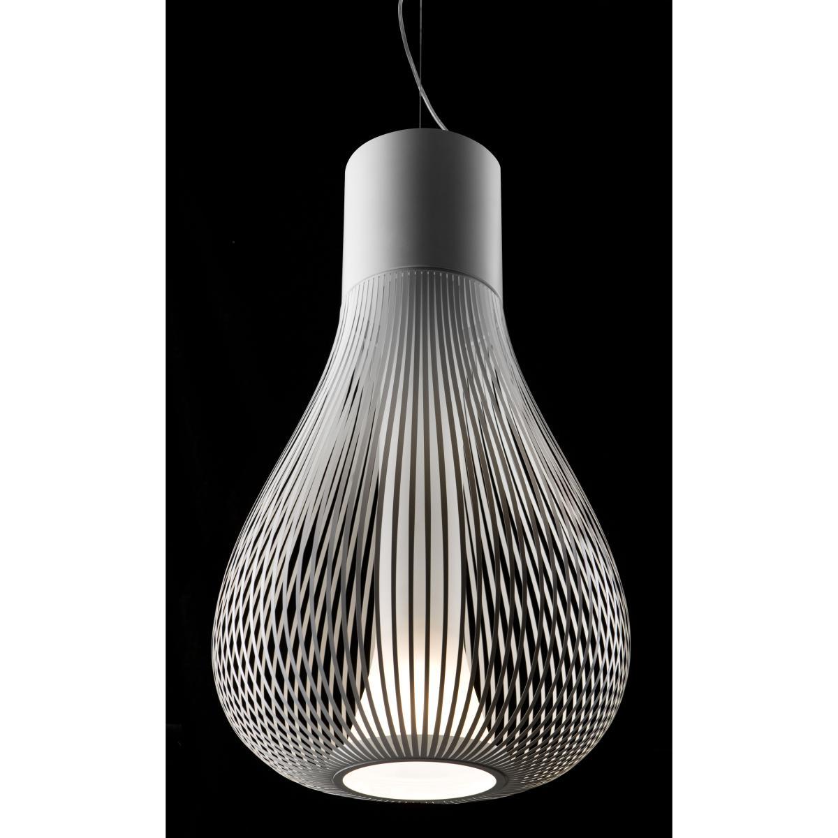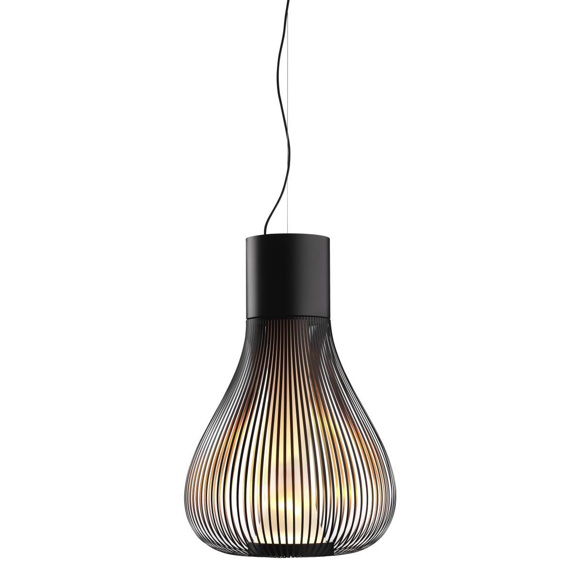 Table and suspension light with diffused light emission. Chemically photo-etched stainless steel body and borosilicate diffuser. Liquid paint protection. Die-cast aluminum base, 30% fiberglass-reinforced polyamide ceiling rose attached to a pressed and galvanized steel ceiling fixture. In this version the light emission can be adjusted by means of a mechanical movement that opens the louvers, thereby varying the shape of the luminaire. Steel suspension cable, FEP/PVC power cord of the same color as the luminaire.