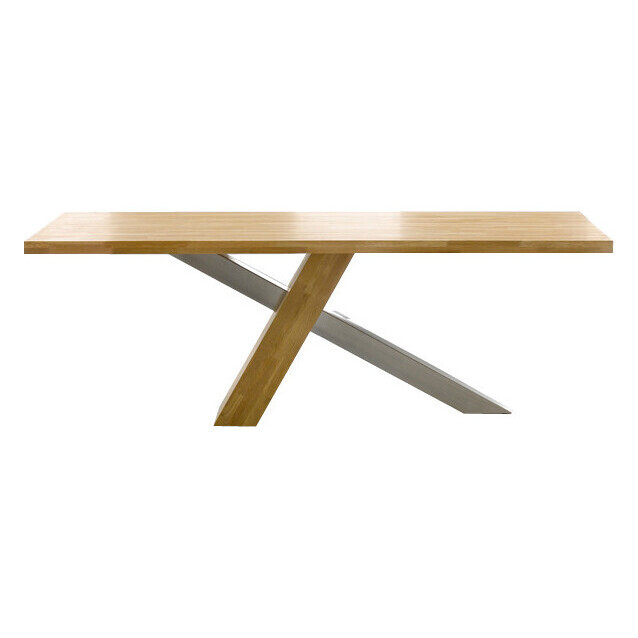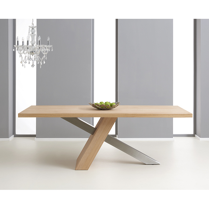 Sophisticated and discerningly different, the Chateau 180cm Oak and Metal Dining Table is avant-garde design at its finest. Comfortably seating up to 6 diners, the Chateau table is practical and versatile enough to accommodate any dining occasion. Featuring a thick, discreetly finger jointed oak and veneer table top with an oiled finish, the Chateau Dining Table is as durable as it is gorgeously contemporary. The most distinguishing feature of the Chateau is its slanted legs. One made from oak and veneer, the other brushed metal, the legs crossover to provide incredibly balanced support to the table top. Further Items in the Collection: Chateau 195cm Oak and Metal Dining Table, Chateau 225cm Oak and Metal Dining Table, Chateau Oak and Metal TV Unit and Chateau Oak and Metal Sideboard.