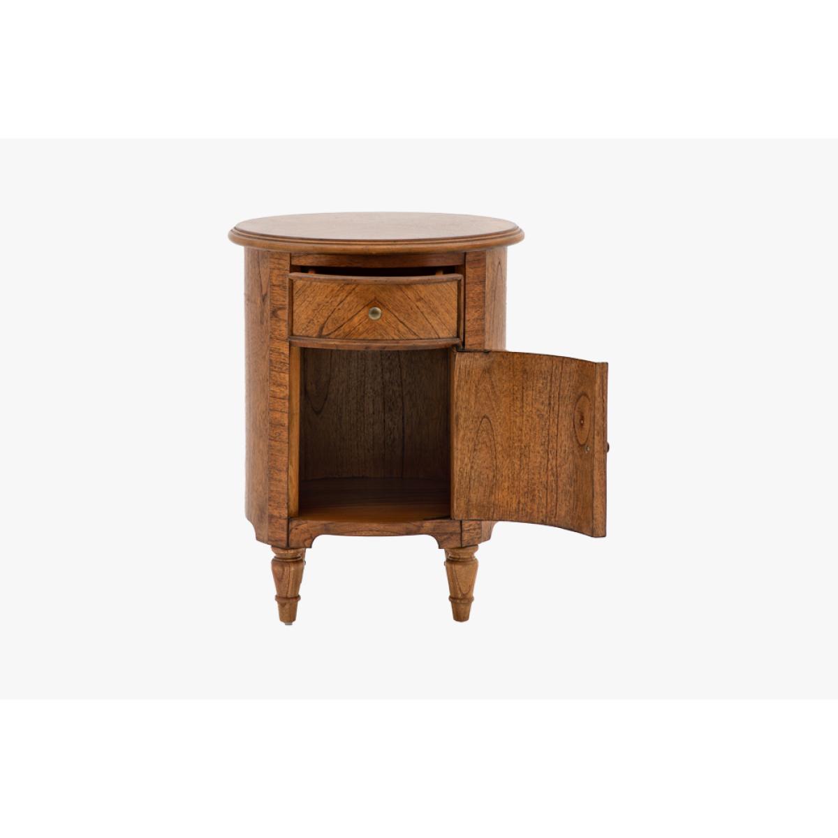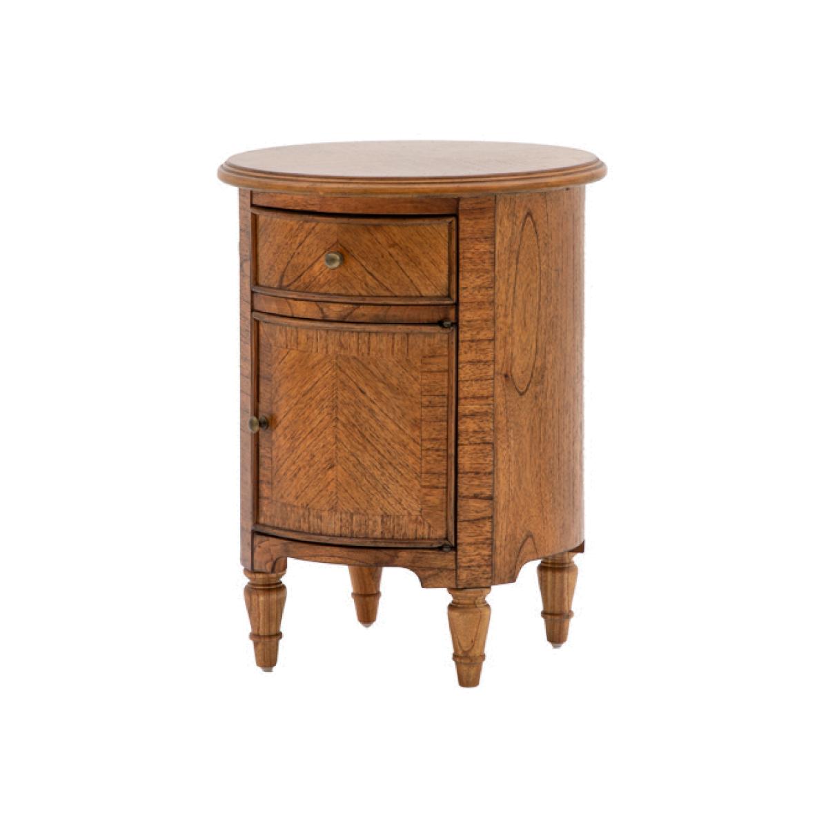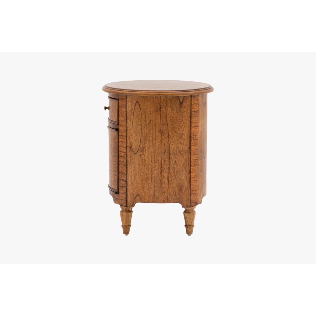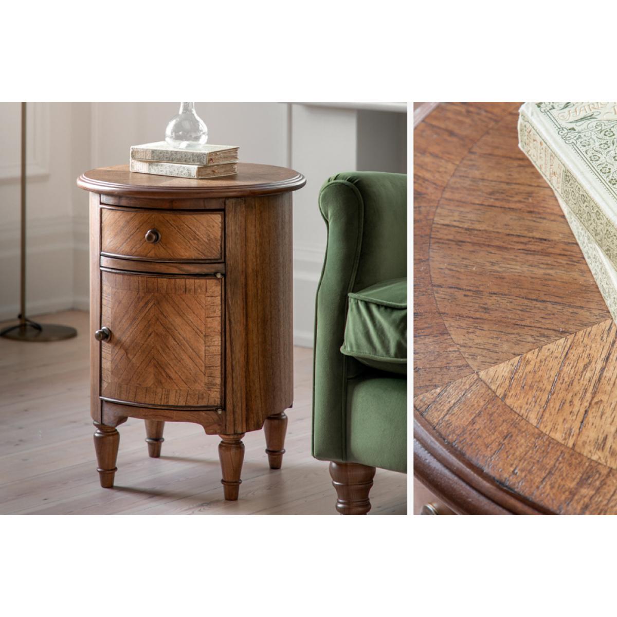 Add a refined finishing touch to your space with this elegant little side table. Perfect for the bedroom or living room alike the rich brown Mindy wood, bronze beehive handles and elegant turned feet adds a touch of class wherever its placed. The perfect balance of sophisticated style and practicality the Chateau Drum Side Table has a single drawer and small cupboard for fantastic additional storage.