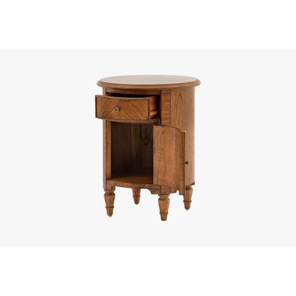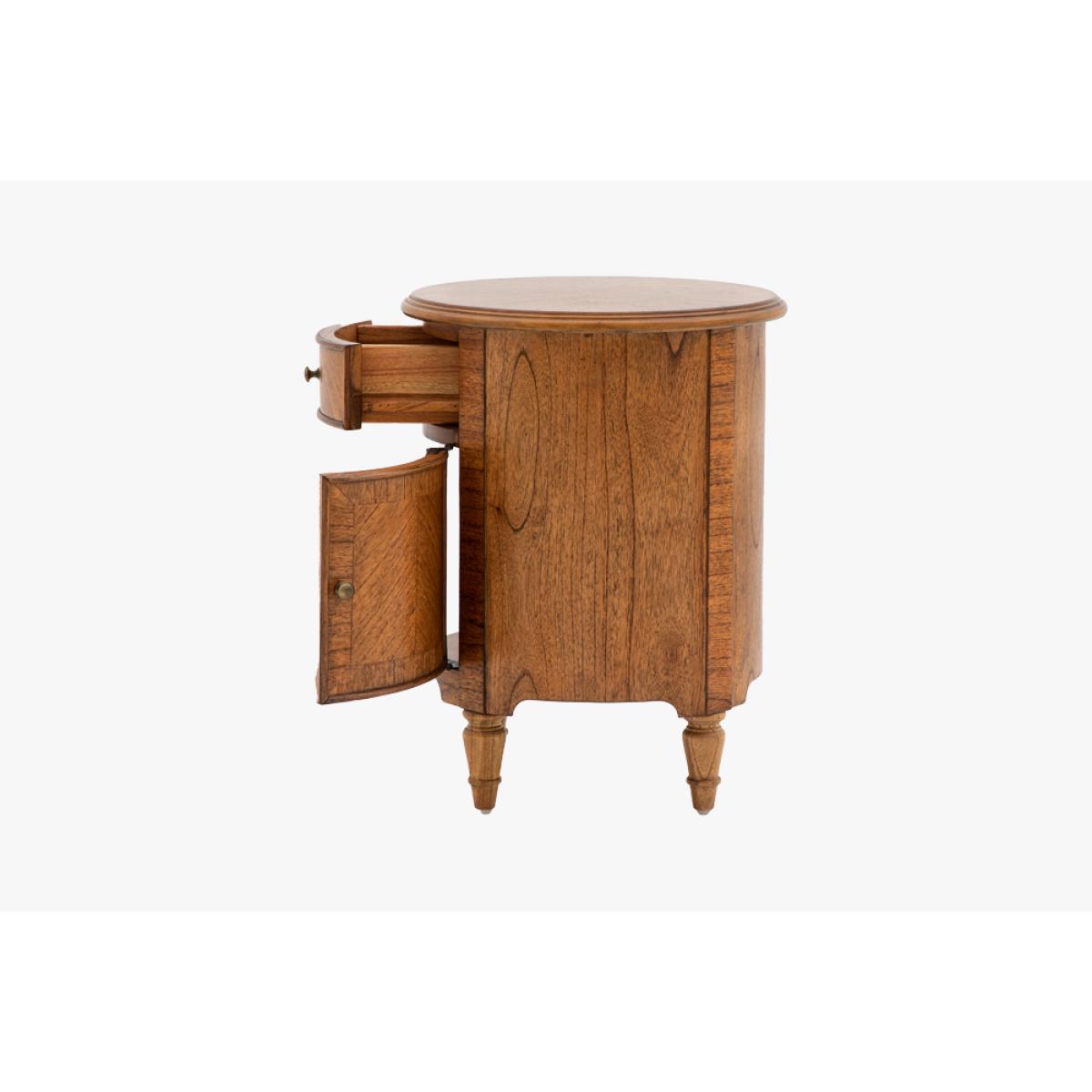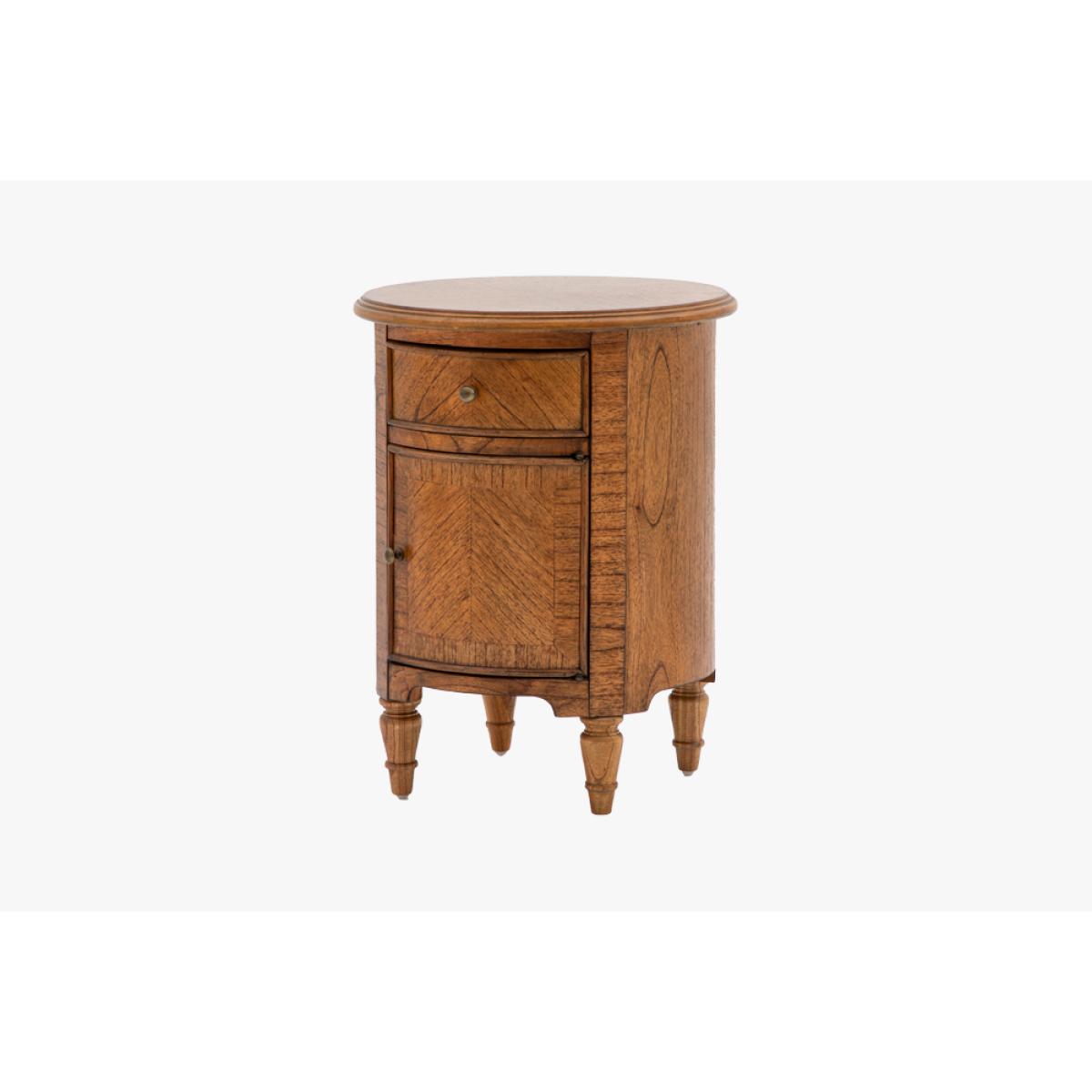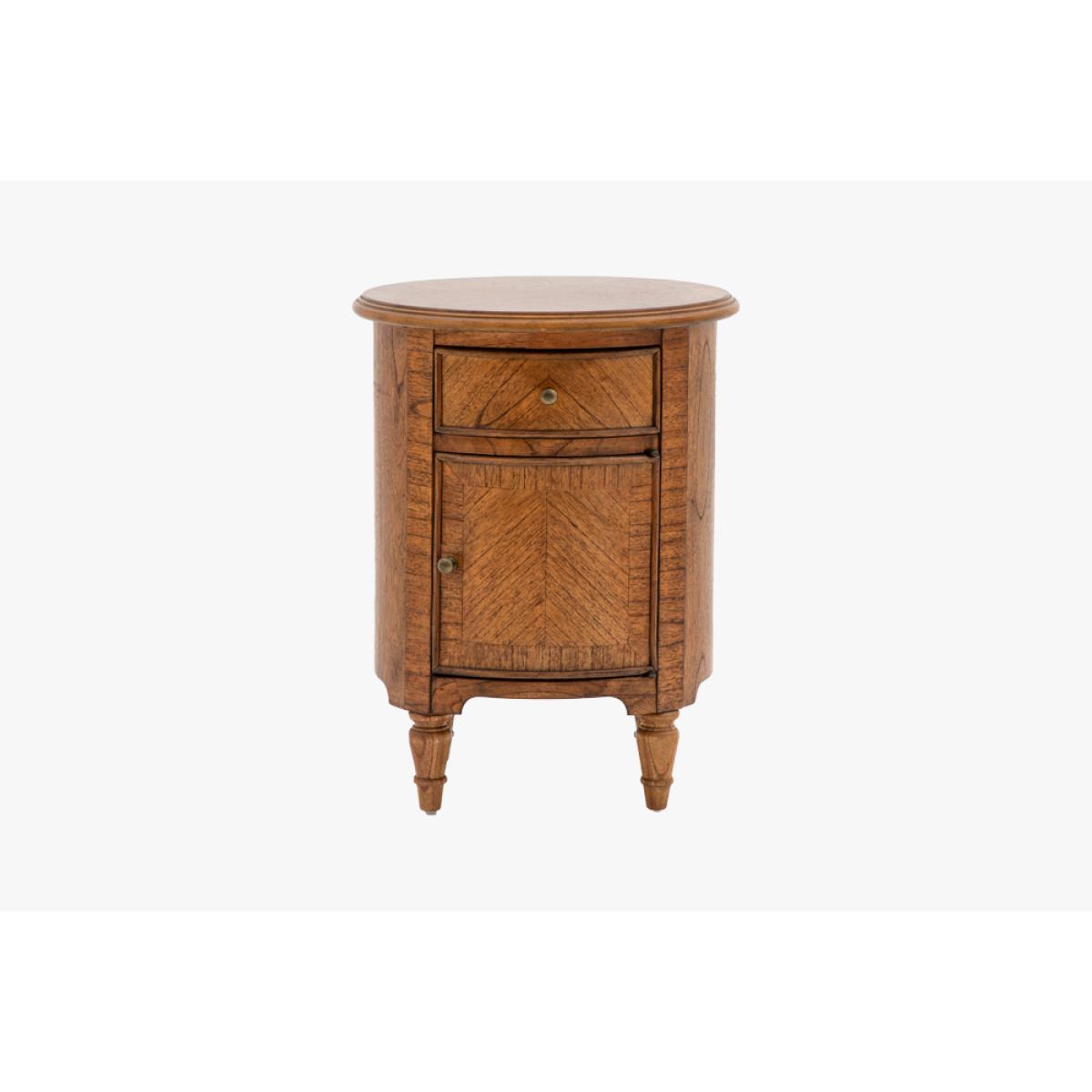 Add a refined finishing touch to your space with this elegant little side table. Perfect for the bedroom or living room alike the rich brown Mindy wood, bronze beehive handles and elegant turned feet adds a touch of class wherever its placed. The perfect balance of sophisticated style and practicality the Chateau Drum Side Table has a single drawer and small cupboard for fantastic additional storage.