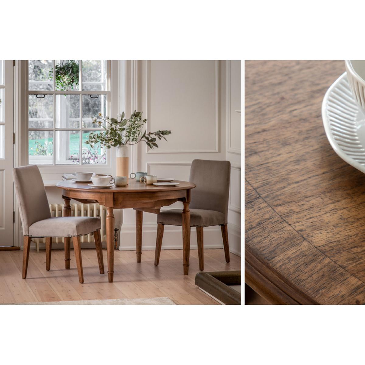 Elegant dining doesn't always require a huge amount of space, perfect for a smaller room the Chateau table doesn't skimp on sophisticated style. The folding butterfly centre leaves easily extend taking the table from 4 to 6 place settings, giving you an efficient use of space. Distinctive rich brown Mindy wood with a beautiful quartered pattern and 4 elegantly turned legs add the finishing touch.