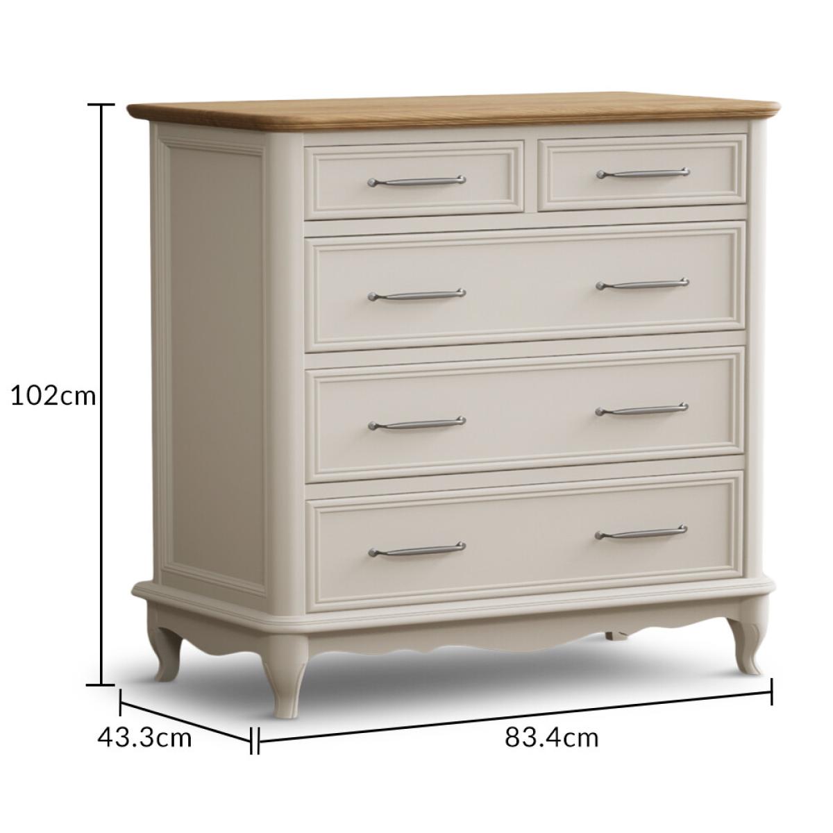 The Chateau Oak and Soft White Painted 2 Over 3 Chest of Drawers is crafted from solid hardwood with a white painted finish, topped with 100% solid oak.
