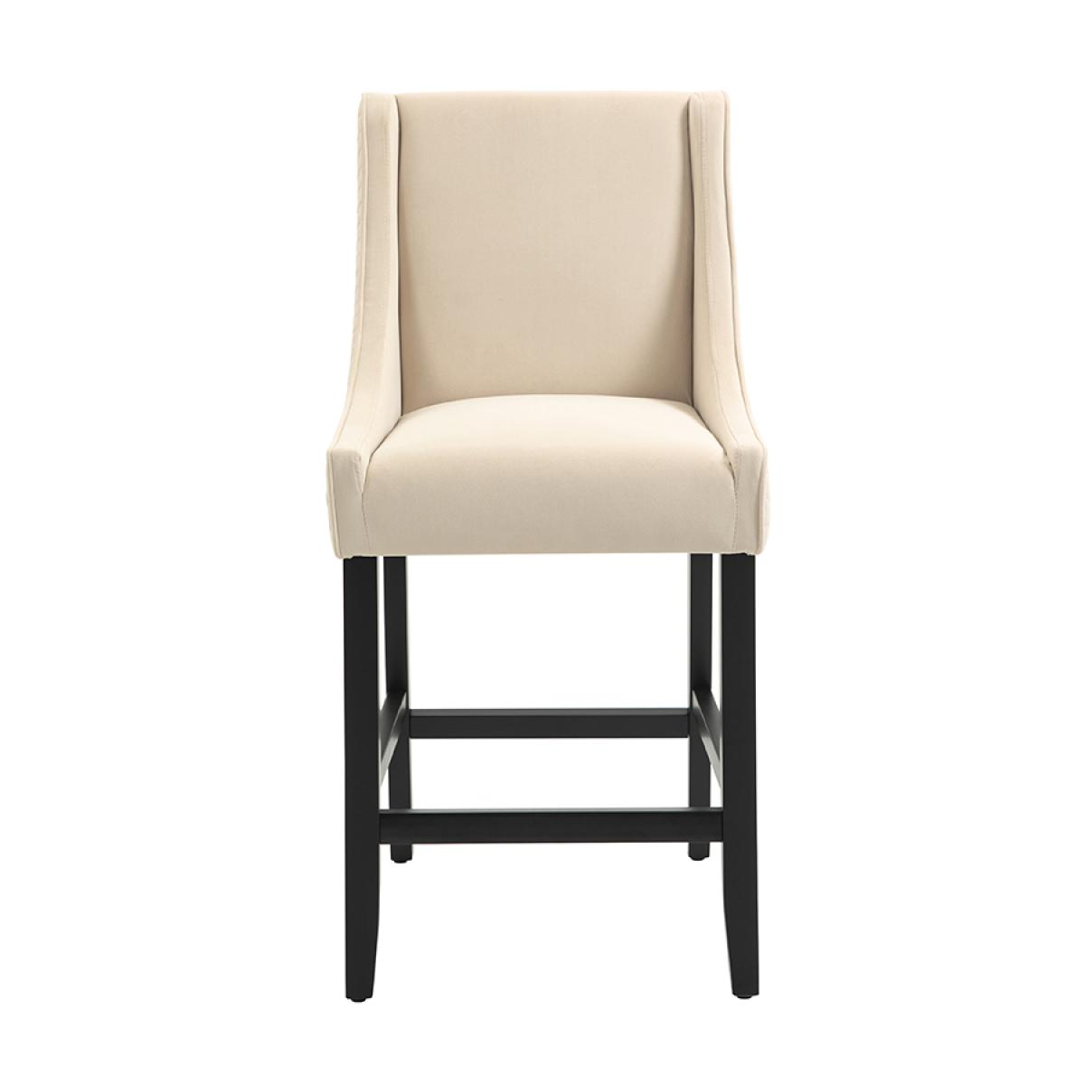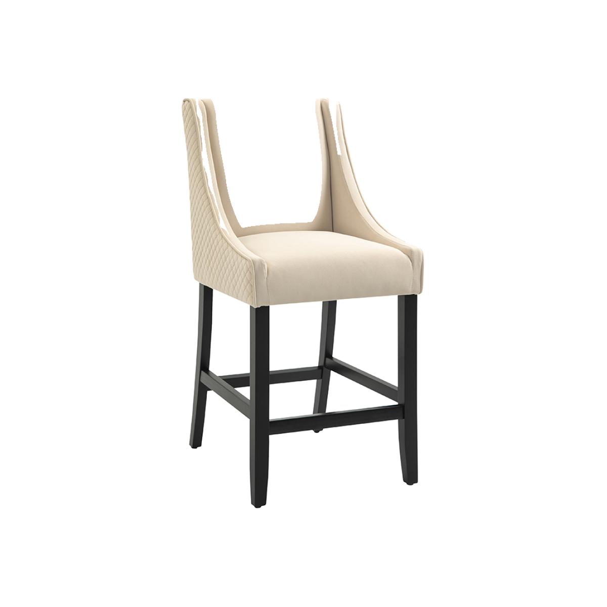 A timeless elegant counter stool. Ideal in height for use at standard breakfast bars. Sprung base with comfortable deep foam and fibre filling. Quilted patterned fabric to the back and sides. Velvet upholstery fabric to the seat and backrest. Stained solid ash legs. Simple assembly required, approximately 10 minutes.