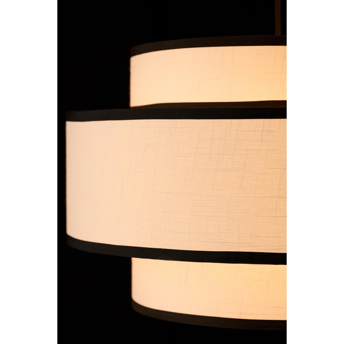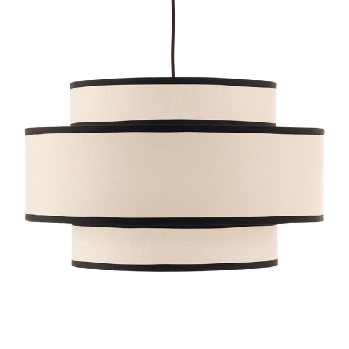 A bold, sculptural ceiling light featuring a smart, layered drum shade. Three offset fabric cylinders are connected by a black metal internal frame, creating a floating, tiered silhouette. Ivory linen-type fabric with black edging tape creates a modern monochrome finish. Black woven cable. Matt black metal ceiling rose and bulb holder. Supplied complete with E27 40W globe bulb. Height adjustable prior to installation.