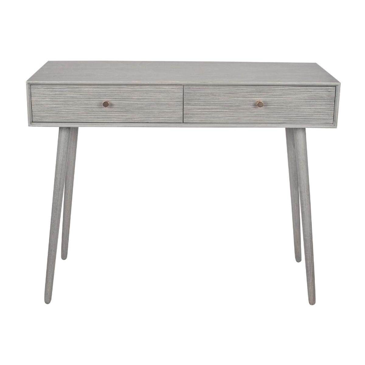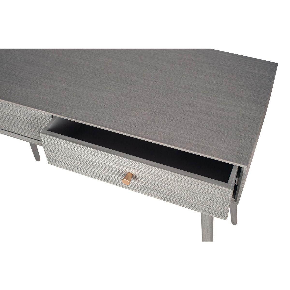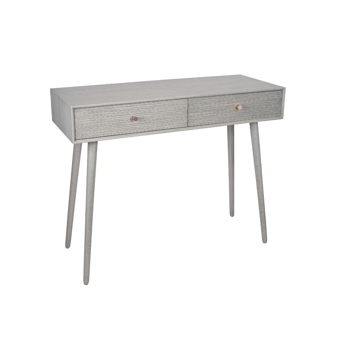 Grey Pinewood Console Table  Update your home with this stunning console drawer set. Finished with grey pinewood housing 2 drawers, this beautiful design is ideal for bedroom storage. Pair it with the rest of the Chaya range for a unique and interesting theme throughout the room. Grey Pinewood Console Table  Update your home with this stunning console drawer set. Finished with grey pinewood housing 2 drawers, this beautiful design is ideal for bedroom storage. Pair it with the rest of the Chaya range for a unique and interesting theme throughout the room.