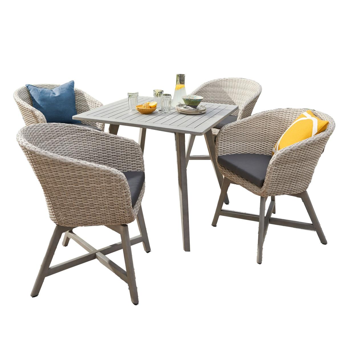 Get ready to enjoy al fresco dining with this gorgeous set, featuring curvy woven chairs in a light grey weave and a grey wash acacia table. The chairs are made with a double half-round weave seat, combining synthetic rattan fibre with an aluminium frame and an acacia hardwood base frame with slim tapering legs. And for maximum comfort, they come with well-padded grey polyester seat pads. Not only is the Chedworth Dining Set highly durable, but it's also low maintenance, making it the perfect addition to any garden or patio.
