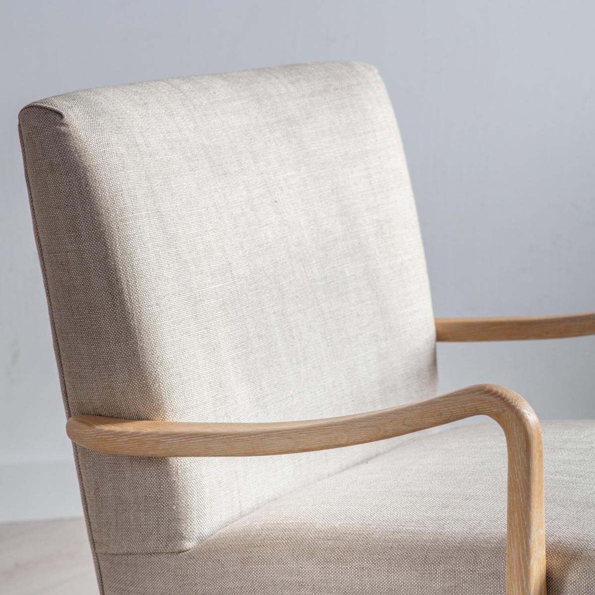 All about me An ultra stylish chair, perfect for your contemporary living space. Upholstered in neutral fabric to suit most interiors and featuring beautiful curved arms creating stunning softened lines. Need to know Dimensions:W66 x D75 x H80 cm Colour: Natural Finish: Upholstered Material: Solid Oak, Linen, Foam, Plywood Assembly required: No