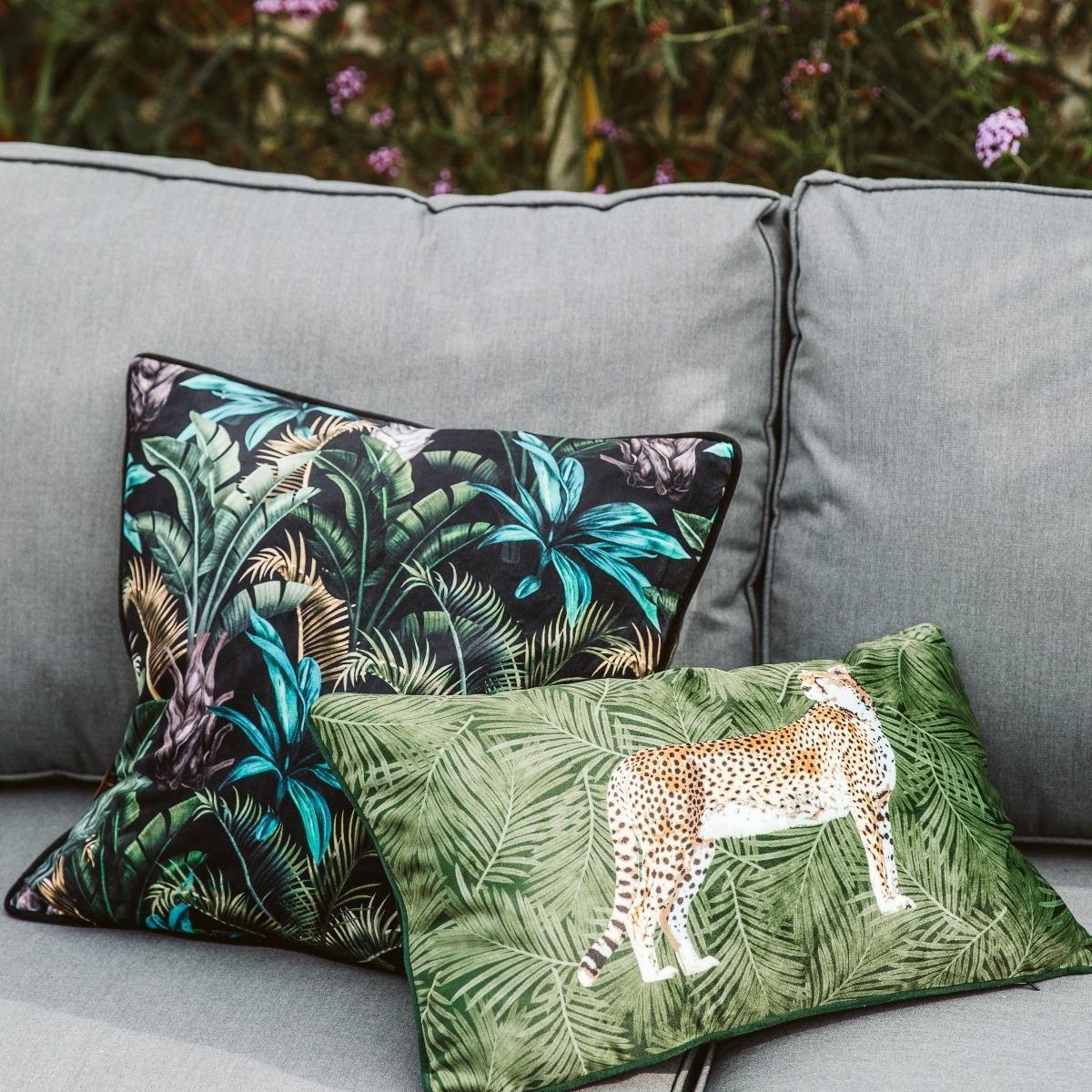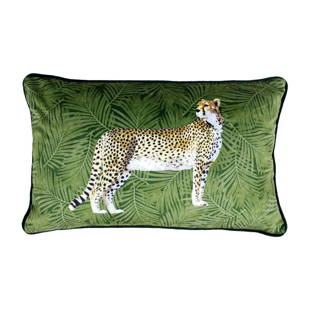 Design. A vibrant and eye-catching accessory for your bedroom or lounge, the stunning Cheetah Cushion features a soft polyester velvet cover with a rich botanical background and plain dark green reverse. Emblazoned on the front is a beautifully realistic cheetah, which will bring a new lease of life to any sofa, chair or bed. Plump feather filling ensures this rectangle velvet cushion feels just as good as it looks, while bringing a taste of tropical jungle style to the home.