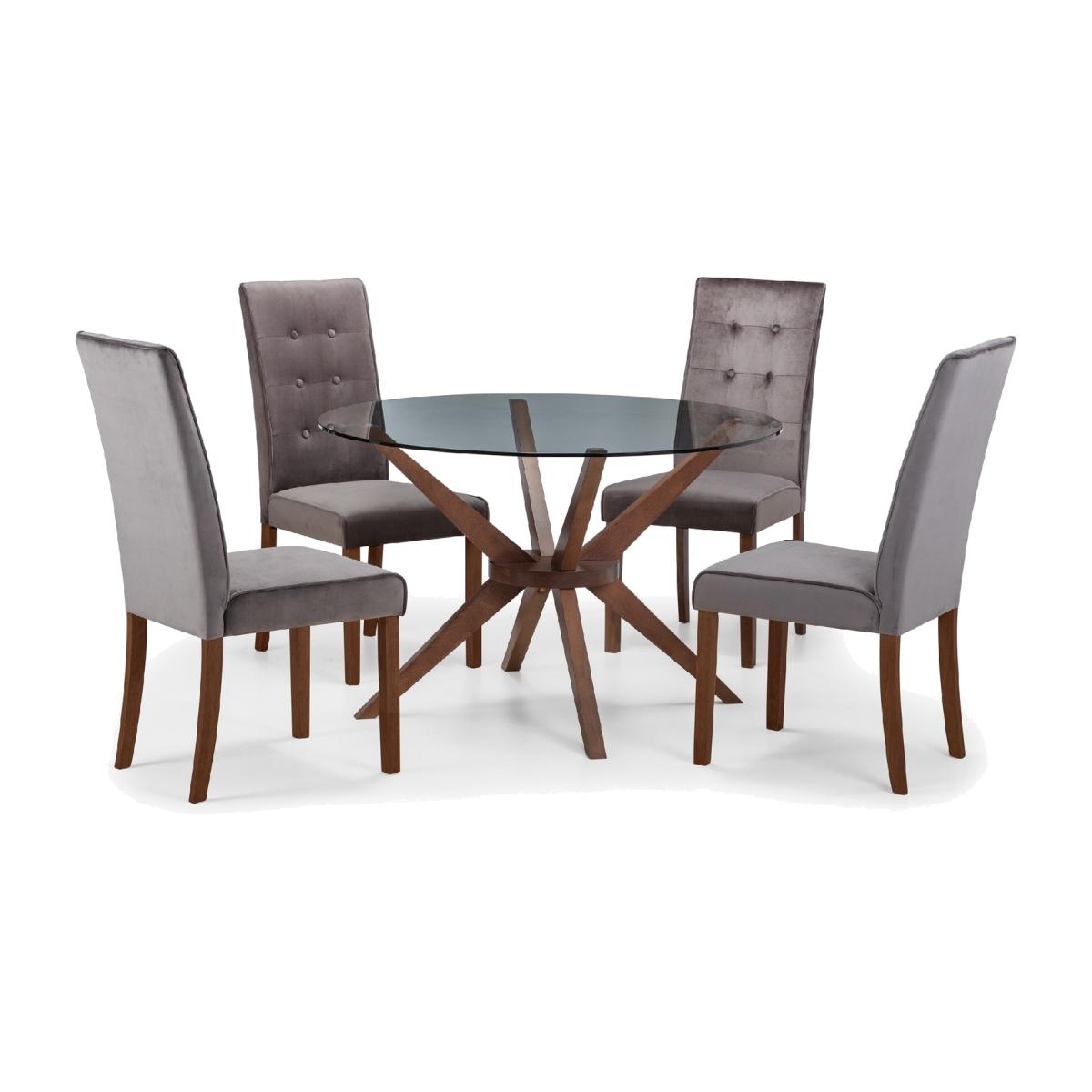 A truly stunning 120cm circular dining table featuring an elegantly styled solid wood base in walnut finish, topped with a substantial tempered glass top to create an exquisite contemporary piece that will take pride of place in any home. Paired with Madrid Chairs.