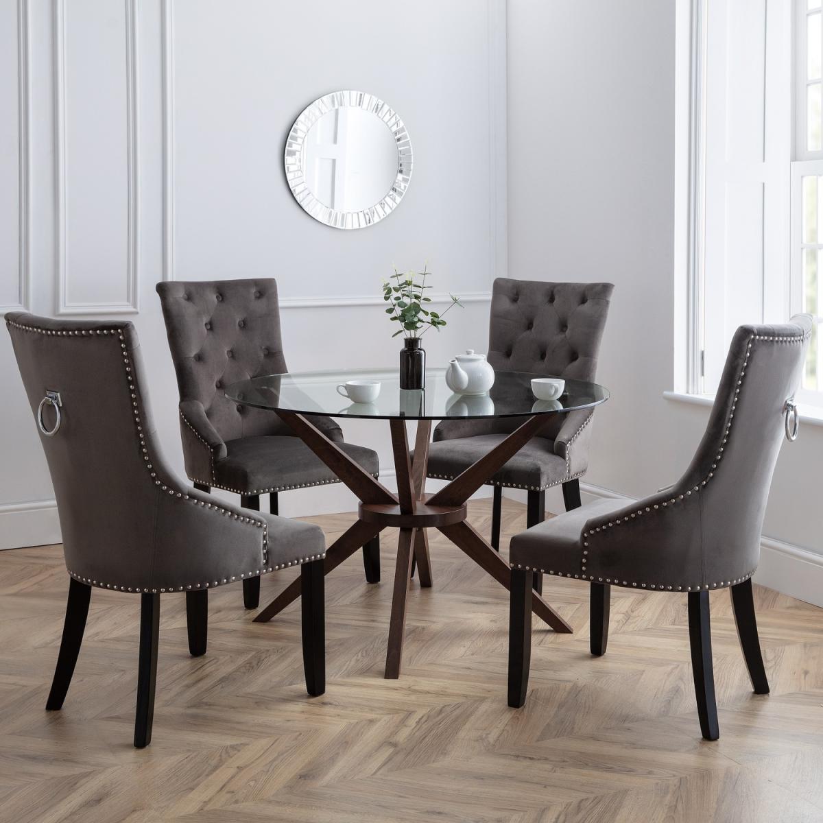 A truly stunning 120cm circular dining table featuring an elegantly styled solid wood base in walnut finish, topped with a substantial tempered glass top to create an exquisite contemporary piece that will take pride of place in any home. Paired with Veneto Chairs.