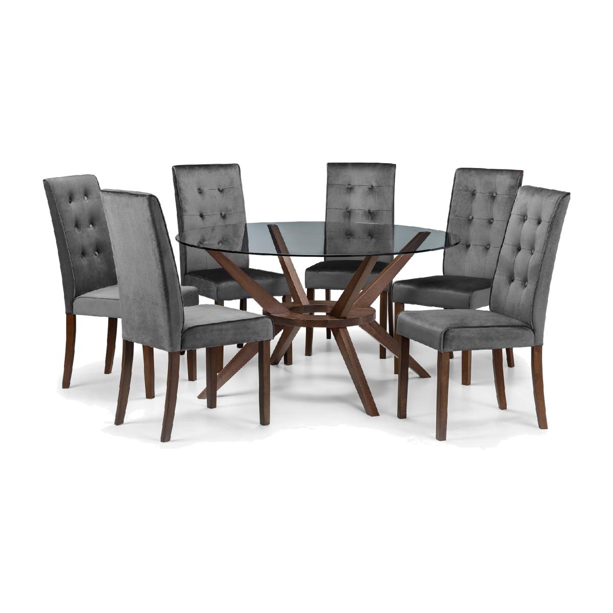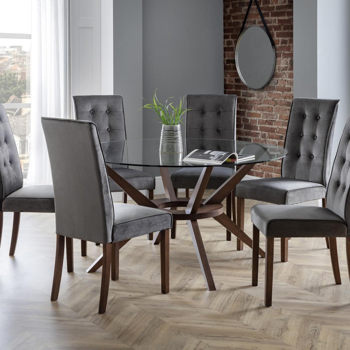 A truly stunning 140cm circular dining table featuring an elegantly styled solid wood base in walnut finish, topped with a substantial tempered glass top to create an exquisite contemporary piece that will take pride of place in any home. Paired with Madrid Chairs.