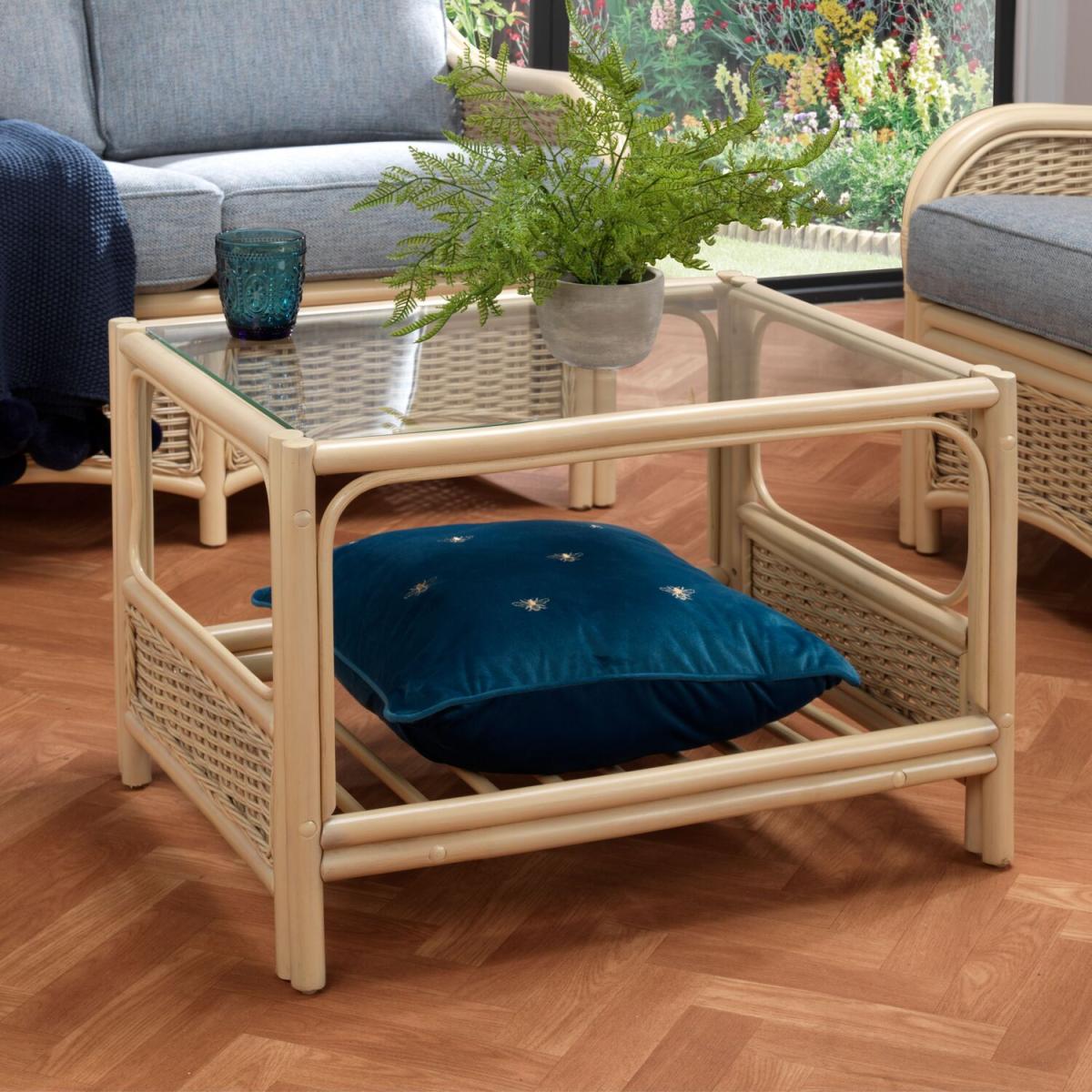 I really like how this cane coffee table brings a light, airy feel without looking too fussy. The natural-wash frame and glass top make it versatile for coastal, Scandi or relaxed boho schemes, and the lower shelf is ideal for baskets or a neat stack of magazines. To style it, add a small tray with a couple of candles and a low vase of fresh or dried foliage to keep surfaces clear. On the shelf below, use matching rattan or woven baskets to store throws and remotes. Its neutral tone means you can change cushions, rugs or accessories around it without the table ever feeling out of place.