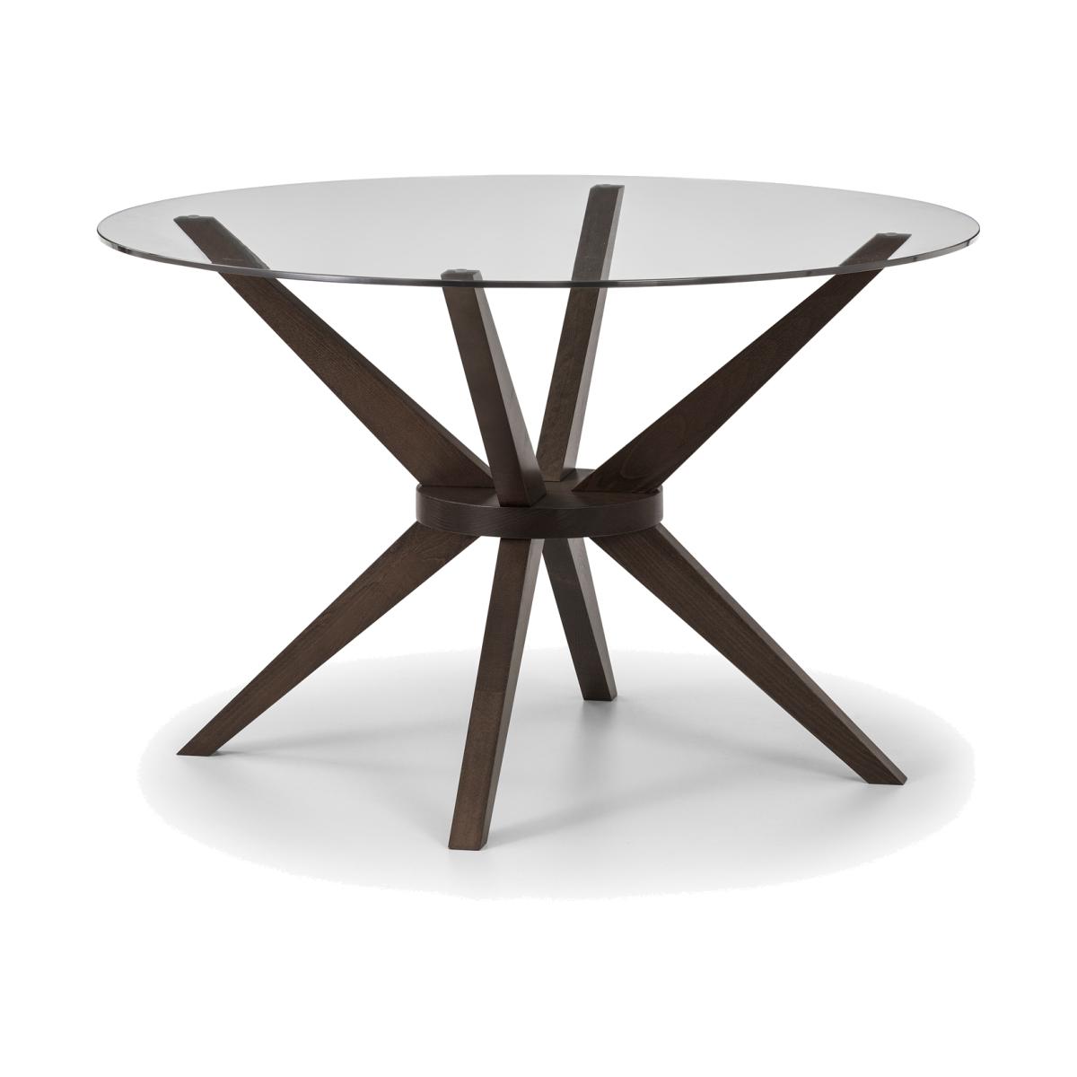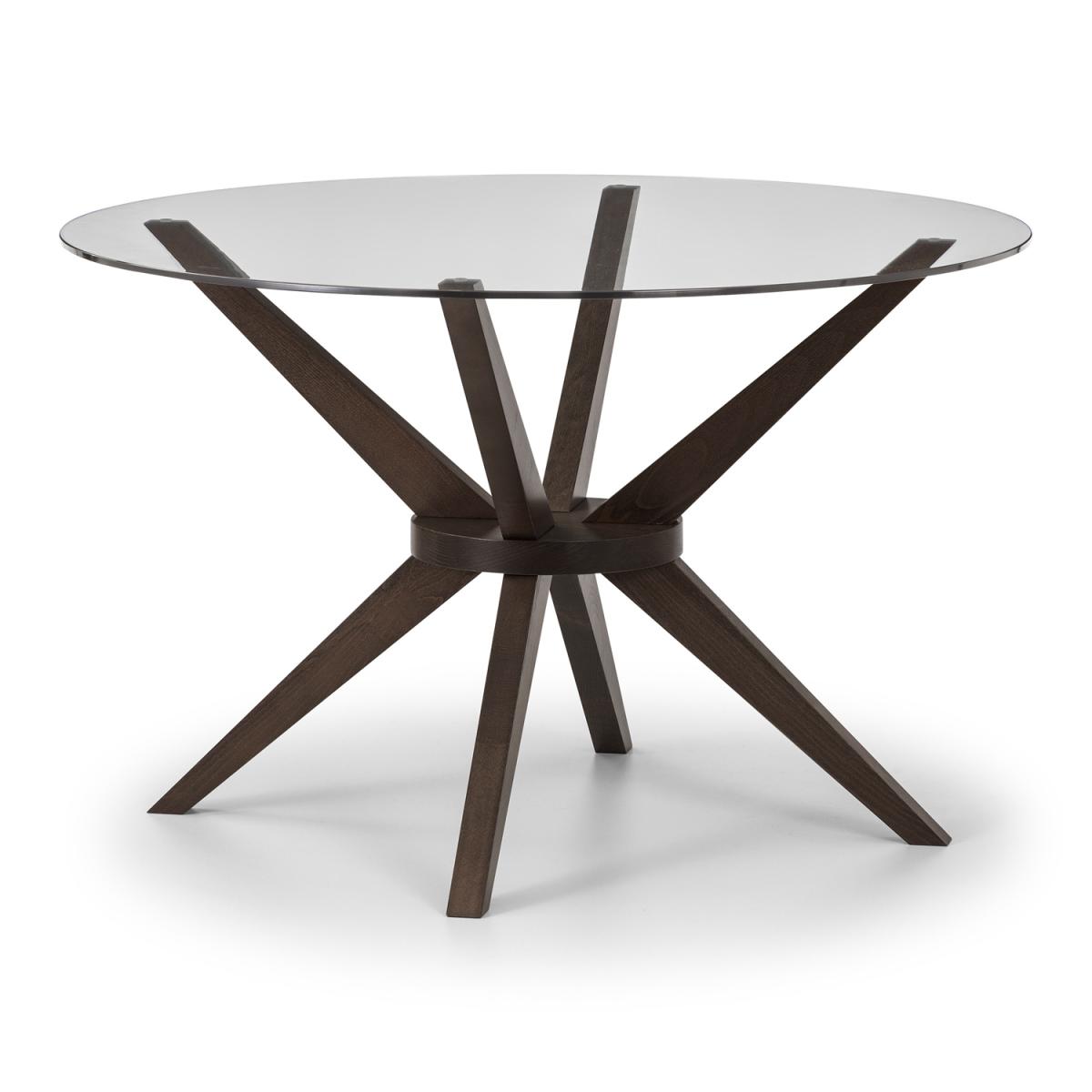 The Chelsea Round Glass Top Table boasts a substantial tempered glass top, desirable walnut-toned accenting, and a spacious surrounding that's perfect for any living area or dining room. A contemporary yet practical piece of furniture, this trendy solid-wood table is sure to take pride of place in any home environment.