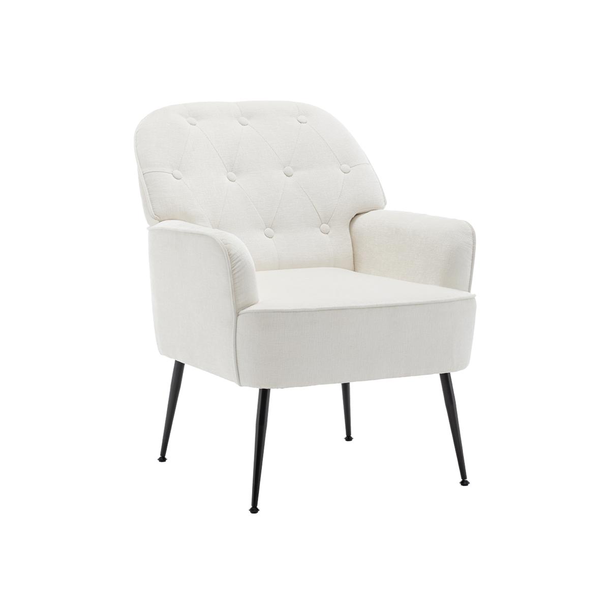 The Livingandhome leisure chair brings modern comfort with minimalist style. Upholstered in soft and skin-friendly chenille fabric, it offers a luxurious feel and lasting comfort. The one-piece backrest and armrests are ergonomically shaped to support your back, waist and arms, helping reduce tiredness from long sitting. Decorative button details on the backrest add a vintage touch to its clean design, showing careful craftsmanship. The sturdy black iron legs ensure strong support and blend well with the overall look, adding quiet elegance to any modern room.