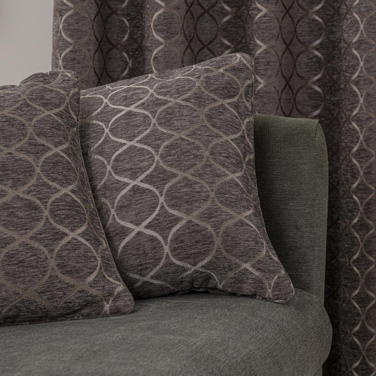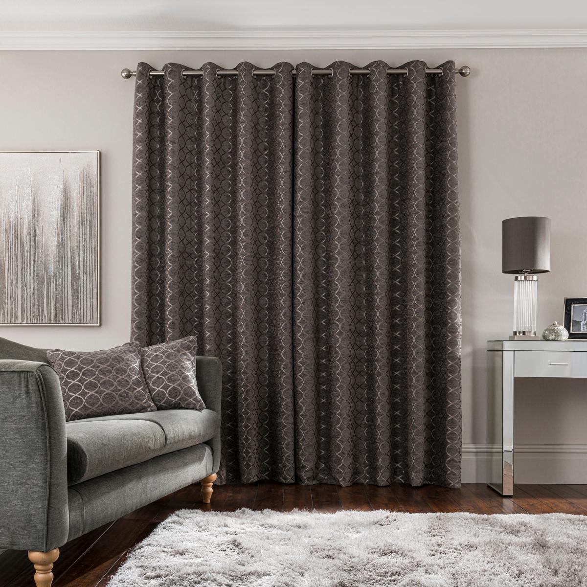 Crafted from stunning jacquard chenille fabric for a beautifully soft texture, these elegant charcoal curtains are decorated with a stylish ogee pattern and are perfect for bringing a luxurious finish to any room. These curtains are fully lined to improve insulation while increasing privacy and are designed with a modern eyelet header for easy hanging and a gorgeous drape. Available in a selection of widths and drops, these curtains are ideal for lending an opulent edge to your décor. A coordinating cushion is available to purchase separately. Please note: these curtains are sold as a pair. Professional cleaning in Hydrocarbon or equivalent reccomended.