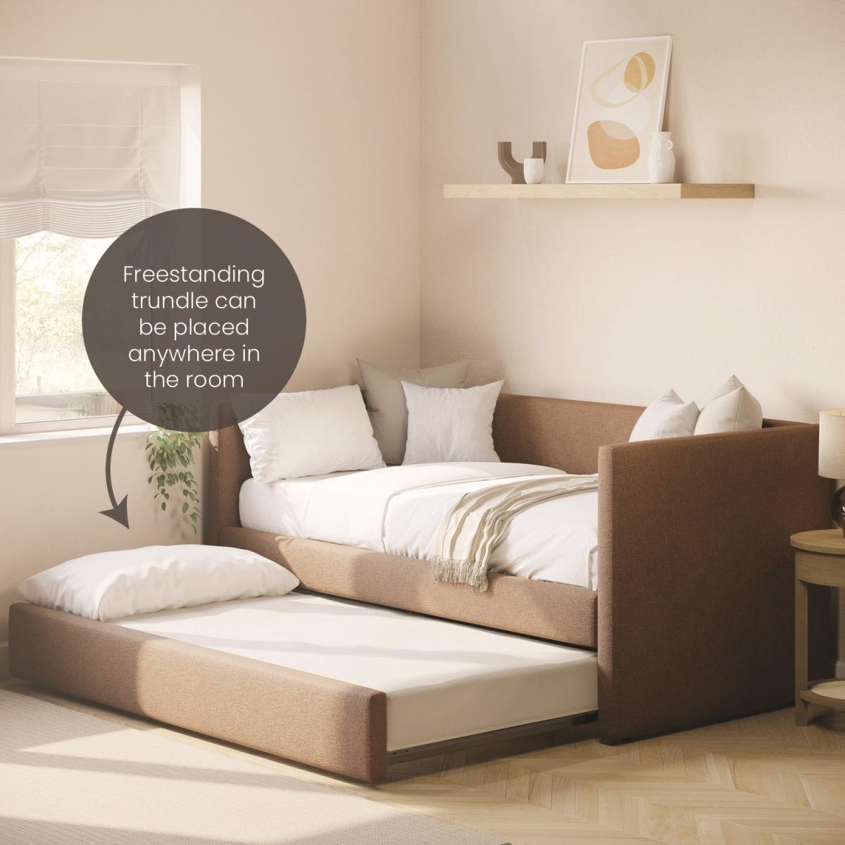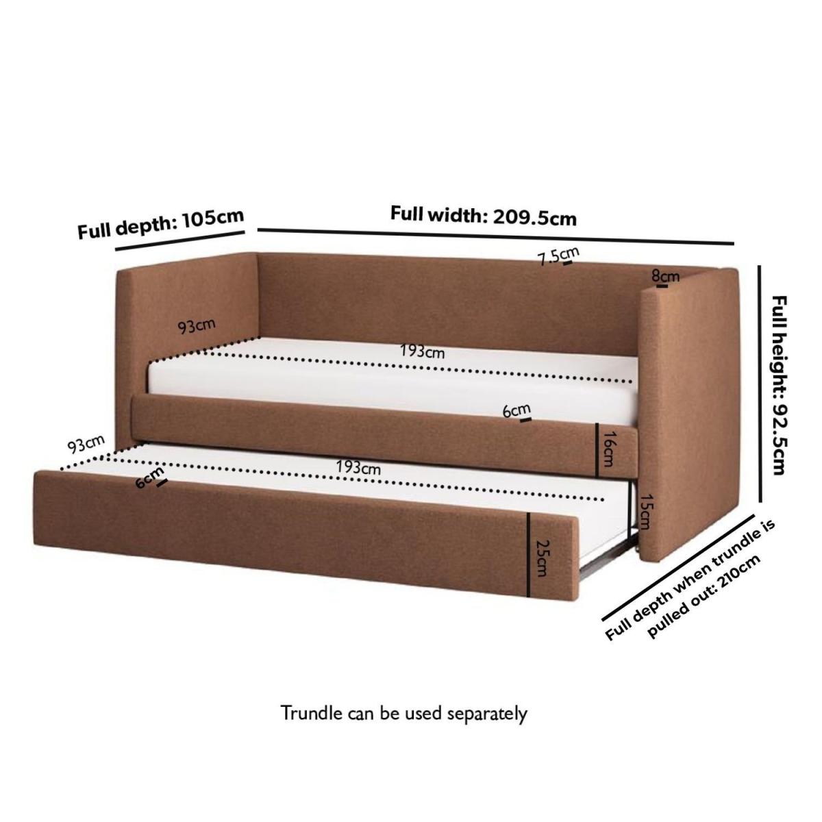 With its sleek, minimalist design and soft-touch burnt orange chenille fabric, this day bed adds warmth, texture, and modern elegance to any space. Provides comfortable seating by day and transforms into two cosy sleeping spaces by night. Designed for restful sleep, this bed offers better support and comfort than a traditional sofa. The pull-out trundle maximises space while ensuring comfort, making it ideal for small apartments, guest rooms, or multipurpose spaces. Crafted from high-quality materials, it's built to last ensuring long-term reliability. The Amie Day Bed with Trundle is the perfect blend of style and practicality, making it a great addition to any home. Upholstered in soft-touch burnt orange chenille fabric, it adds warmth and elegance to your space. During the day, it’s a comfy spot to relax, and at night, it easily transforms into two cosy sleeping spaces. The smooth pull-out trundle provides extra room for guests, making it a perfect choice for small rooms, guest areas, or multifunctional spaces.