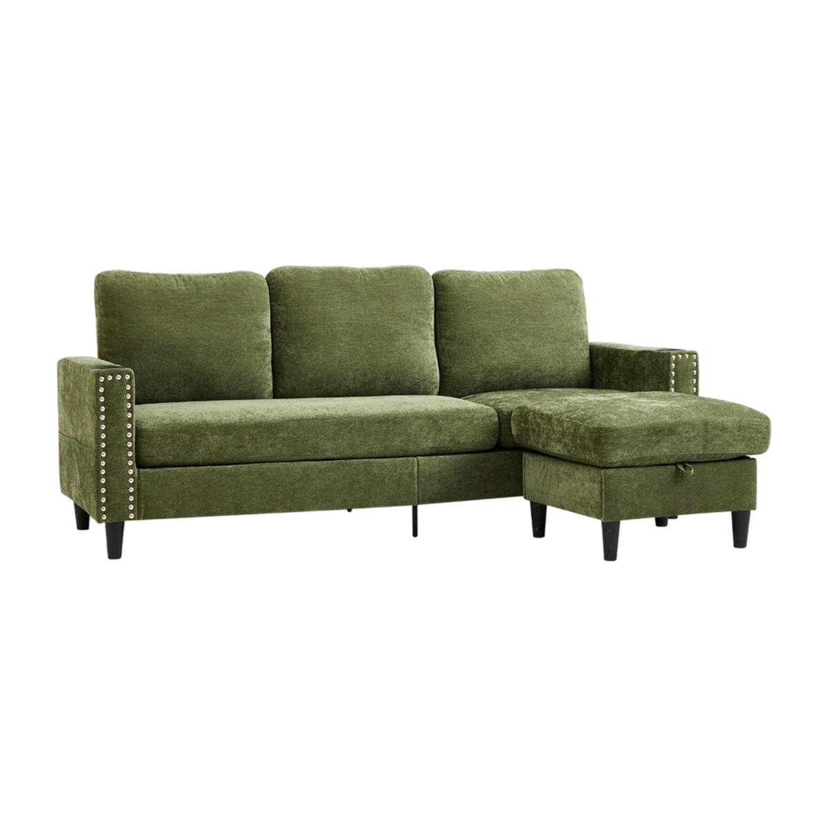 Relax and enjoy coffee with family on this spacious three seater sofa. Decorative metal studs on the armrests bring a vintage accent, while the generous seating easily accommodates several people. Upholstered in soft chenille fabric, it provides a cosy feel, with high density sponge filling inside for lasting comfort and reliable support. Practical cup holders and side pockets on the armrests offer handy spaces for drinks and essentials, keeping everything neatly within reach. The movable ottoman can be positioned as needed, adding flexibility to your layout. Perfect for film nights or quiet reading, it is an inviting choice for everyday relaxation.
