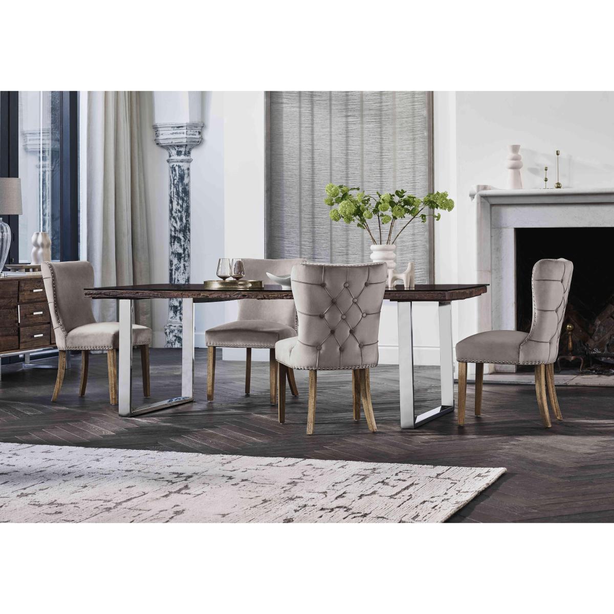 If you love modern industrial style but also gravitate toward the sumptuous and opulent, then Chennai is for you. This stylish fusion of old and new, rustic and modern brings together contrasting materials in the form of genuine reclaimed railway sleeper wood from India, chic glass tops and polished stainless steel bases. Exclusive to Furniture Village, the Chennai range features statement dining tables and upholstered dining chairs, and includes a carefully curated selection of storage pieces and occasional tables. Creatively designed and beautifully crafted, Chennai brings home contemporary glamour. Glam style with an on-trend industrial edge – this dining set features our Chennai dining table with authentic reclaimed wood top and four beautiful luxe dining chairs. Why you'll love it Stunning dining set in a gorgeous combination of wood, metal and velvet. Glam industrial style. Dining table is made of genuine reclaimed sleeper wood from India. Glass top enhances the beauty of the wood. Eye-catching polished stainless steel U-shaped base. Table is available in 2 sizes. With 4 luxe dining chairs upholstered in velvet. Embellished with flawless buttoning and metallic studding. Luxuriously cushioned for dining comfort. Choose all grey or all taupe, or 2 of each colour. A Furniture Village exclusive. This dining set is part of our Chennai range. What you need to know Chairs have solid wood frames and legs, and foam cushioning. Table has 10 mm toughened glass top. The glass top may overhang the table top by up to 1.5 cm. There may be significant gaps between the wood surface and glass top. 180 cm dining table seats 6. 220 cm dining table seats 8. 220 cm table has adjustable legs to maximise seating space on the ends with the supplied 25 cm table inset and along each long side. Each plank of reclaimed wood has unique grain, knots and markings and colour variations. This reclaimed wood has an irregular distressed surface and a natural untreated finish. Take care when moving the tempered glass top. As a result of the polishing process, the glass may show surface scratches under direct light. We recommend using coasters and placemats at all times.