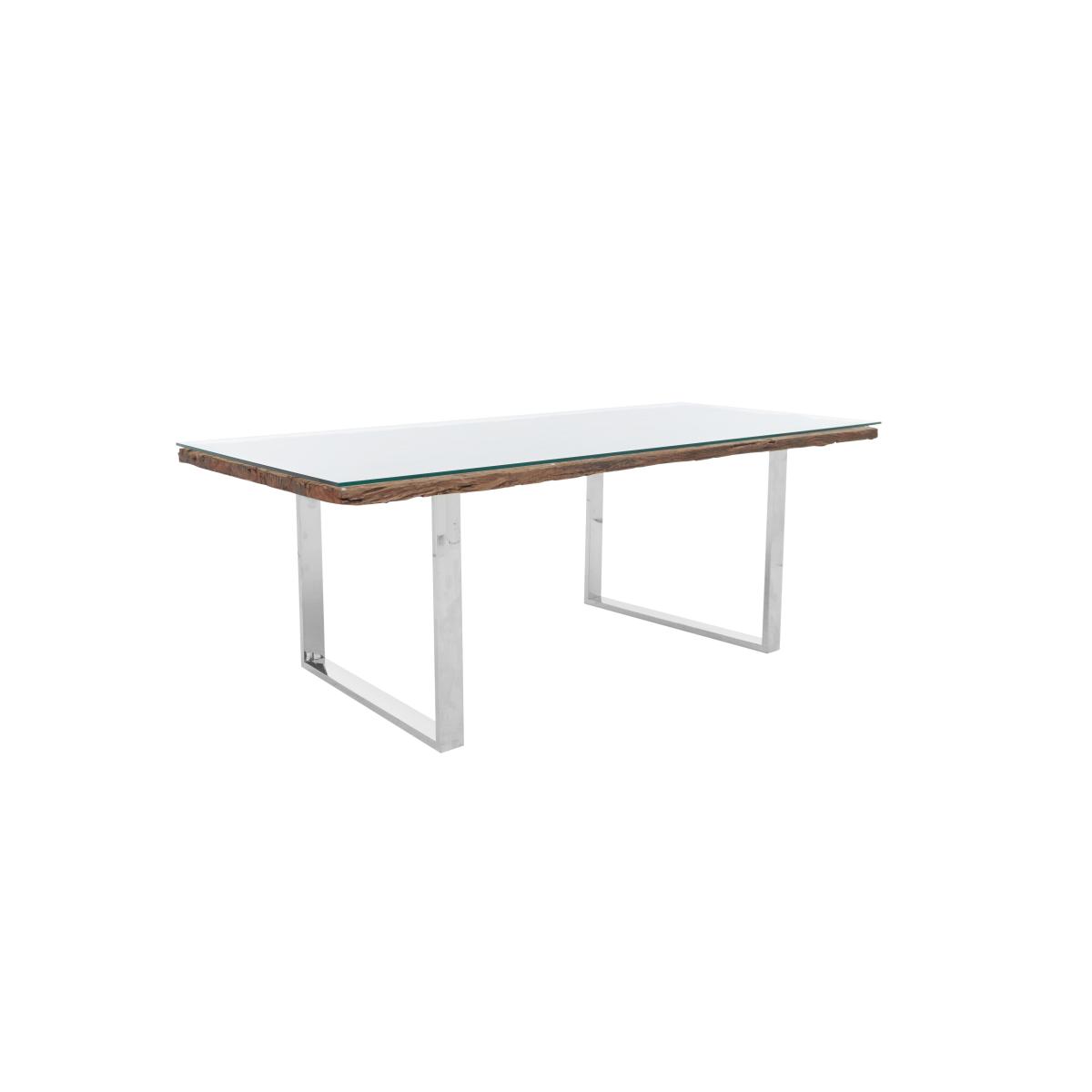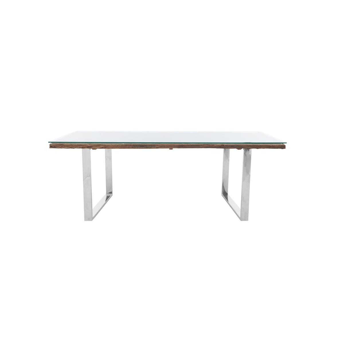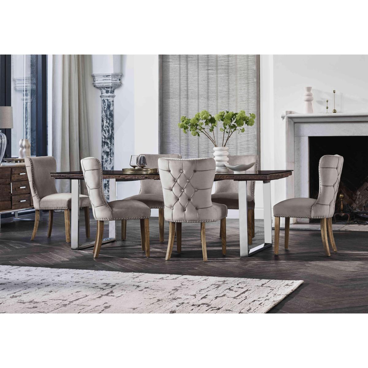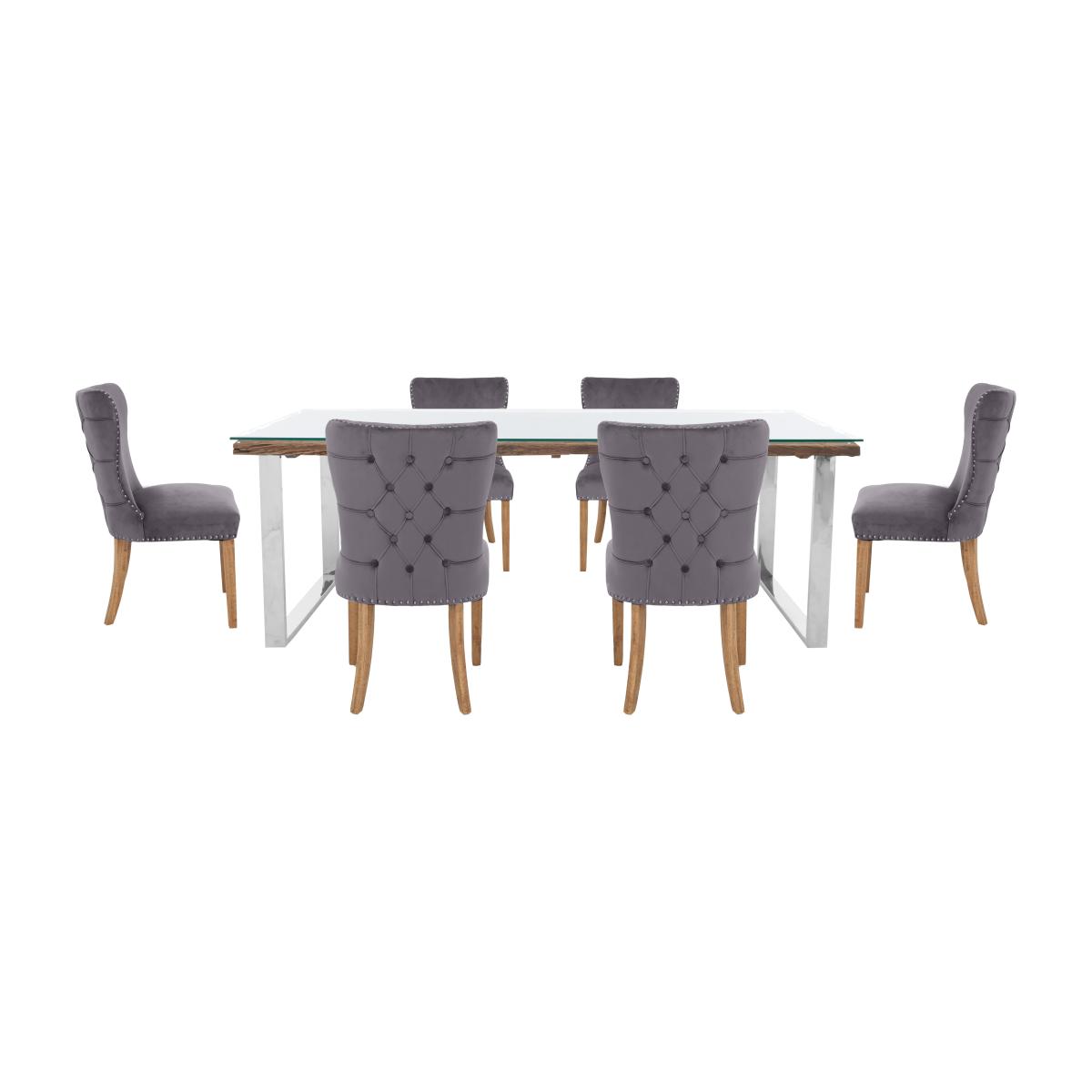If you love modern industrial style but also gravitate toward the sumptuous and opulent, then Chennai is for you. This stylish fusion of old and new, rustic and modern brings together contrasting materials in the form of genuine reclaimed railway sleeper wood from India, chic glass tops and polished stainless steel bases. Exclusive to Furniture Village, the Chennai range features statement dining tables and upholstered dining chairs, and includes a carefully curated selection of storage pieces and occasional tables. Creatively designed and beautifully crafted, Chennai brings home contemporary glamour. With its genuine rustic wood top and stainless steel base paired with six glam dining chairs, this dining set makes a fabulous design statement. Why you'll love it Absolutely stunning dining set combines rustic and luxe finishes. Glam industrial style. Dining table is made of genuine reclaimed sleeper wood from India. Glass top enhances the beauty of the wood. Eye-catching polished stainless steel U-shaped base. Table is available in 2 sizes. With 6 luxe dining chairs upholstered in velvet. Embellished with flawless buttoning and metallic studding. Luxuriously cushioned for dining comfort. Choose all grey or all taupe, or 3 of each colour. A Furniture Village exclusive. This dining set is part of our Chennai range. What you need to know Chairs have solid wood frames and legs, and foam cushioning. Table has 10 mm toughened glass top. The glass top may overhang the table top by up to 1.5 cm. There may be significant gaps between the wood surface and glass top. 180 cm dining table seats 6. 220 cm dining table seats 8. 220 cm table has adjustable legs to maximise seating space on the ends with the supplied 25 cm table inset and along each long side. Each plank of reclaimed wood has unique grain, knots and markings and colour variations. This reclaimed wood has an irregular distressed surface and a natural untreated finish. Take care when moving the tempered glass top. As a result of the polishing process, the glass may show surface scratches under direct light. We recommend using coasters and placemats at all times.