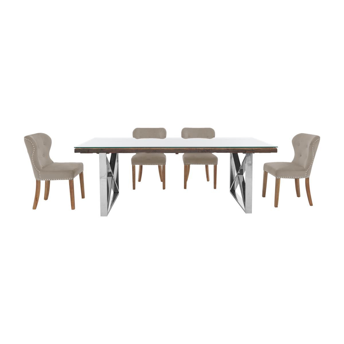 If you love modern industrial style but also gravitate toward the sumptuous and opulent, then Chennai is for you. This stylish fusion of old and new, rustic and modern brings together contrasting materials in the form of genuine reclaimed railway sleeper wood from India, chic glass tops and polished stainless steel bases. Exclusive to Furniture Village, the Chennai range is centred around a stunning and imposing dining table, and includes a carefully curated selection of storage pieces and occasional tables. A large wood framed mirror and curvaceous velvet upholstered dining chair complete this on trend collection. Creatively designed and beautifully crafted, Chennai brings home contemporary glamour. In gorgeous contemporary style, the Chennai dining table with X-shaped legs and 4 upholstered dining chairs brings distinctive glamour and charm to any dining room. This beautifully crafted glass-topped dining table is made of reclaimed wood from Indian railway sleepers so you can be sure that every table is entirely unique, displaying individual character, warmth of colour and authentic texture. In sleek and stylish contrast, the criss-cross base is made of shiny polished stainless steel. Choose from two sizes – a 180 cm dining table which seats six, and a 220 cm dining table which seats eight. The four accompanying upholstered wood-framed dining chairs have exaggerated curves and gorgeous velvet upholstery in taupe or grey. Wonderfully padded, they’re incredibly comfortable and feature stylish details that include minimal back buttoning and metallic studding. The 220 cm dining table comes with an adjustable leg design, letting you maximise the space down each side for chairs while also giving you the option to place chairs at either end with the 25cm inset placement. The Chennai dining table and 4 upholstered dining chairs set is part of the Chennai collection of dining room and living room furniture. Complete the look with the Chennai large sideboard and the Chennai wall mirror. Only available at Furniture Village. Please note:. Natural wood has unique grain, knots and markings. Every piece is different.