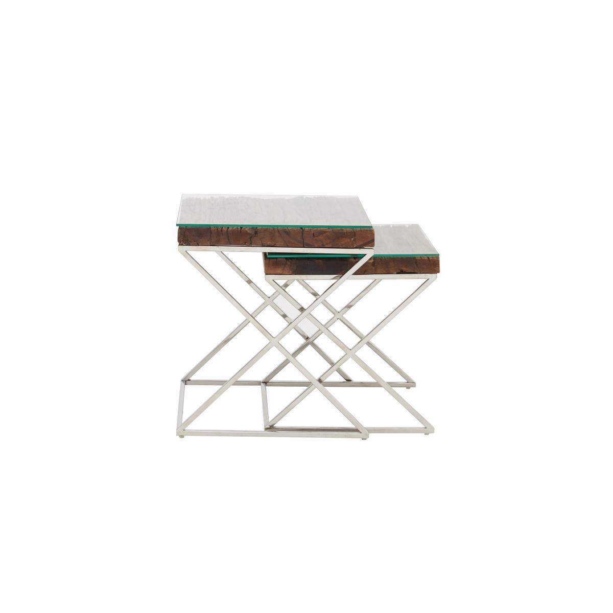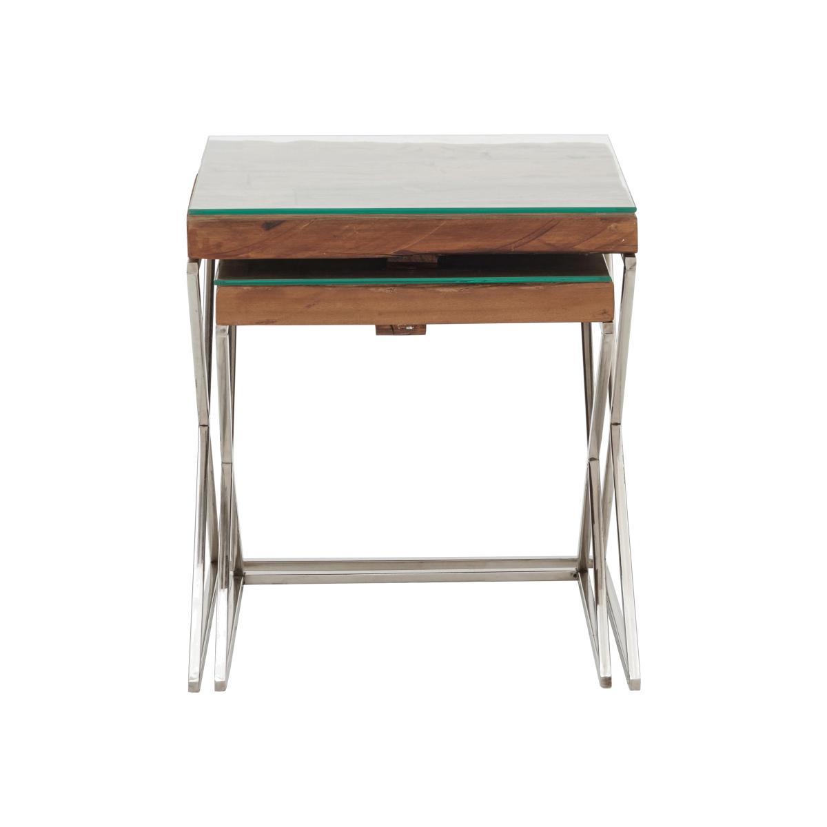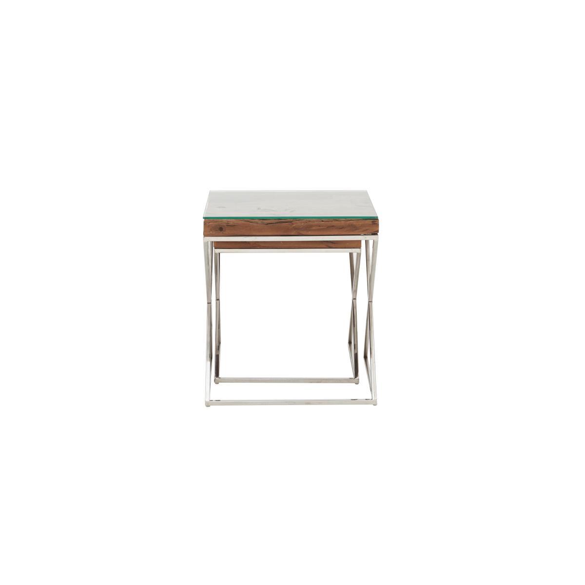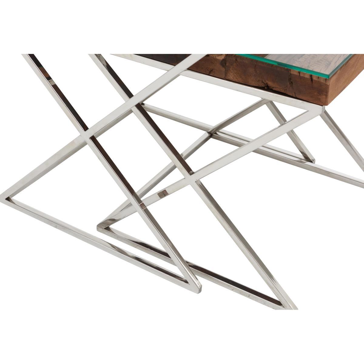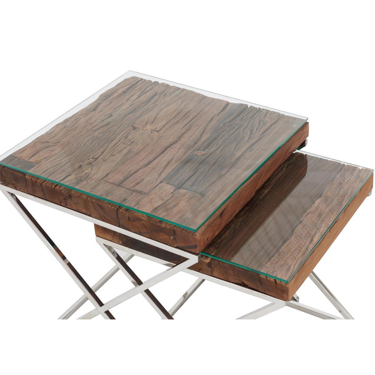 If you love modern industrial style but also gravitate toward the sumptuous and opulent, then Chennai is for you. This stylish fusion of old and new, rustic and modern brings together contrasting materials in the form of genuine reclaimed railway sleeper wood from India, chic glass tops and polished stainless steel bases. Exclusive to Furniture Village, the Chennai range is centred around a stunning and imposing dining table, and includes a carefully curated selection of storage pieces and occasional tables. A large wood framed mirror and curvaceous velvet upholstered dining chair complete this on trend collection. Creatively designed and beautifully crafted, Chennai brings home contemporary glamour. Twice as stylish and twice as useful, the Chennai nest of tables is the perfect piece for your contemporary living space. Tables easily double as side or end tables, and then simply and neatly stack to save on floor space. As well as very functional these two tables are seriously stylish. They’re beautifully crafted from genuine reclaimed sleeper wood from India and have glass tops and X-shaped polished stainless steel bases. The contrast of the old and the new, the rustic and the glamorous, the naturally-finished wood and the highly polished steel is a perfect iteration of contemporary glamour. The Chennai nest of tables is part of the Chennai range of living and dining room pieces. Pair this nest of tables with the Chennai console table, or opt for stylish storage with the Chennai sideboard. The Chennai collection is only available at Furniture Village. Please note. Natural wood has unique grain, knots and markings. Every piece is different.