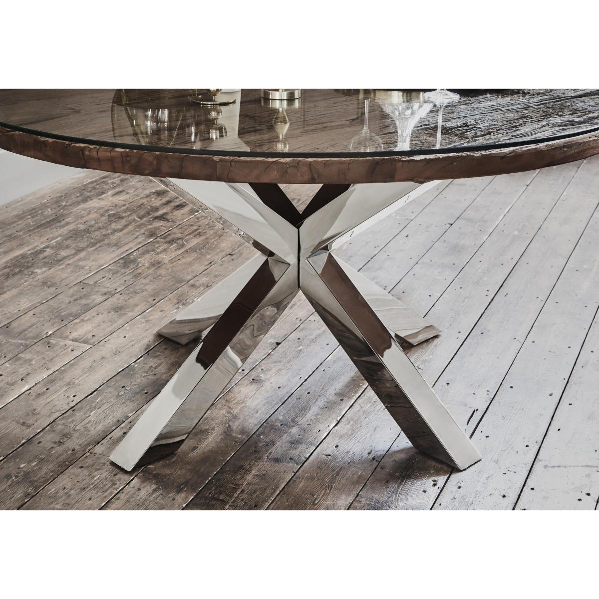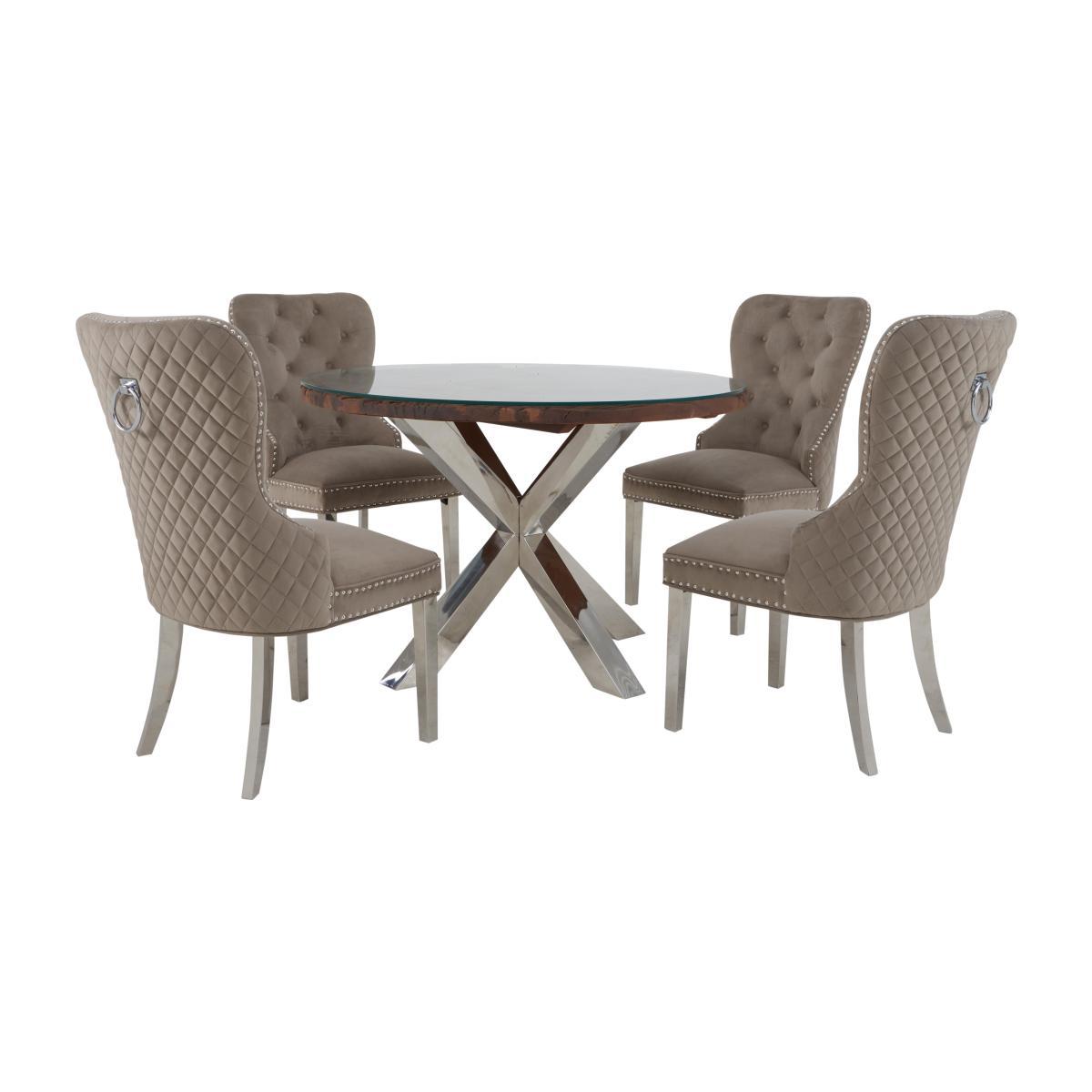 If you love modern industrial style but also gravitate toward the sumptuous and opulent, then Chennai is for you. This stylish fusion of old and new, rustic and modern brings together contrasting materials in the form of genuine reclaimed railway sleeper wood from India, chic glass tops and polished stainless steel bases. Exclusive to Furniture Village, the Chennai range is centred around a stunning and imposing dining table, and includes a carefully curated selection of storage pieces and occasional tables. A large wood framed mirror and curvaceous velvet upholstered dining chair complete this on trend collection. Creatively designed and beautifully crafted, Chennai brings home contemporary glamour. Who would have thought railway sleepers could create something so chic and glamorous? A gorgeous contemporary dining set in reclaimed wood, glass and steel, with four lovely velvet dining chairs. What you’ll love. Table top made from genuine reclaimed sleeper wood from India. Protected with toughened glass. Striking, star-burst crossed base in polished steel. Sociably shaped table is available In two sizes. Textured wood is unique and so characterful. Four luxurious velvet dining chairs in taupe or grey. Detailed with elegant quilting and studding. The chairs have polished stainless-steel legs. A Furniture Village exclusive. What you need to know. 120cm size table seats up to 4. Reclaimed railway sleeper wood top. Top protected with 10mm thick tempered glass. Natural wood has unique grain, knots and markings. Every piece is different.