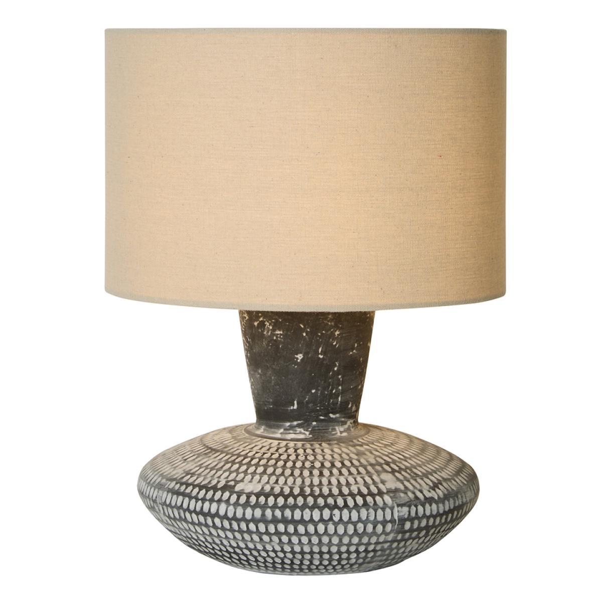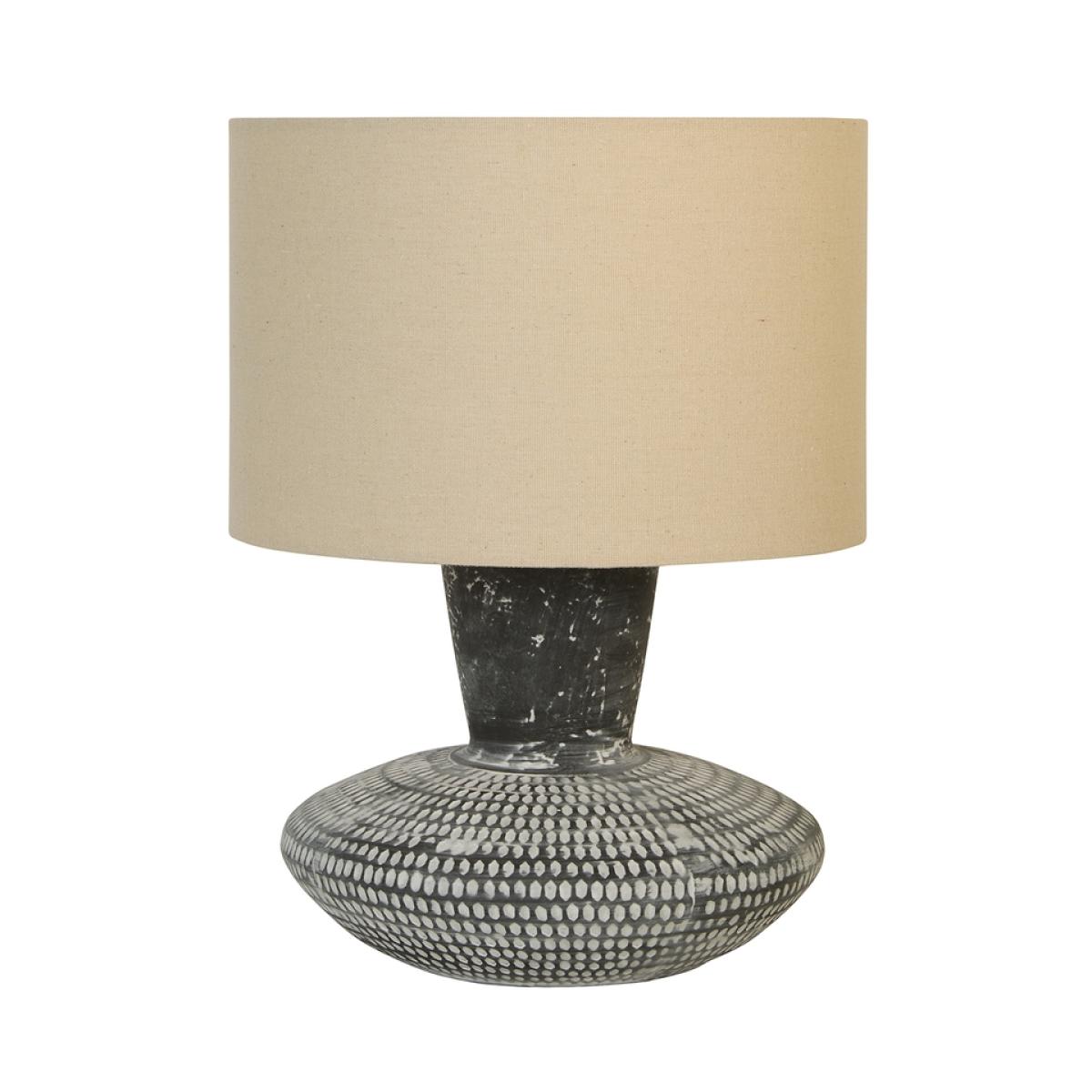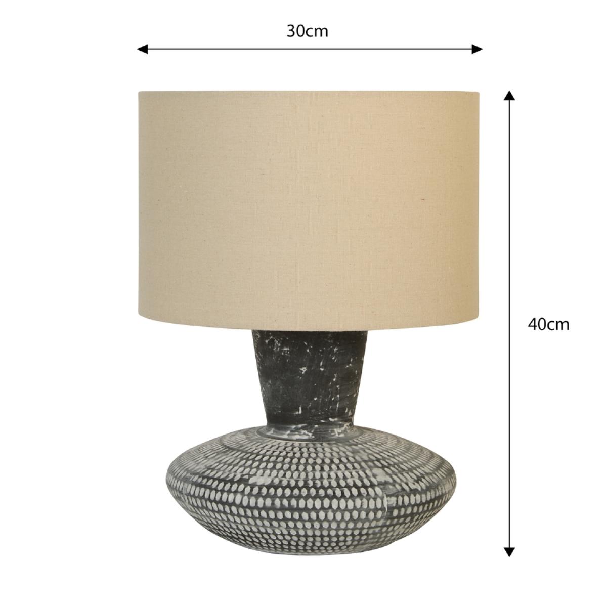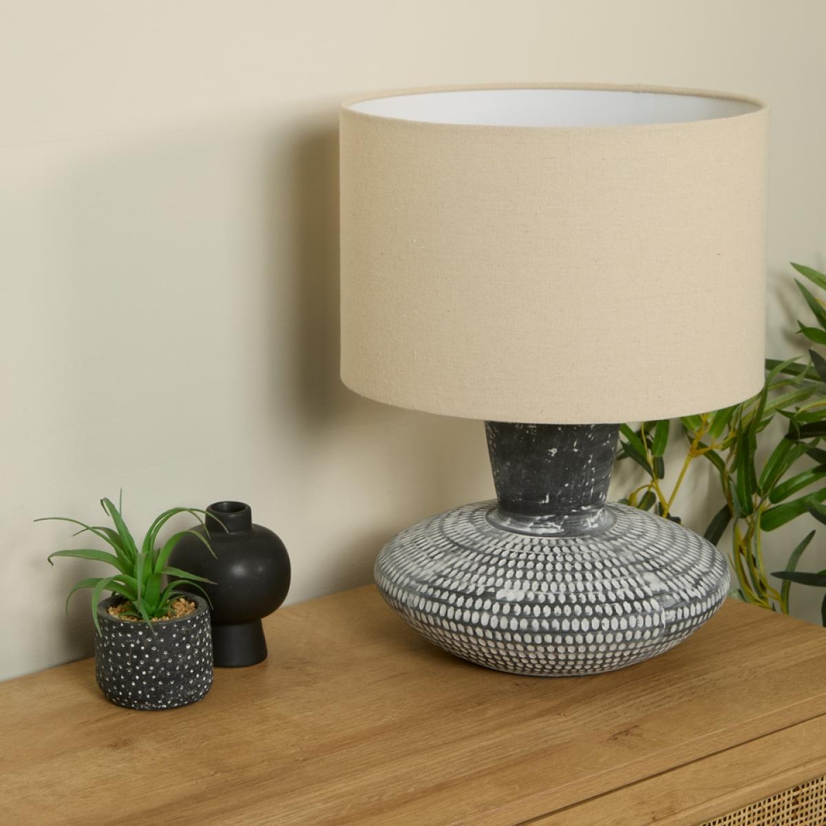 Make a statement with the Chennai Table Lamp. Its sleek, black stone effect, gourd shaped inspired base, adds a touch of drama, while the natural shade softens the look for a touch of balance. This modern lamp is perfect for adding a touch of sophistication to any room, perfect for casting a soft light for added illumination.