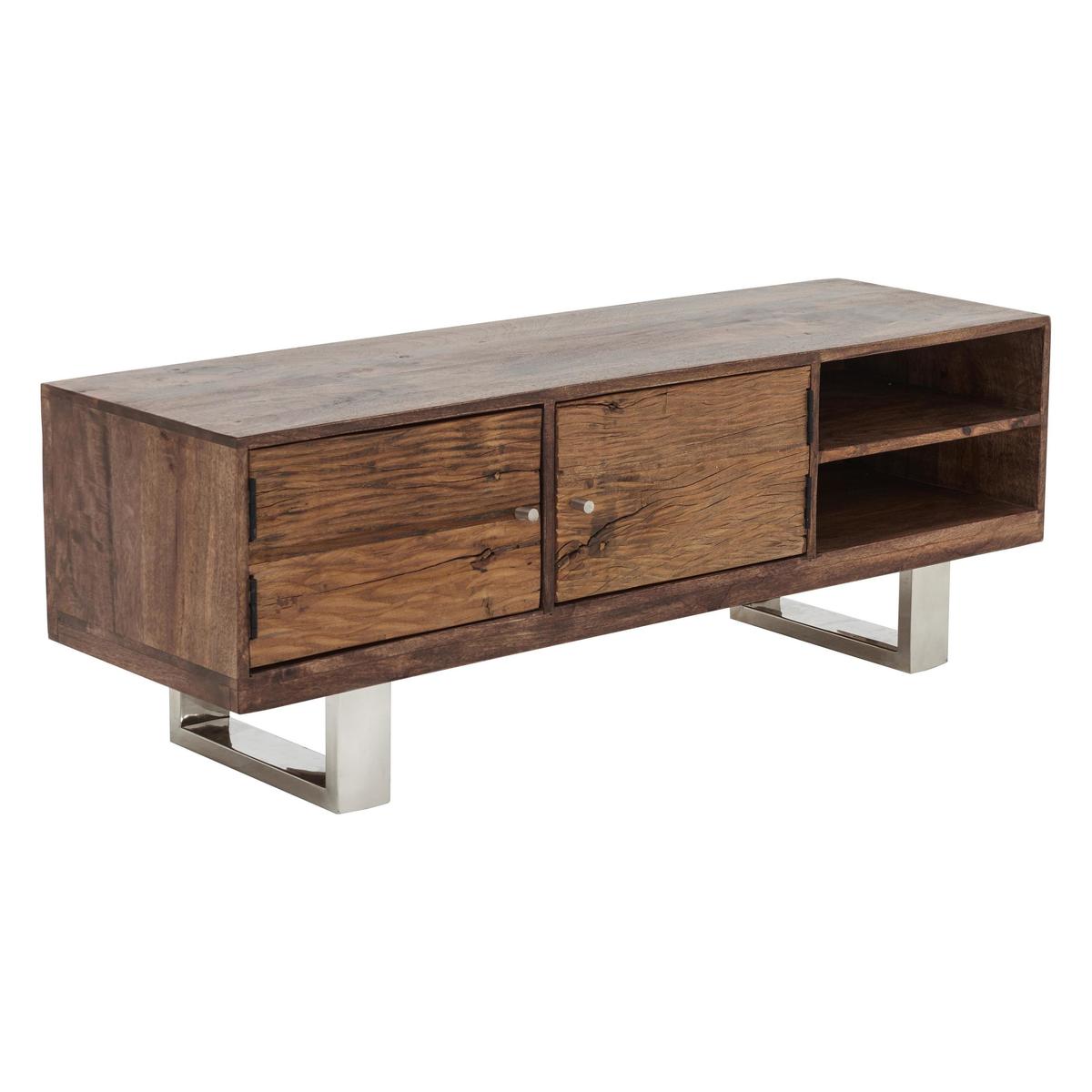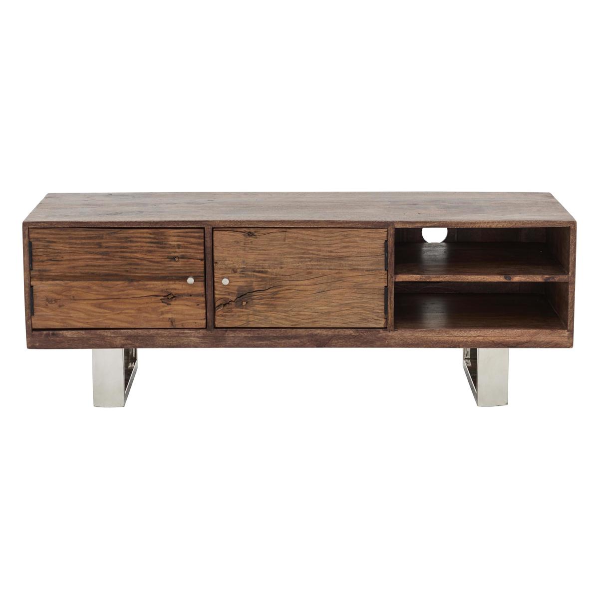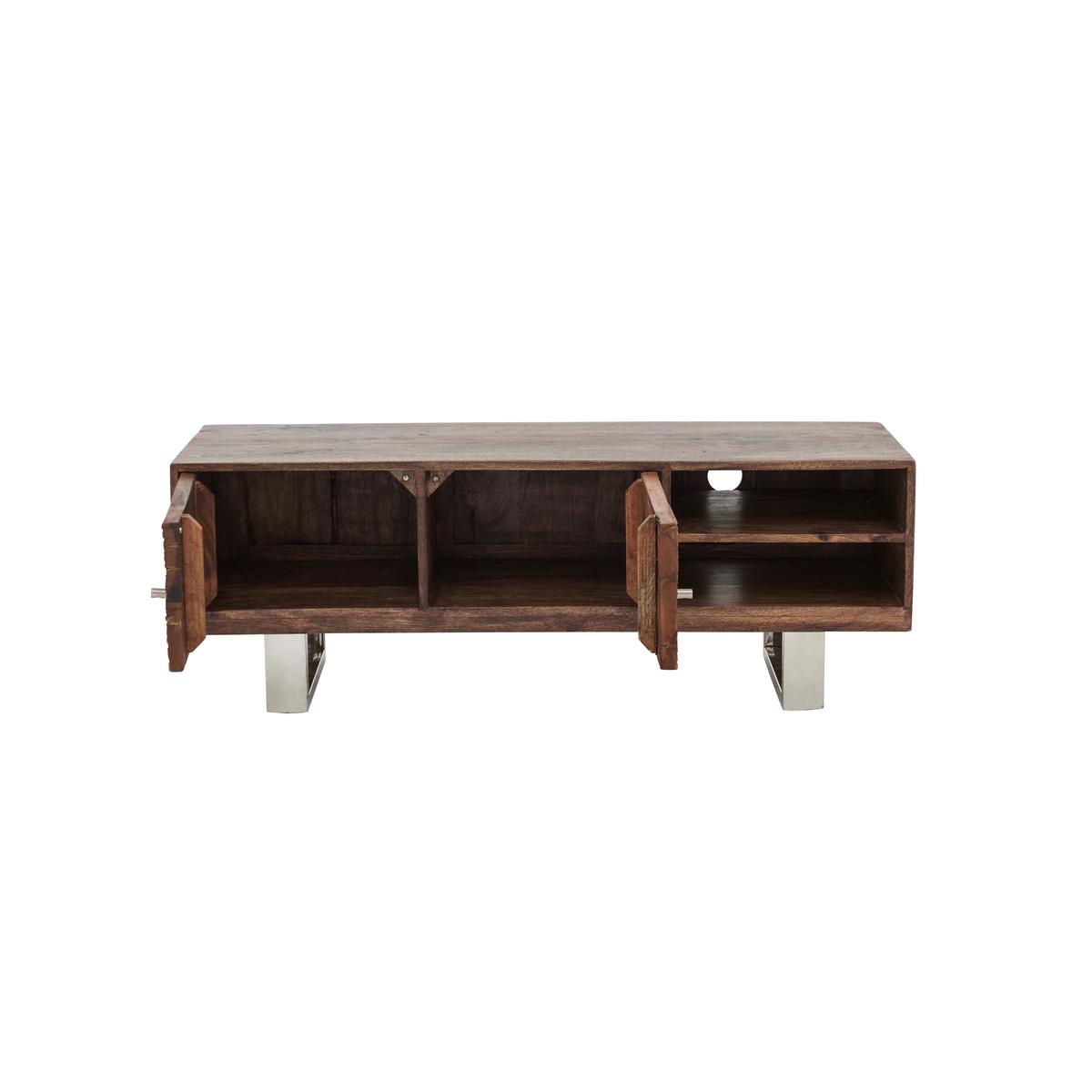 If you love modern industrial style but also gravitate toward the sumptuous and opulent, then Chennai is for you. This stylish fusion of old and new, rustic and modern brings together contrasting materials in the form of genuine reclaimed railway sleeper wood from India, chic glass tops and polished stainless steel bases. Exclusive to Furniture Village, the Chennai range is centred around a stunning and imposing dining table, and includes a carefully curated selection of storage pieces and occasional tables. A large wood framed mirror and curvaceous velvet upholstered dining chair complete this on trend collection. Creatively designed and beautifully crafted, Chennai brings home contemporary glamour. A stunning combination of sleek finish and rustic texture, the Chennai TV unit is the perfect place to display and store your high tech audio visual equipment. The body of this spacious TV cabinet is made of mango wood and reclaimed wood from Indian railways sleepers. Both types of wood exhibit characterful texture, and are rich and warm in colour. Its base is made of polished stainless steel, a material which provides more than a touch of contemporary glamour. With two open shelves and a slim two-door cupboard, you’ll find there’s plenty of room for video and gaming equipment. Cut outs at the rear help keep cables tidy, too. The Chennai TV unit is part of the gorgeous Chennai range of living and dining furniture which includes a dining table, sideboard and occasional pieces. A Furniture Village exclusive. Please note. Natural wood has unique grain, knots and markings. Every piece is different.