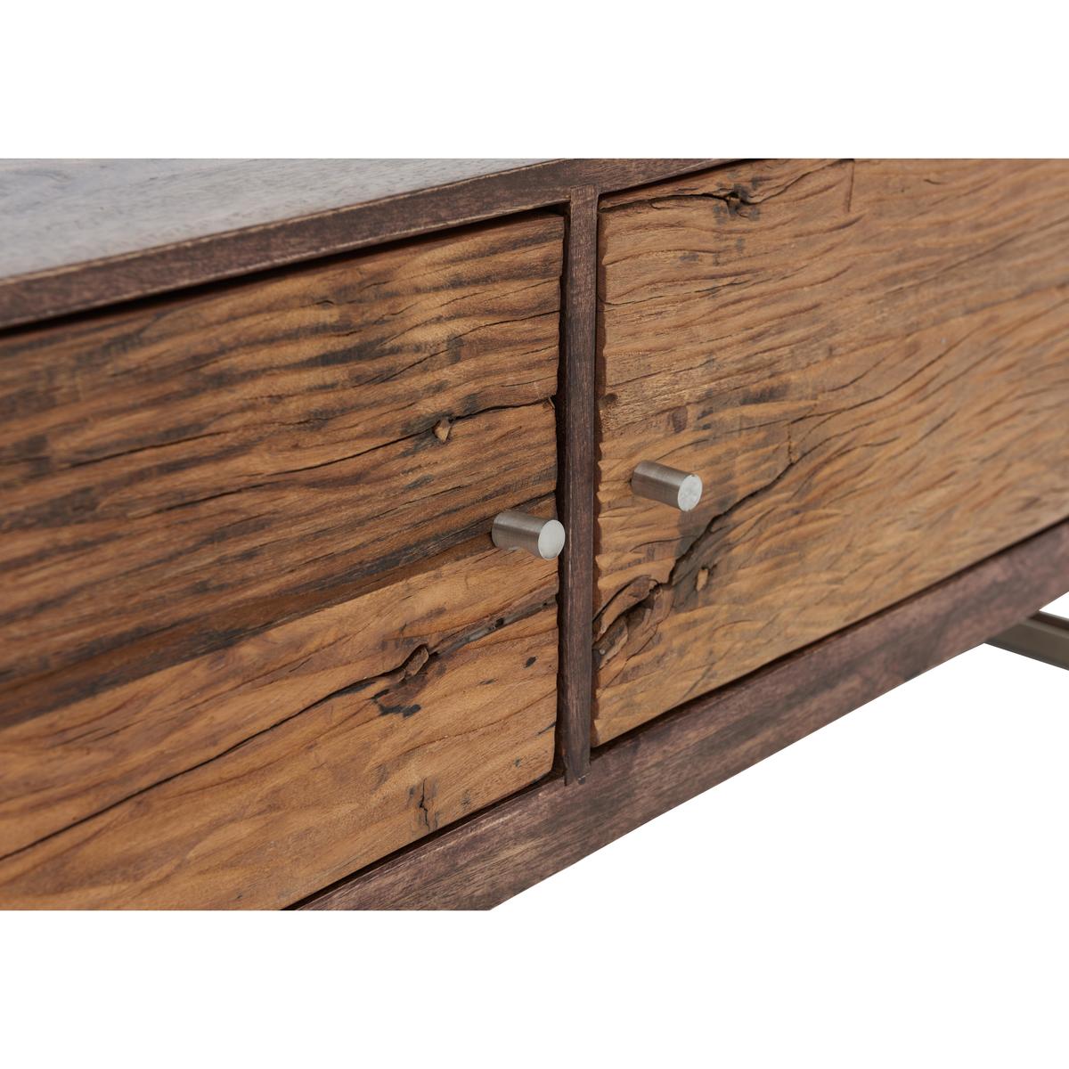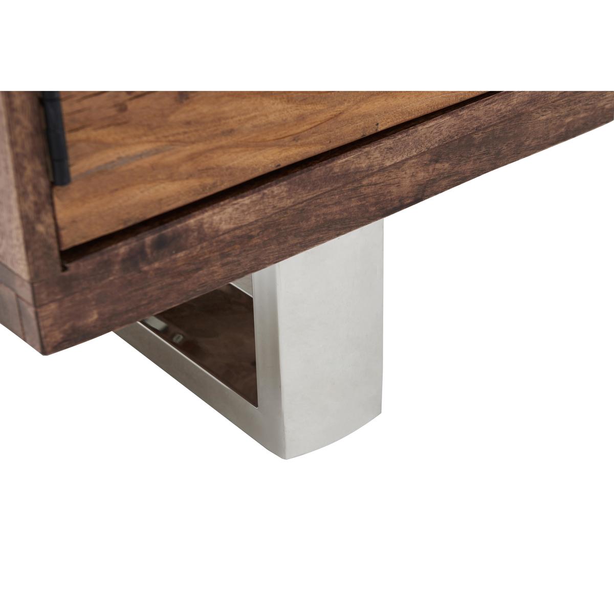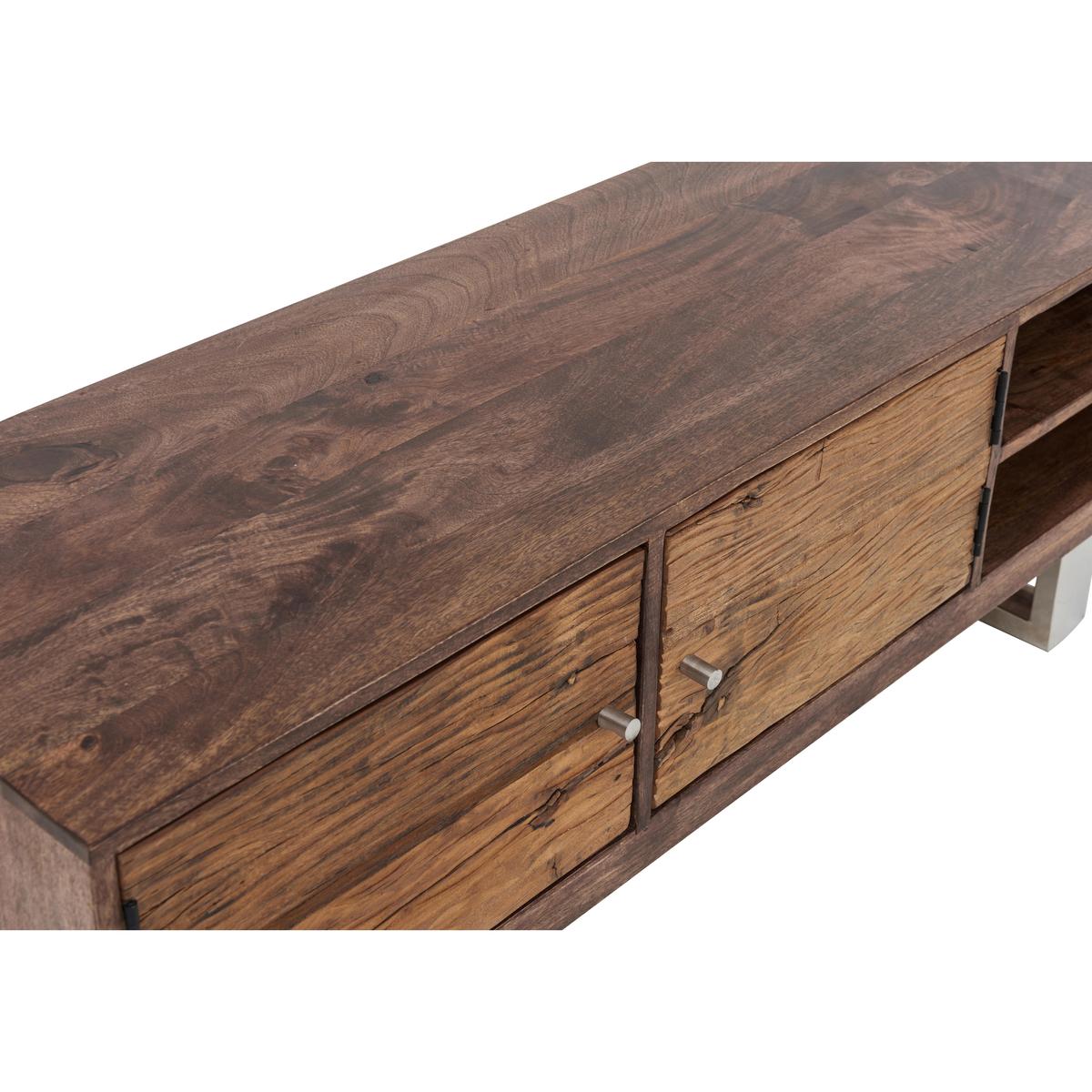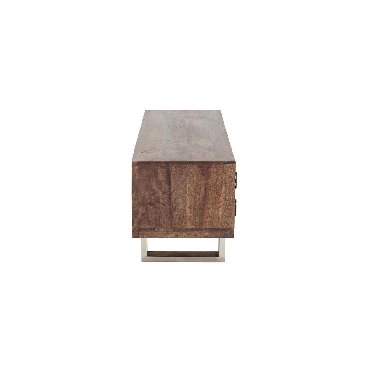If you love modern industrial style but also gravitate toward the sumptuous and opulent, then Chennai is for you. This stylish fusion of old and new, rustic and modern brings together contrasting materials in the form of genuine reclaimed railway sleeper wood from India, chic glass tops and polished stainless steel bases. Exclusive to Furniture Village, the Chennai range is centred around a stunning and imposing dining table, and includes a carefully curated selection of storage pieces and occasional tables. A large wood framed mirror and curvaceous velvet upholstered dining chair complete this on trend collection. Creatively designed and beautifully crafted, Chennai brings home contemporary glamour. A stunning combination of sleek finish and rustic texture, the Chennai TV unit is the perfect place to display and store your high tech audio visual equipment. The body of this spacious TV cabinet is made of mango wood and reclaimed wood from Indian railways sleepers. Both types of wood exhibit characterful texture, and are rich and warm in colour. Its base is made of polished stainless steel, a material which provides more than a touch of contemporary glamour. With two open shelves and a slim two-door cupboard, you’ll find there’s plenty of room for video and gaming equipment. Cut outs at the rear help keep cables tidy, too. The Chennai TV unit is part of the gorgeous Chennai range of living and dining furniture which includes a dining table, sideboard and occasional pieces. A Furniture Village exclusive. Please note. Natural wood has unique grain, knots and markings. Every piece is different.