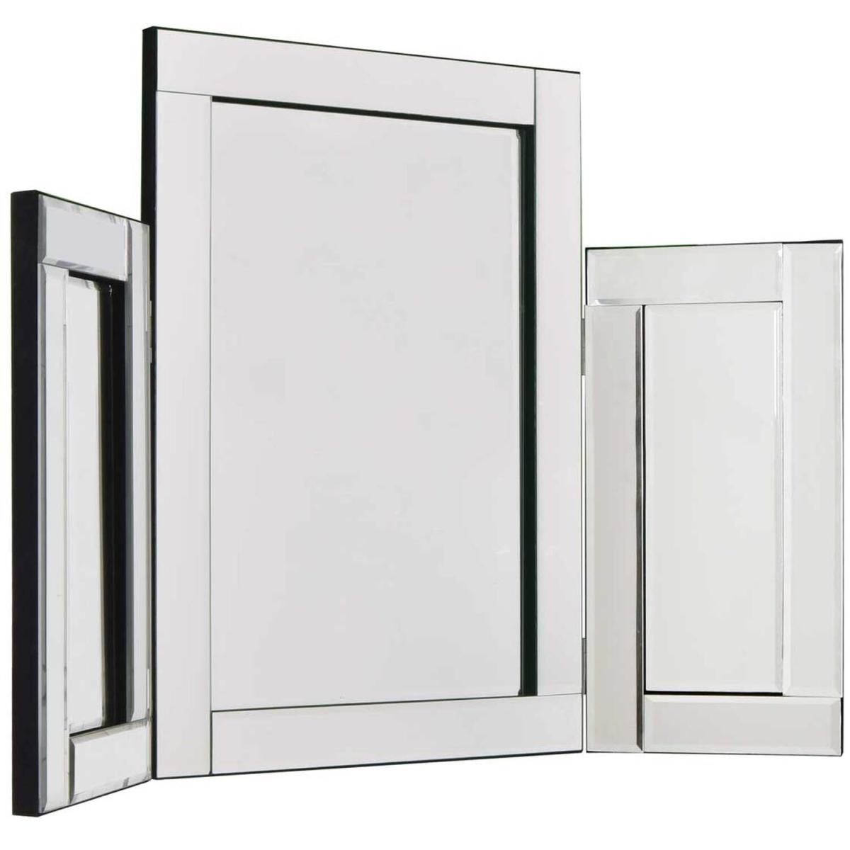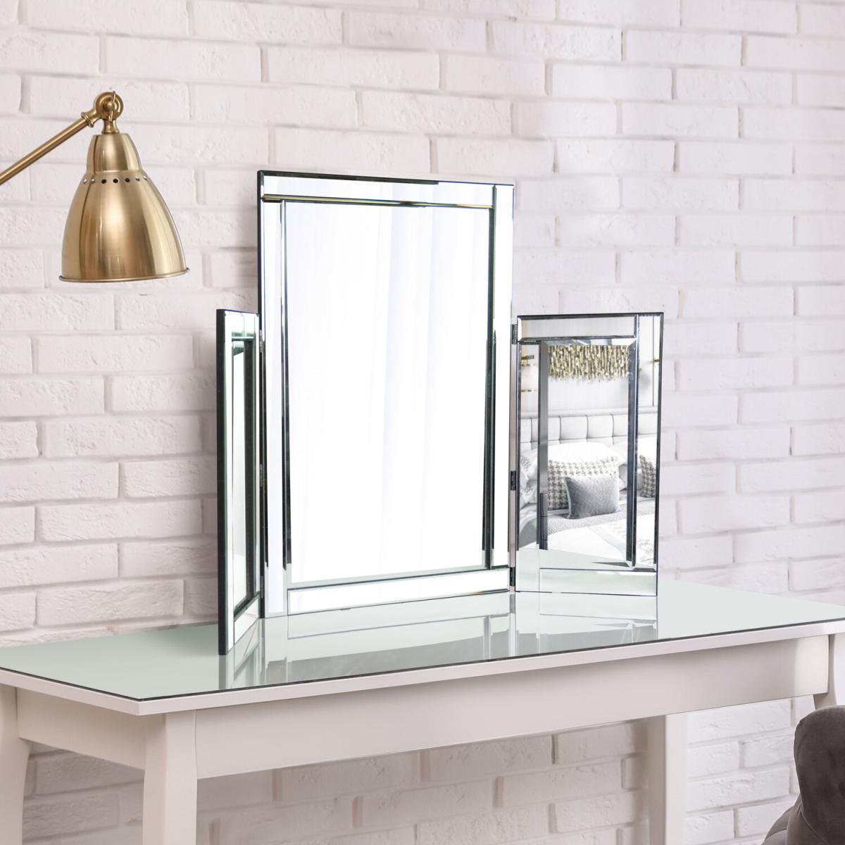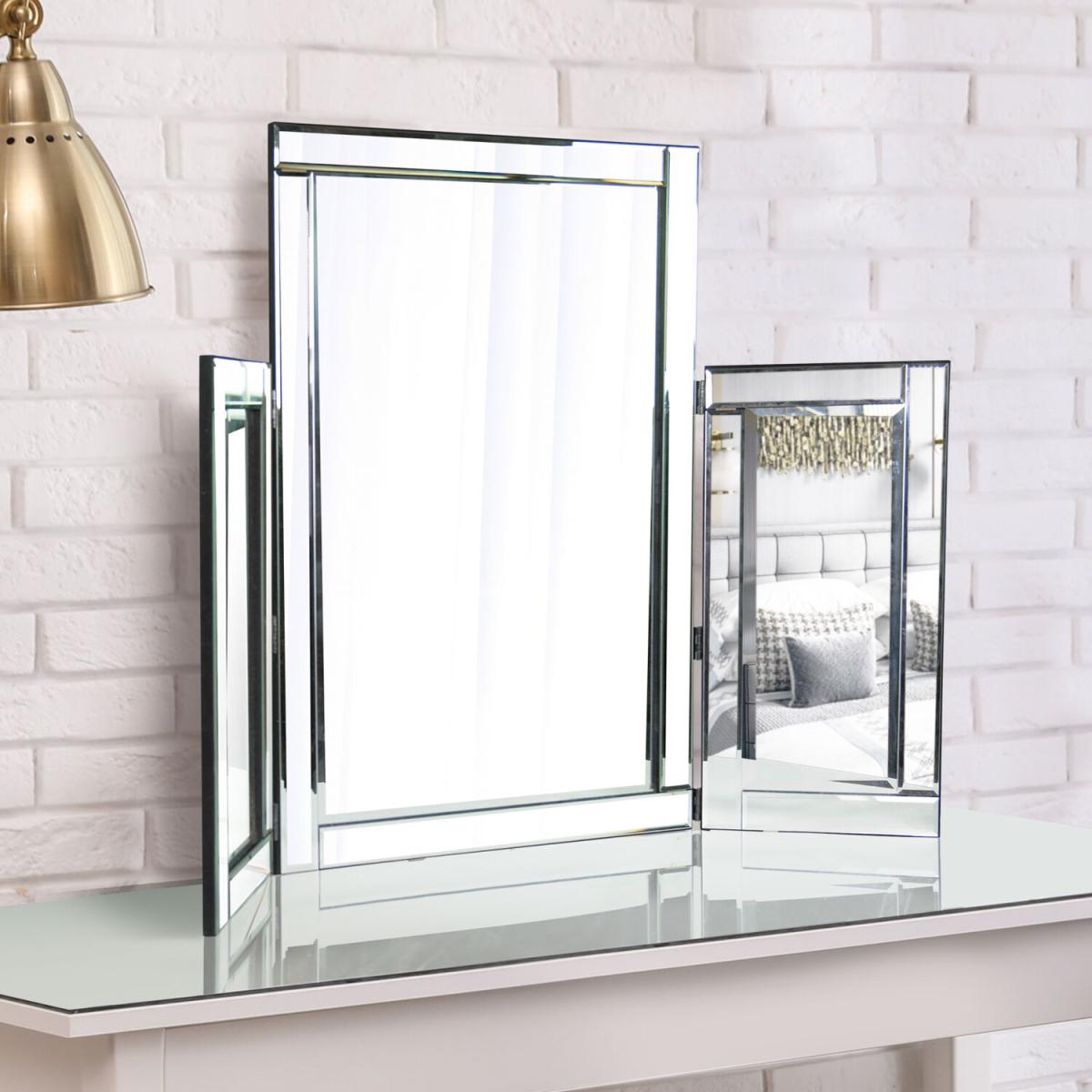 MirrorOutlet stunning all-glass Venetian dressing table mirror is made up of three separate panels which are then joined by hinges. Each piece of glass is finished with premium bevelled edging.