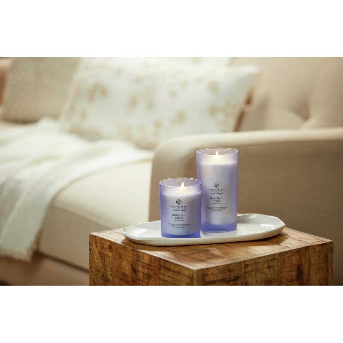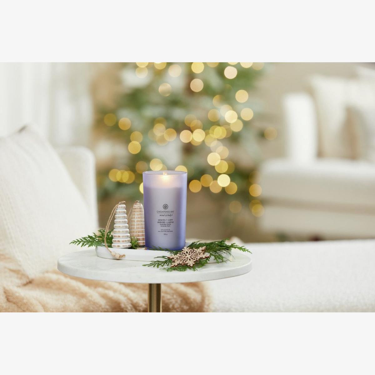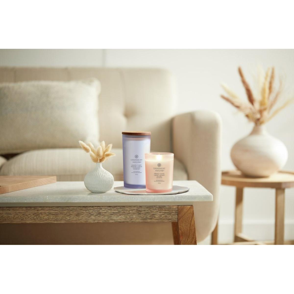 Our Chesapeake Bay Mind & Body Candles are infused with scents to help restore balance when consumers need to centre and self-reflect. The soft, sophisticated fragrances of our aromatherapy inspired candles are made with essential oils and a soy wax blend. The frosted glass vessels are designed in soothing tones, that complement the fragrances, and can help to create a peaceful environment with their colour and ambient glow when alight. The clean, simple design also includes a wood style lid to complement any decor. Soy Wax Blend for a smooth, even burn, 100% natural fibres, rigorously tested for the best burn possible. Beautiful frosted glass in soothing colours to help create a peaceful environment. Lavender Thyme scent. Soy wax. Approximate burn time 82 hours. Size H16.3, Diameter 8.6cm.