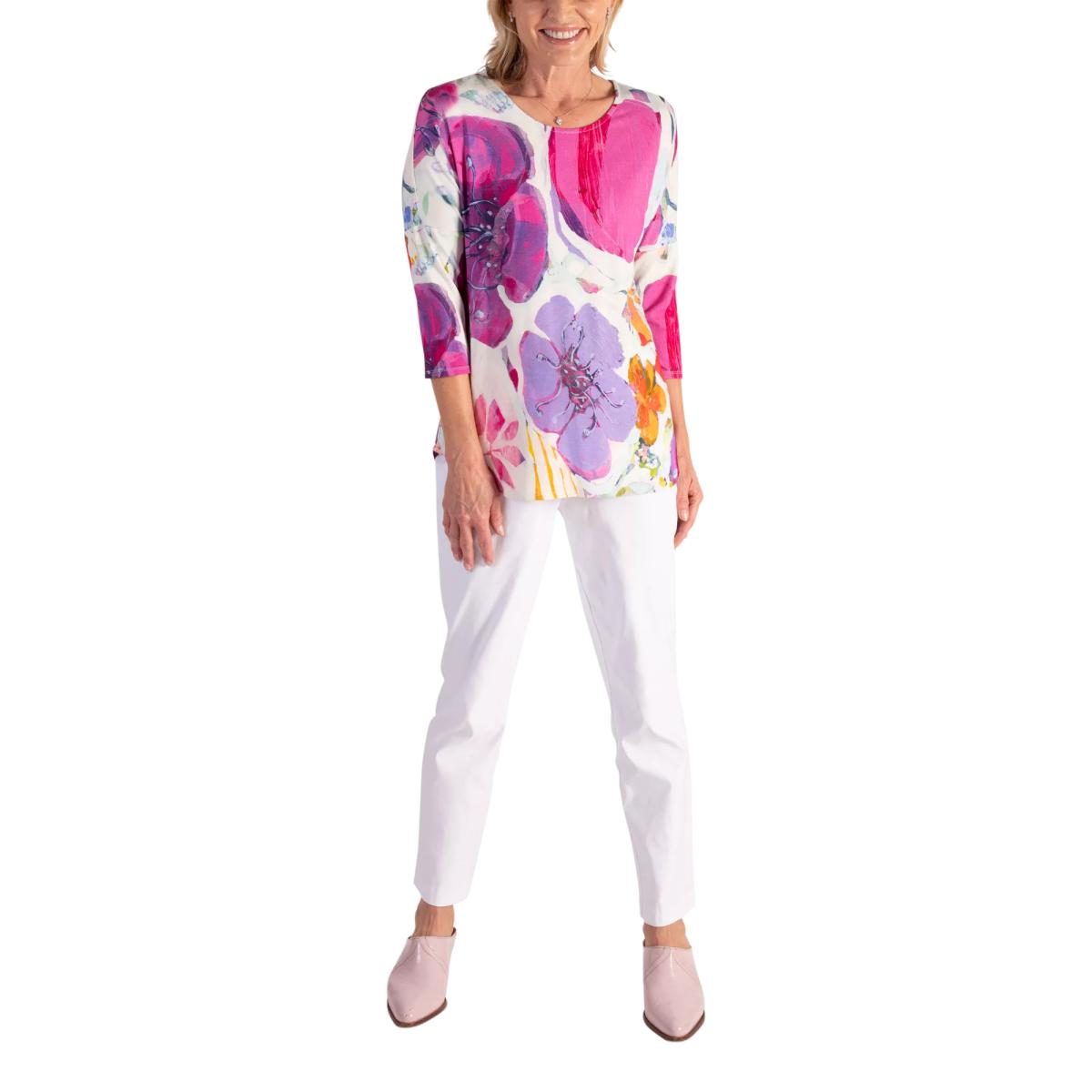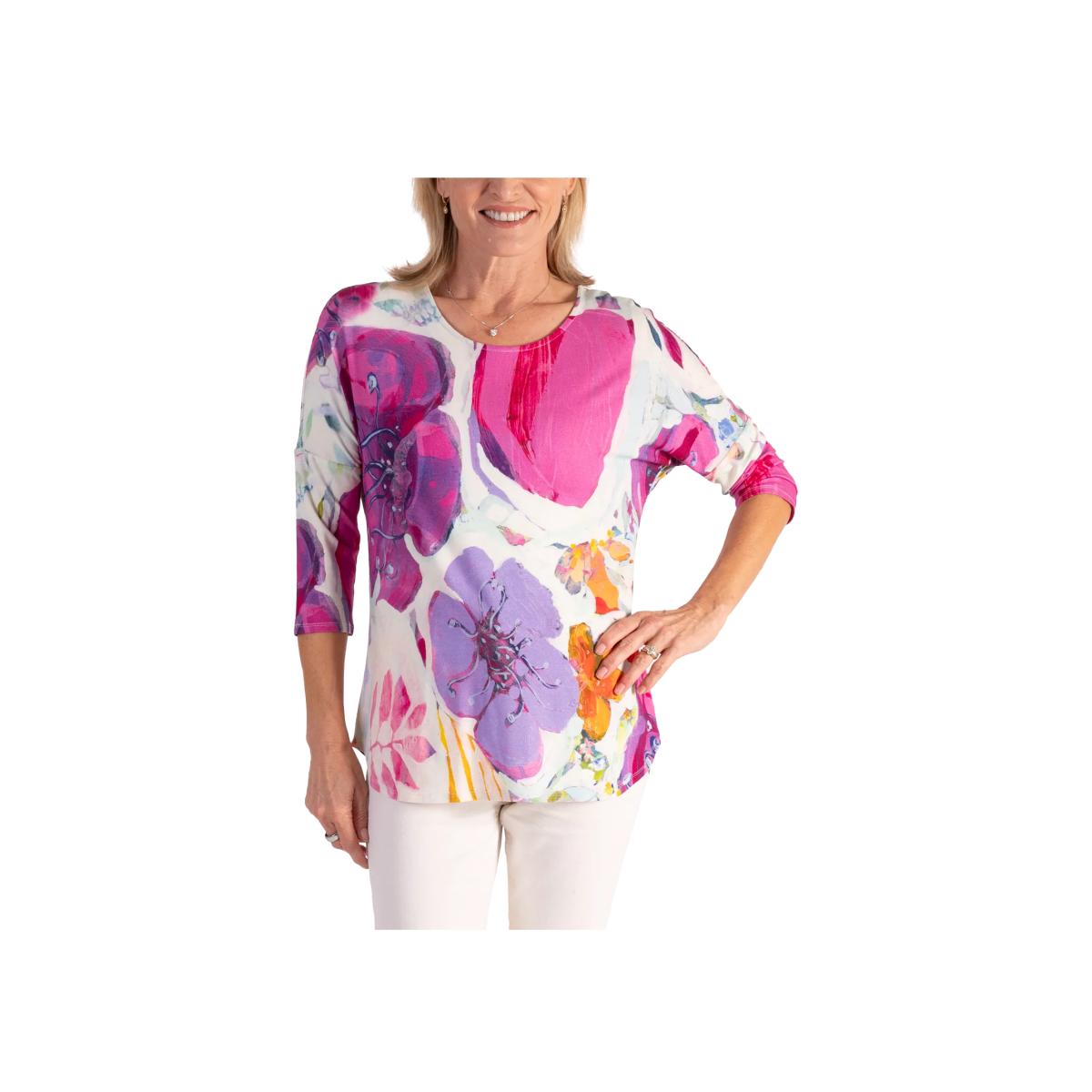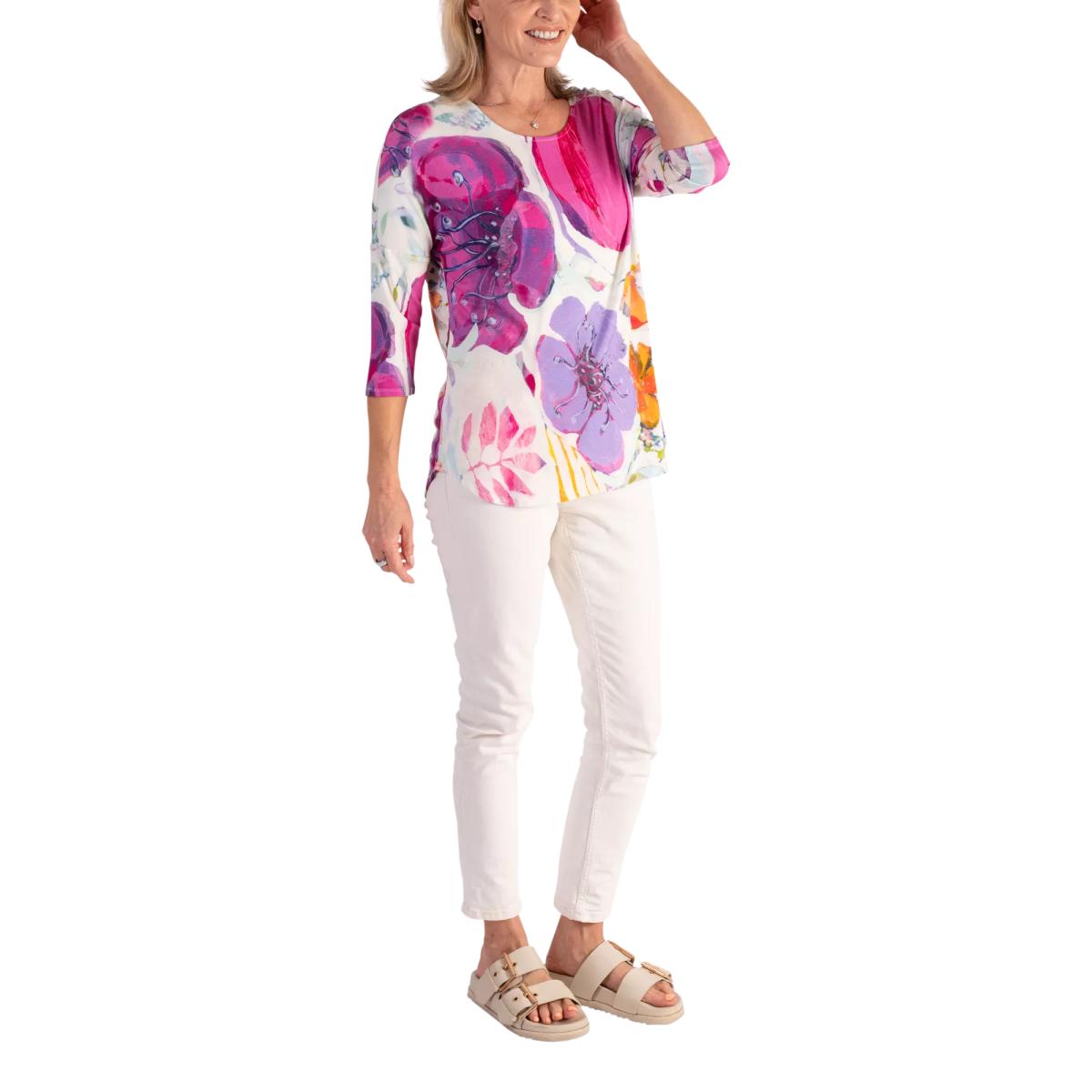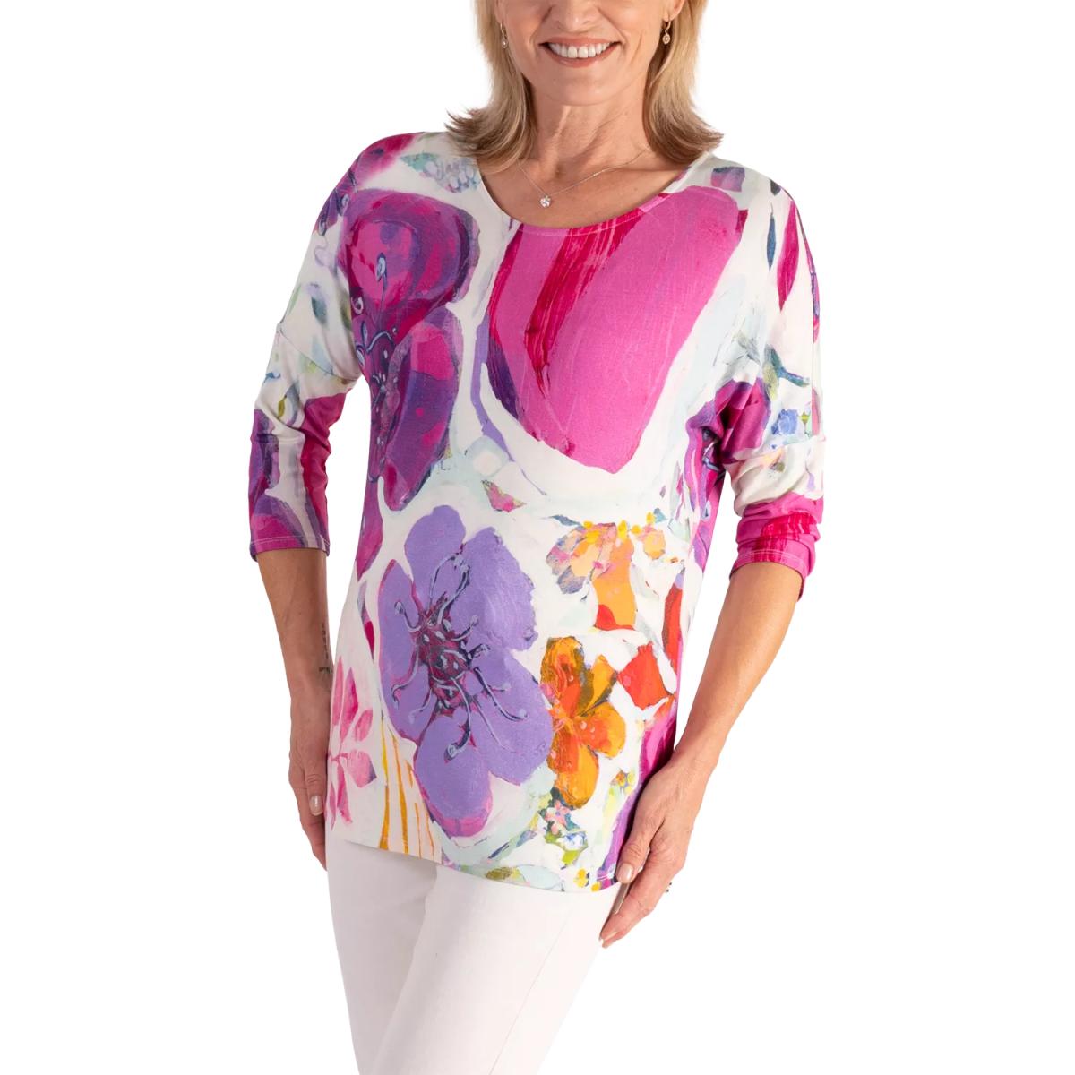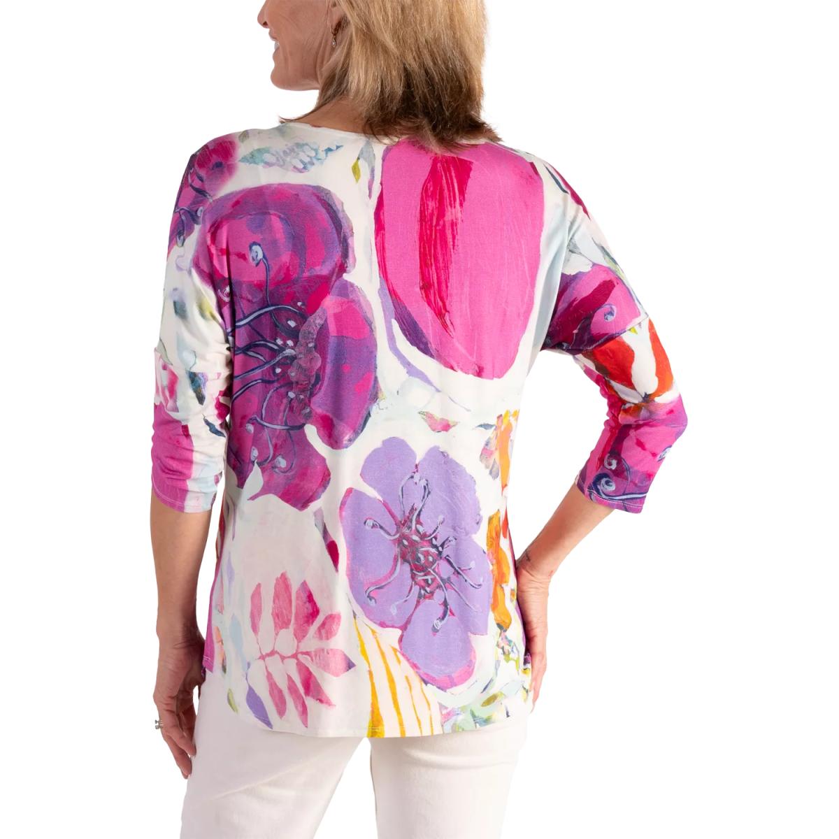 An all-year essential, this jersey top makes an impact with its bold colourful spring flowers print. Cut with a boat neckline, curved hem and three-quarter length dropped sleeves for a relaxed look, it is made from a light yet durable fabric and will make everyday dressing effortless.