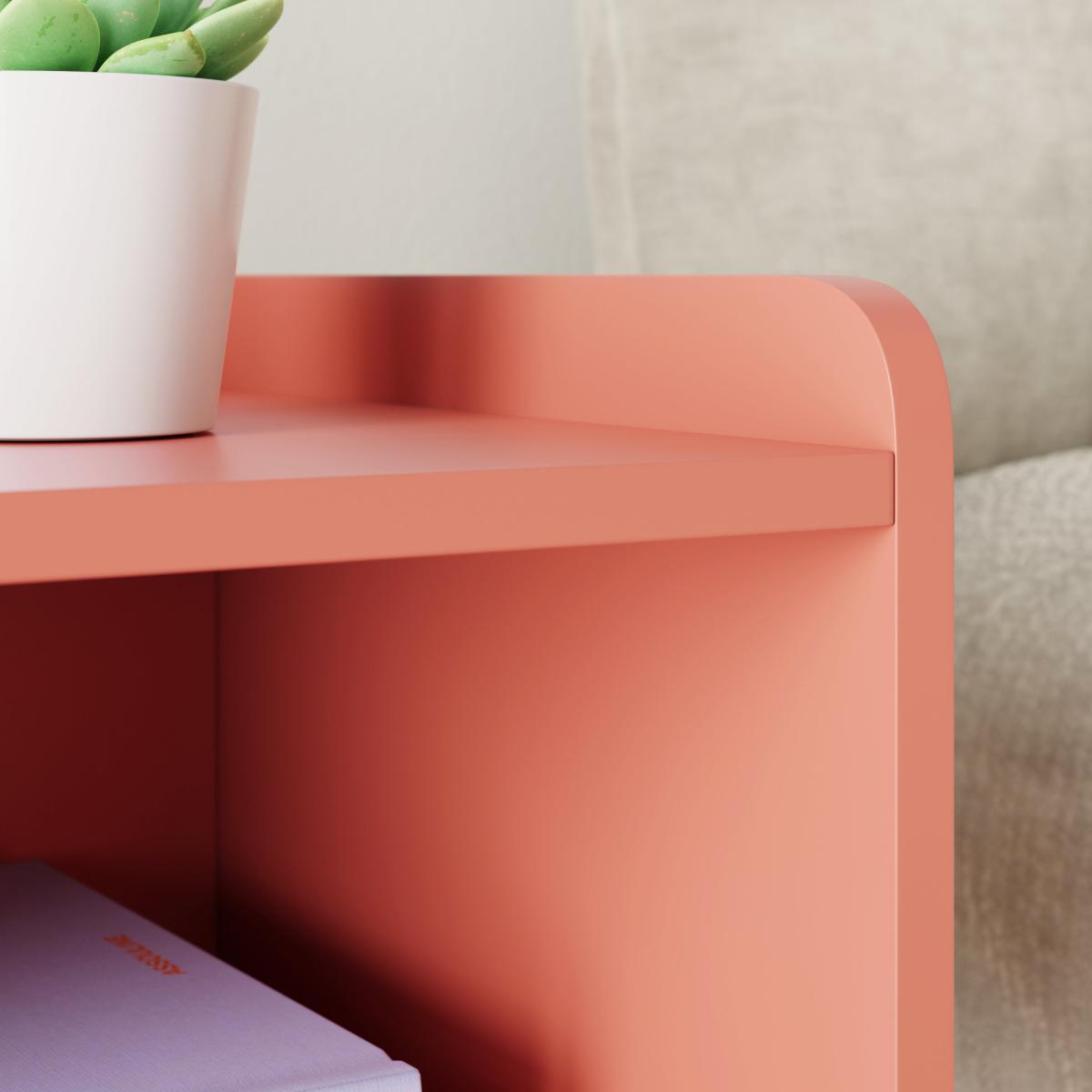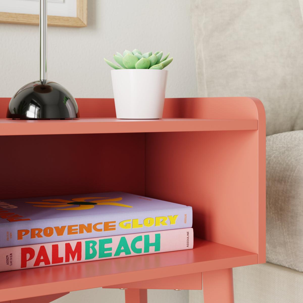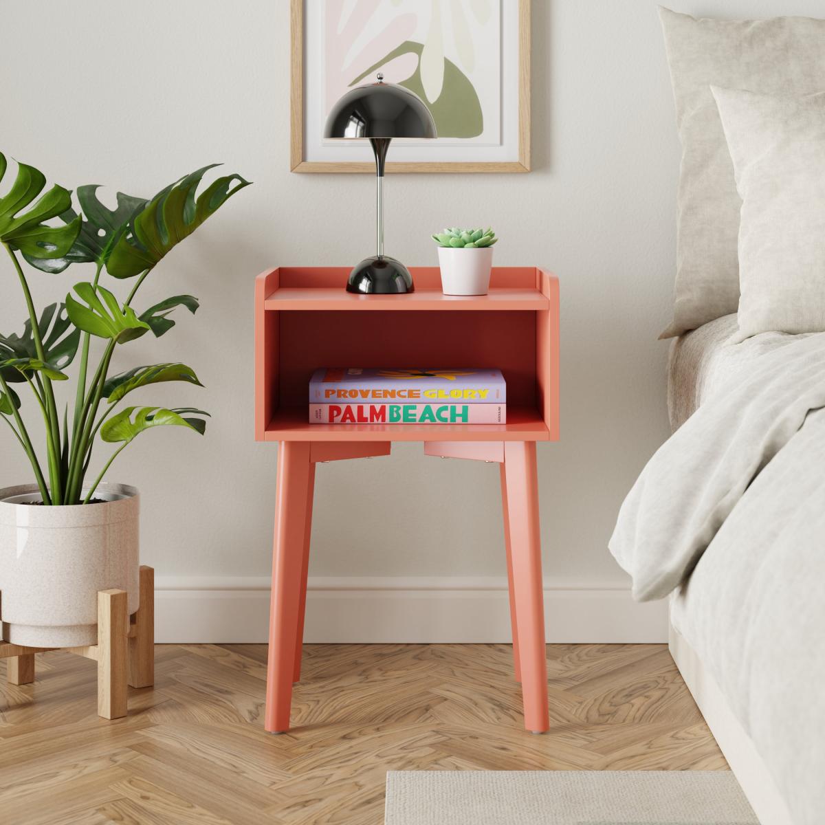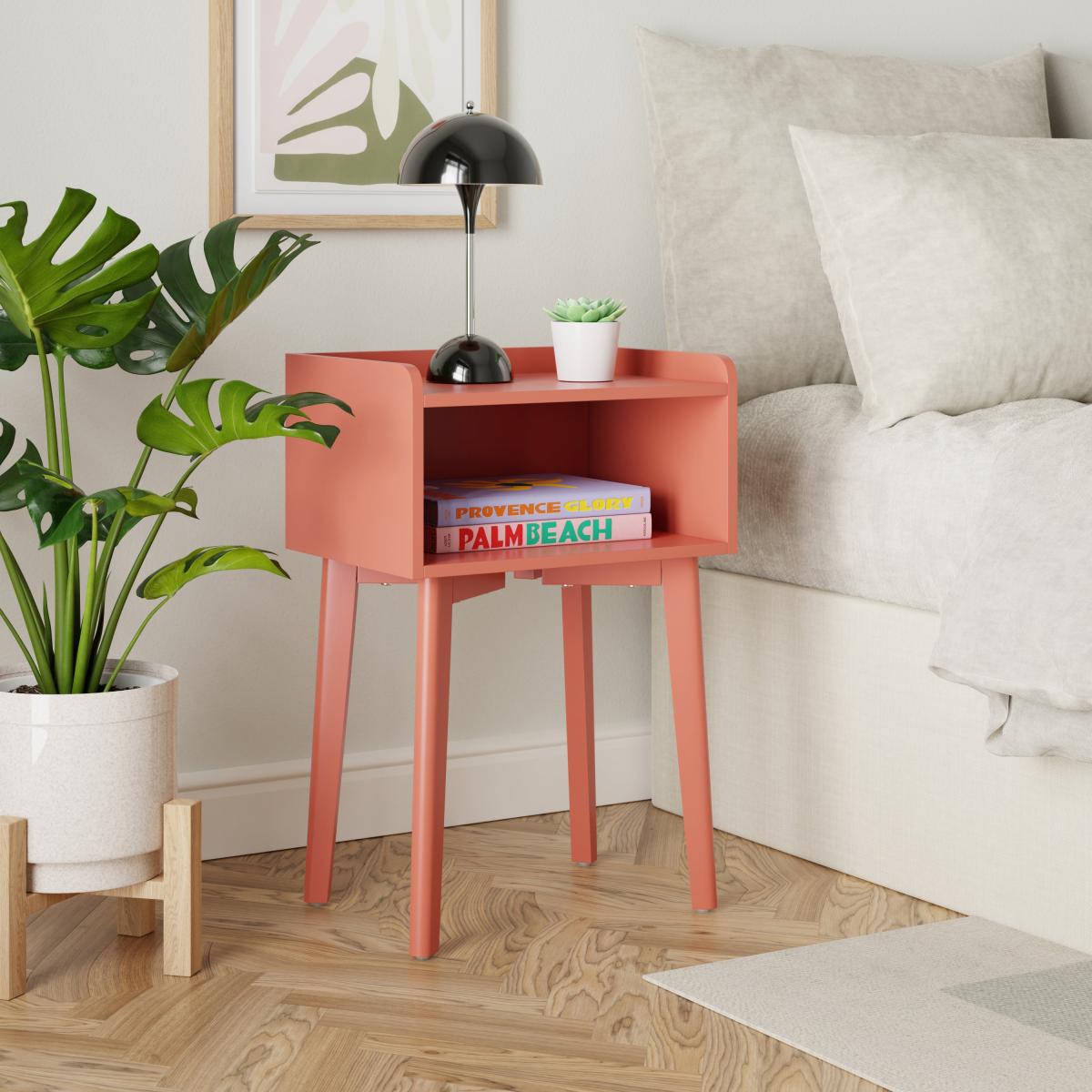 I really like this little bedside table because of its bold red clay colour - it’s a great way to add warmth and character to both contemporary and eclectic interiors. Its clean, simple lines make it versatile enough to sit alongside minimalist designs or be paired with tactile textures like soft throws or natural woods for a more layered look. Practical styling tips would include using the top to display a small lamp, a plant like the one in the image, or a few favourite books for easy access. Inside, keep clutter minimal to emphasise its sleek form, and consider stacking books or adding organisers for practicality without sacrificing aesthetics.