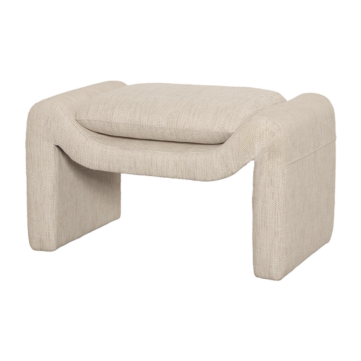 A contemporary footstool with a distinctive sculptural silhouette. Deep foam padded seat. Upholstered in a luxurious, chunky, woven polyester fabric. Use as an extension to our Chess Lounge Chair.