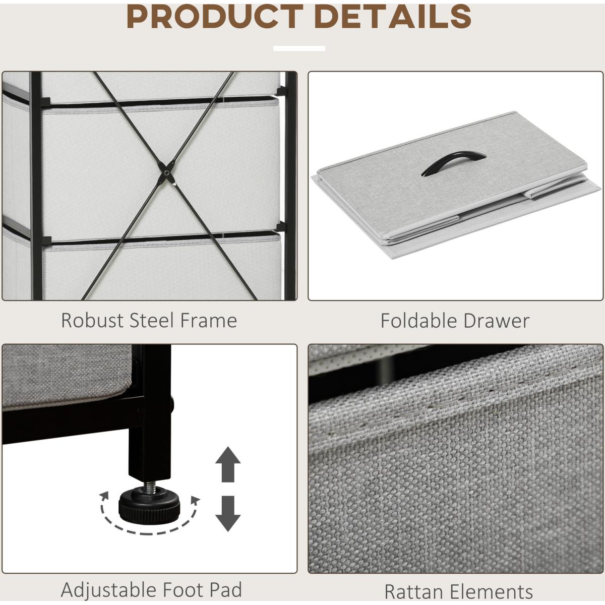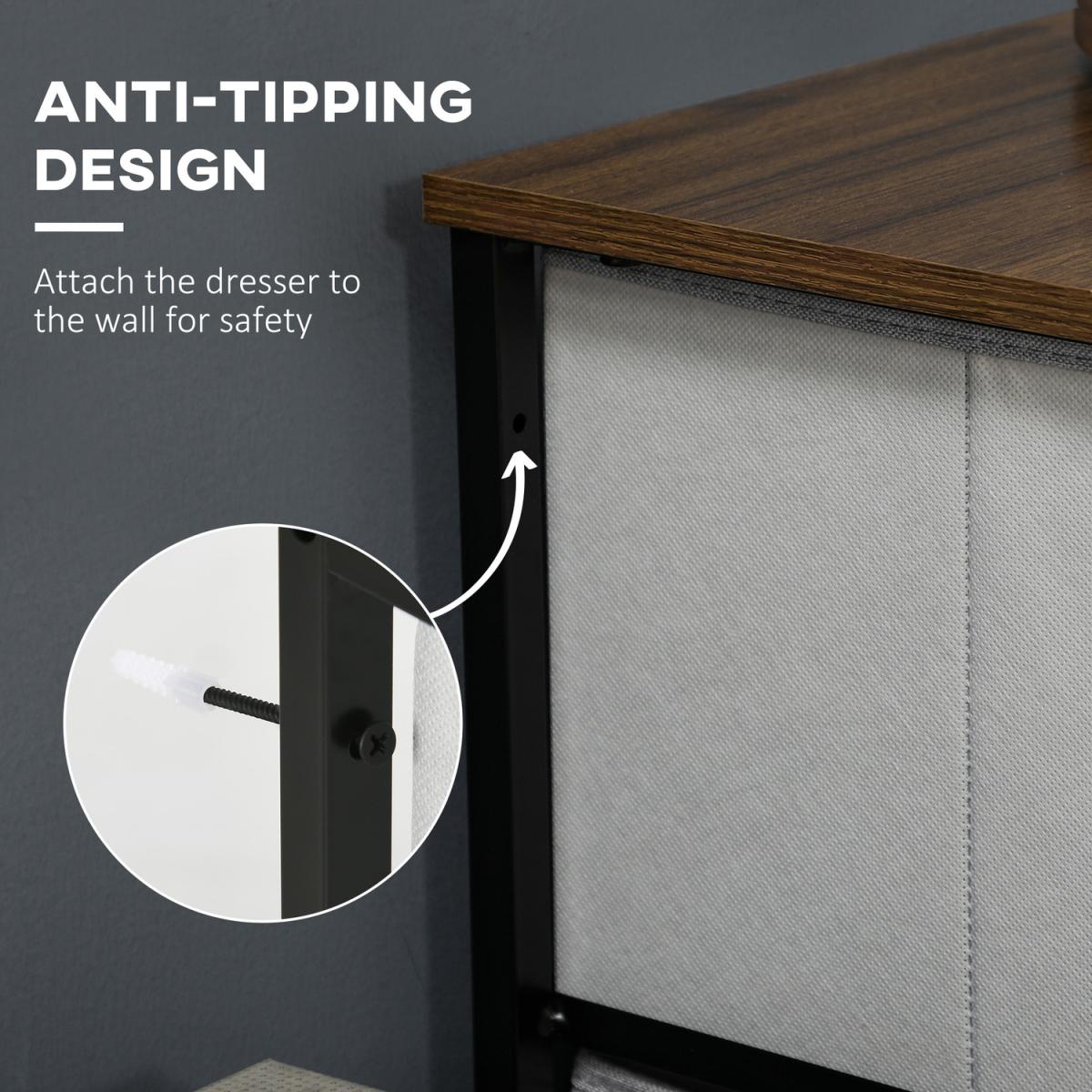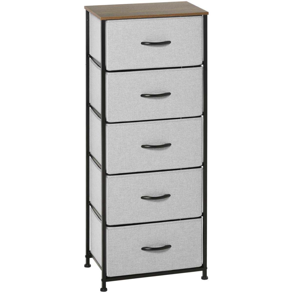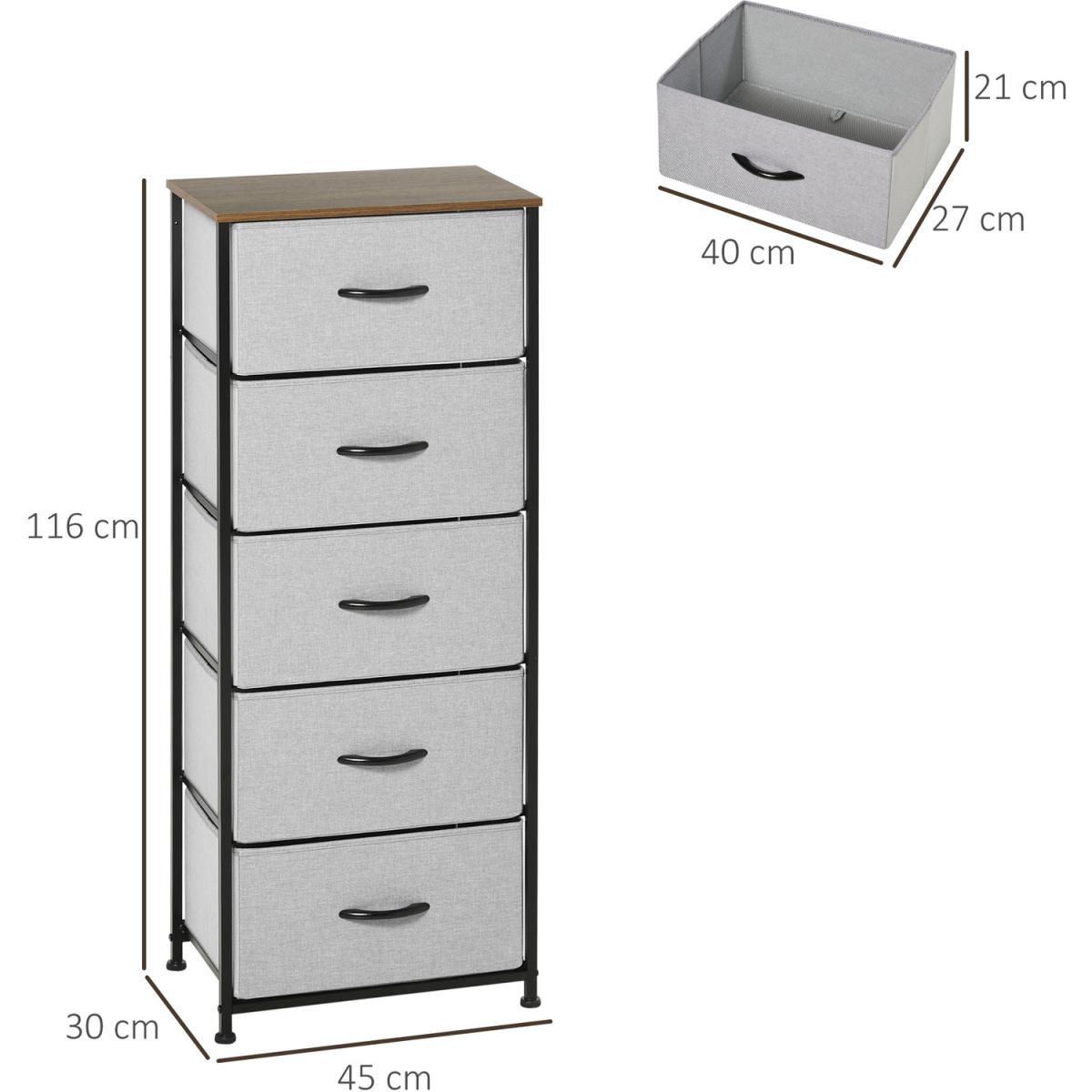 Home storage with this HOMCOM fabric chest of drawers. The five fabric drawers offer room for lots of things - keep t-shirts, tops, bottoms and more organised. The wood-effect top offers more room: a great place to display your favourite photos. The steel frame makes a strong core, with adjustable feet for balance. Comes with anti-tipping straps for safety. Use all over the home and office.