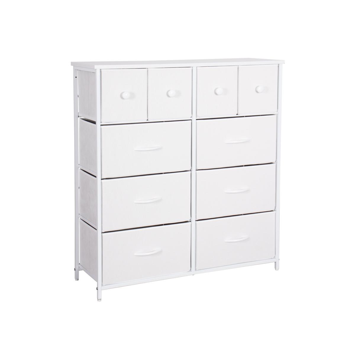 Your chest of 10 drawers is perfect for any room in the house as a dresser, TV unit hallway stand and much more. The 10 drawers are roomy providing space for lots of different items from clothes, underwear, toys, books, bedding, towels and stationary within. You can easily sort your stuff with 10 drawers (6 large & 4 small). Each large drawer can hold 50-60 socks, 20-25 T-shirts, or 15-20 pairs of trousers. Each small one can hold 15-20 socks, 5-10 T-shirts, or 5-10 pairs of trousers. Your chest of drawers is designed to be suitable for any kids or adults whilst effortlessly blending into any room interior. Finished in a smooth colour to suit all ages. Your chest of drawers is made from a very strong metal frame with a wooden top which has been designed to be extra strong and long-lasting. The handle's ergonomically design allows them to fit easily into your hand which makes opening the drawers super easy. Each drawer has a strong wooden boarded base which adds strength and increases each drawer's load capacity. Each drawer is designed with fabric material which ensures smooth opening and close functionality. Dimensions of 10-drawer cabinet: L30 x W90 x H96.7 cm / Drawer dimensions:L28 x W41 x H21.5 cm. Included in each pack, are 10 drawers, 10 handles and all fittings required for assembly.