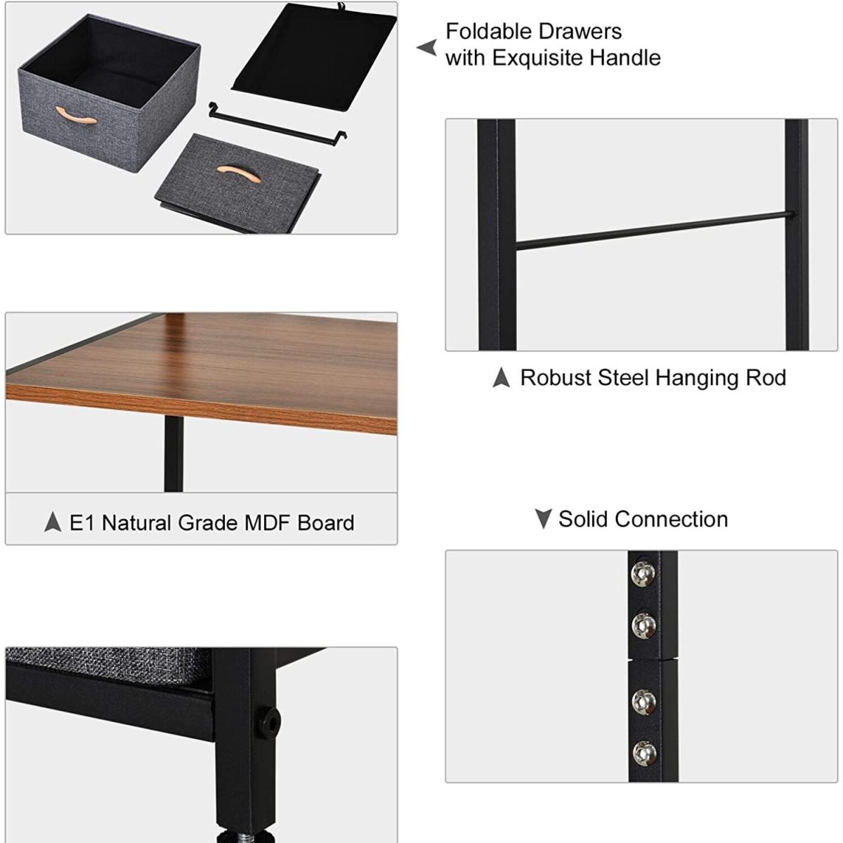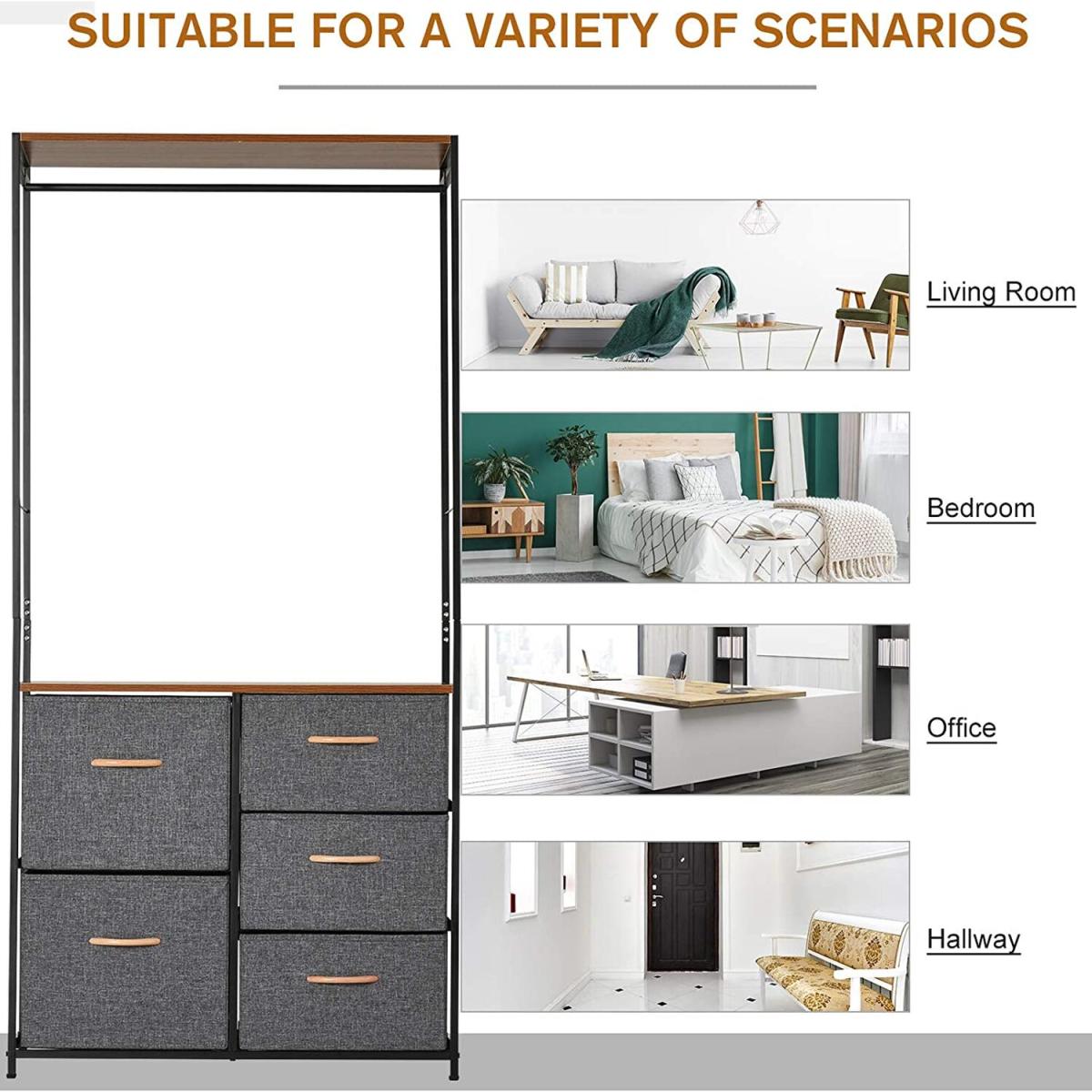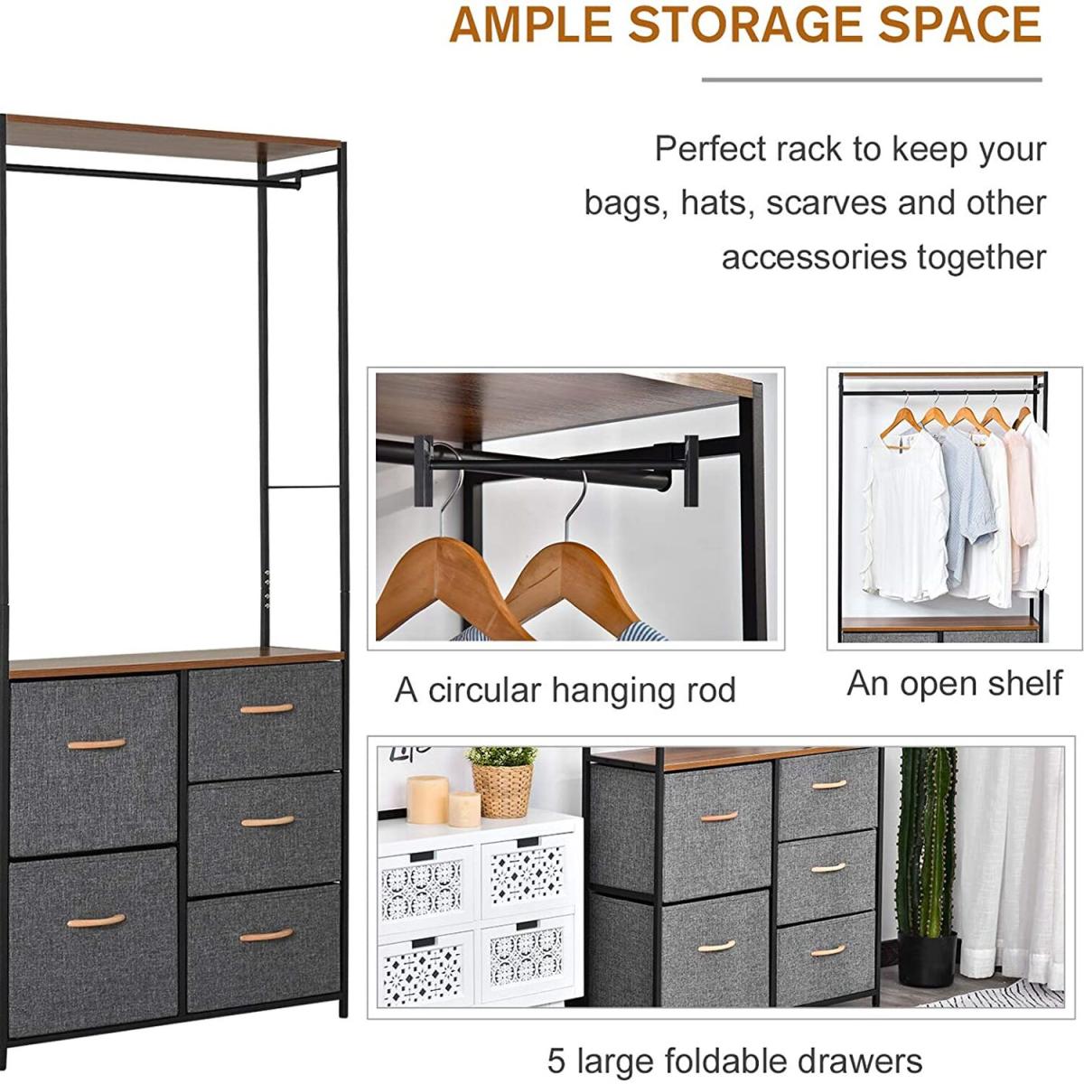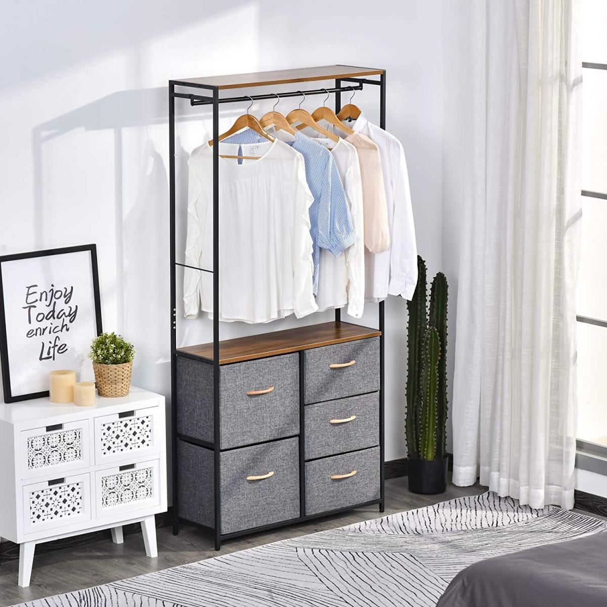I’m a fan of this black-framed rail-and-drawer combo because it combines open hanging space with concealed storage, keeping outfits on show yet organised. Its slim, industrial-inspired lines suit minimalist, Scandi or urban-loft schemes and work equally well in a bedroom, dressing area or hallway. For styling, stick to matching wooden or velvet hangers to keep the rail looking tidy; group garments by colour or season for easy pick-and-mix. Use the fabric drawers for scarves, socks or folded knits, and top the shelf with a simple pot plant or woven basket to soften the metal frame. Coordinate with other black-trimmed furniture or lighting for a consistent look.