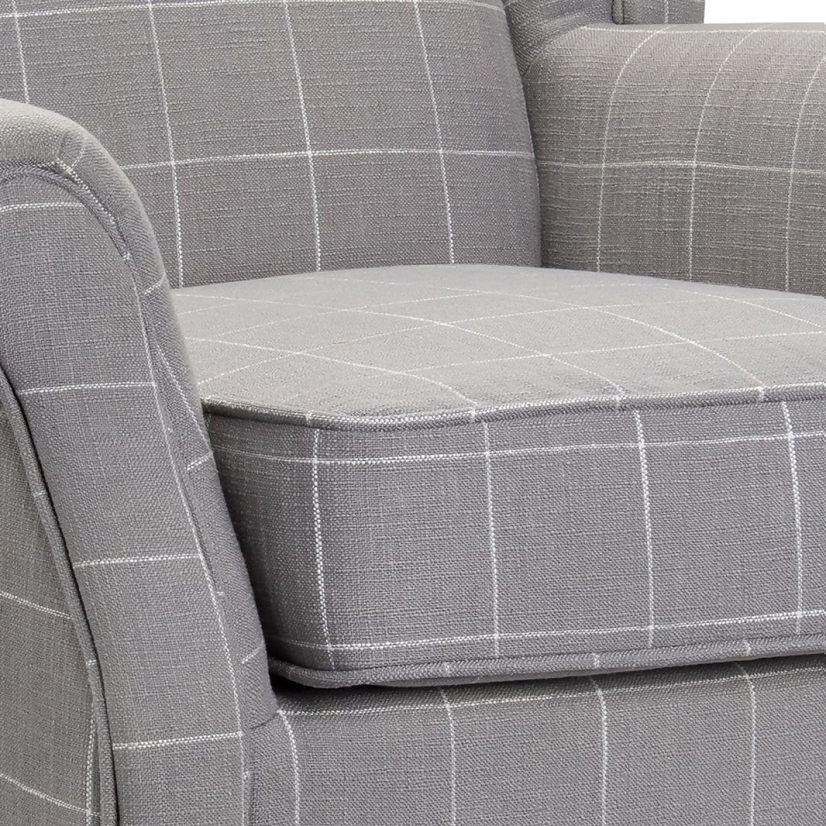With its stand-out grey check and elegant silhouette, our Chester chair has a real presence about it. It has just the right blend of retro and modern. It ticks vintage boxes with its traditional scroll arms and deep button back. Its studded detailing gives it that contemporary lift. An upright sit, Chester is the perfect place for you to leaf through a magazine or become engrossed in your latest read.