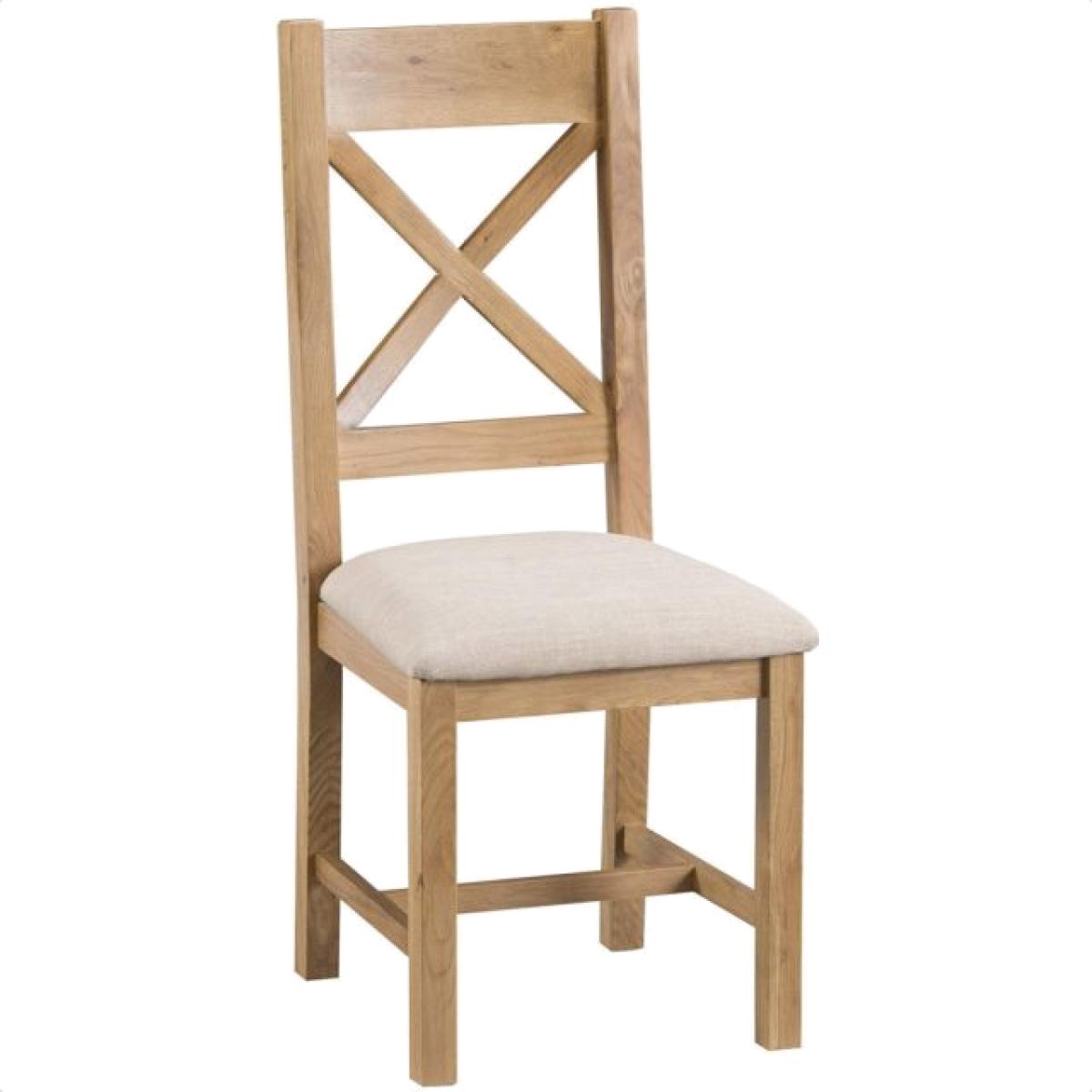 Crafted from a combination of solid oak and real oak veneers, the chunky, substantial Chester solid oak dining chair has an attractive cross back design and is available with a wooden seat or a padded seat for greater comfort. Ideal for formal dining or for use at the kitchen table, these chester dining chairs have been built to last and will look great in both traditional and comtemporary settings. Solid oak frame Real wood veneers Natural oak finish No assembly required Dimensions - 44.5cm W x 52cm D x 105cm H All screens vary in colour reproduction and whilst every effort has been made to display the colour as accurately as possible it is for guidance only.