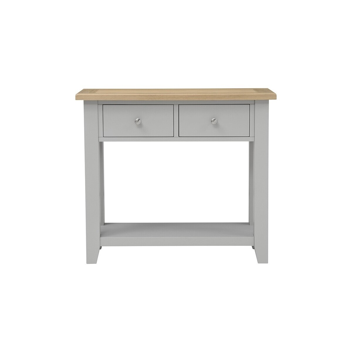 We could all do with somewhere to keep all that leaving-the-house-stuff we always end up rushing around trying to find in the morning. A console table is the answer. And not only will it help you stay organised and save time - this one from our ever-so-smart Chester Grey range will be a handsome addition to your hallway too. The sturdy top has been waxed and lacquered to bring out its characterful grain and contrasts beautifully with the grey paint finish on the frame and handy lower shelf. The two drawers will keep all your morning essentials easy to find and you get both smart polished handles and painted wooden handles, so its final appearance is up to you.