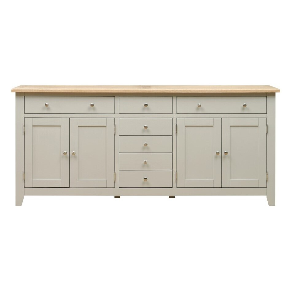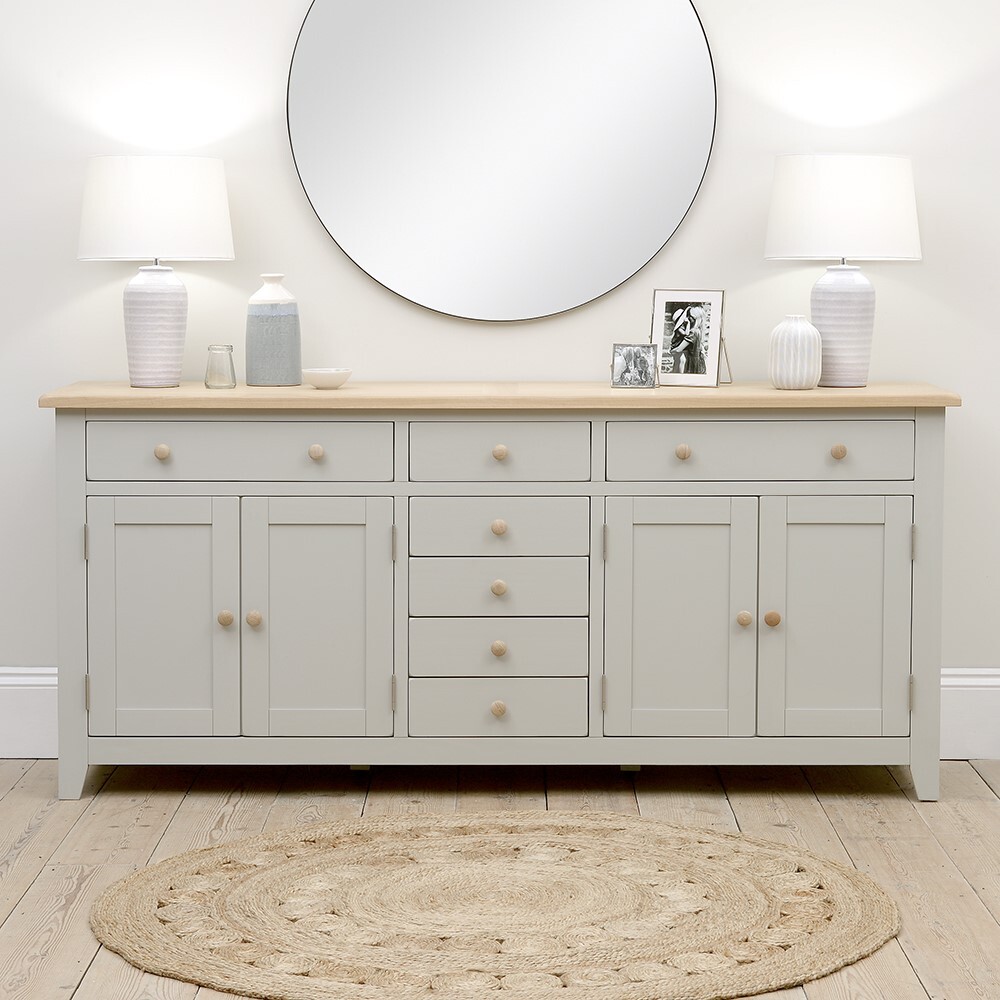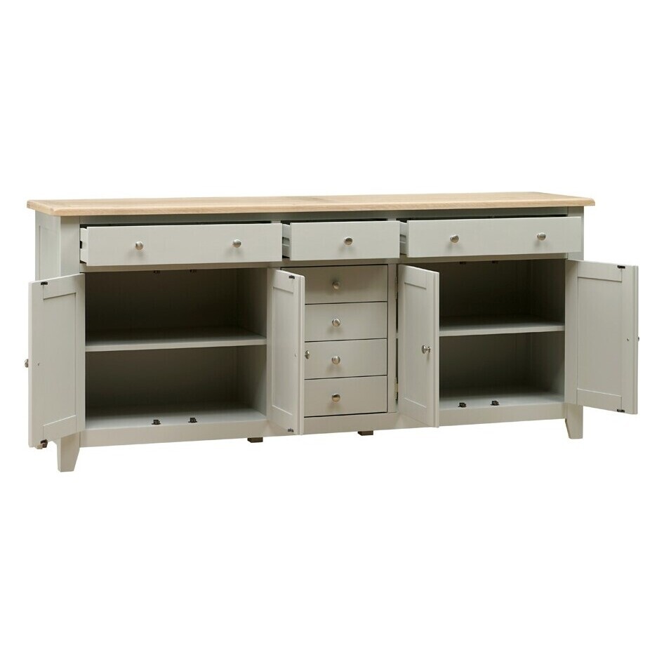 Our Chester Dove Grey Grand Sideboard is a stunning addition to any dining area or room, not only providing masses of storage for crockery, tableware and accessories but also giving you plenty of surface space which is great for entertaining as you can layout an impressive buffet or set up a serving area. The natural oak top is finished with oak veneers and a white wax and clear lacquer to protect the surface from minor bumps and scratches.