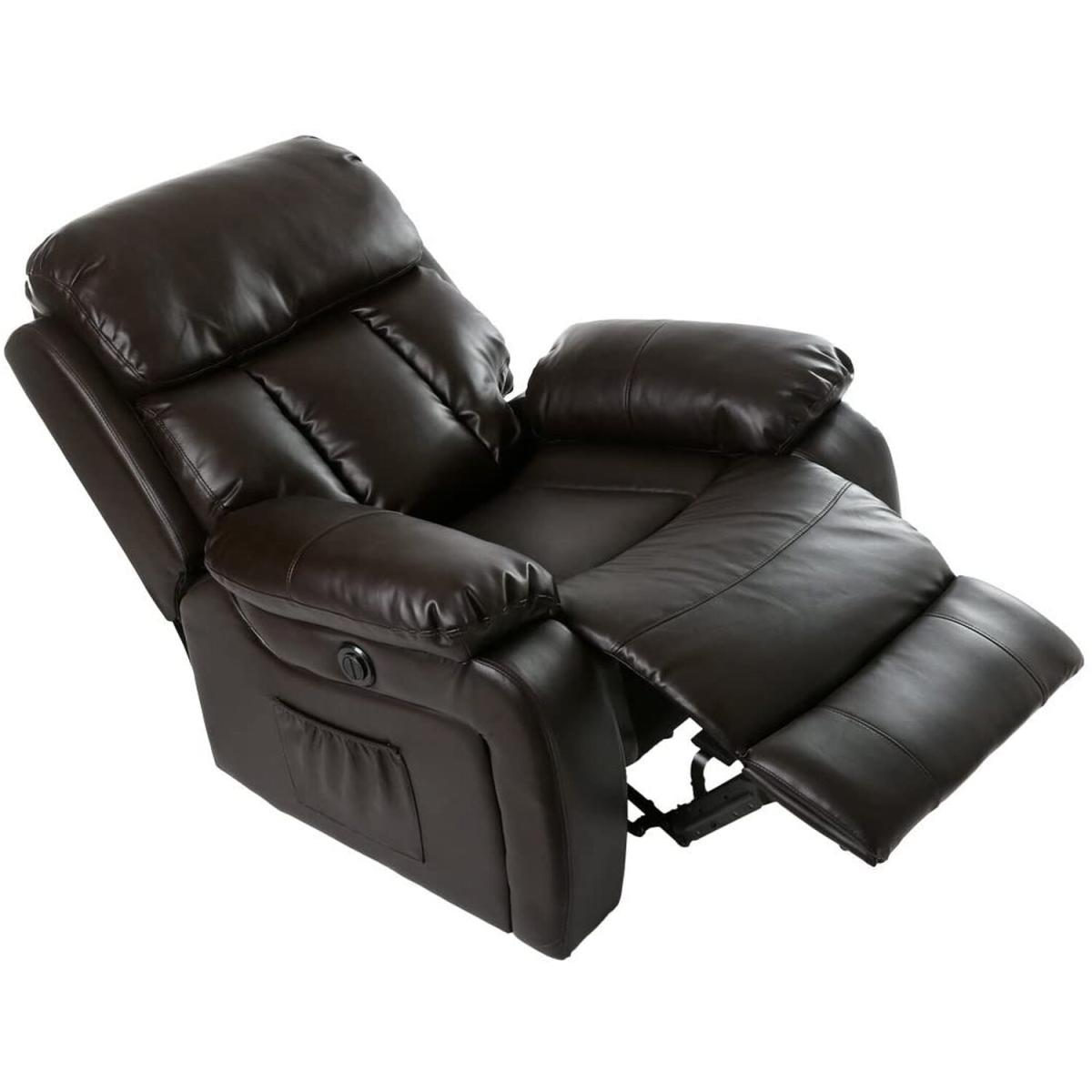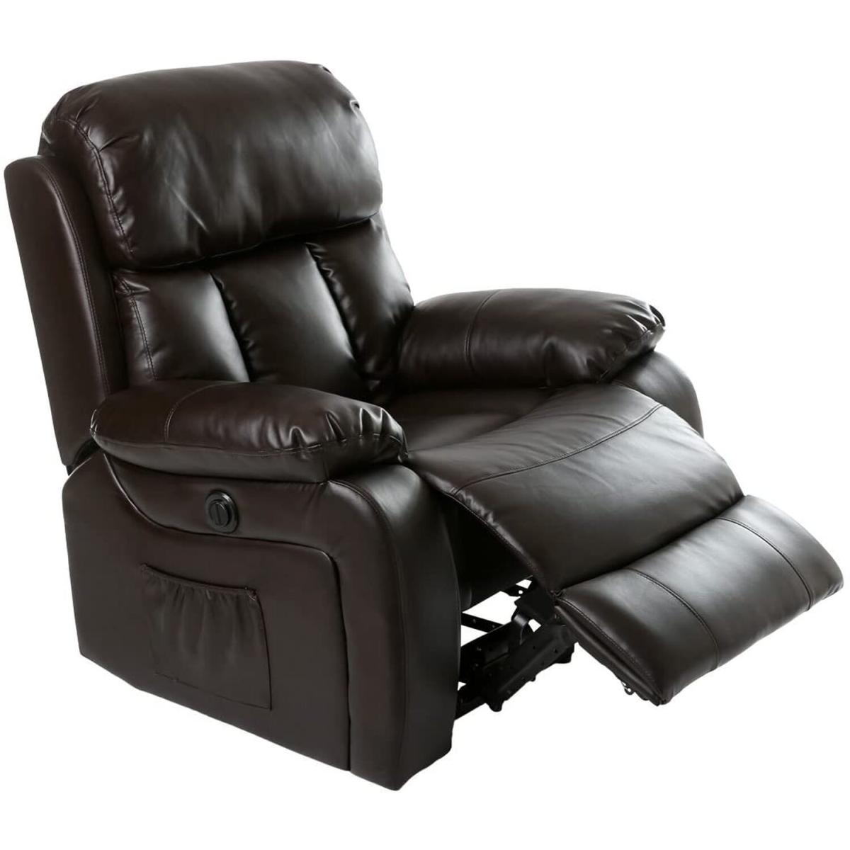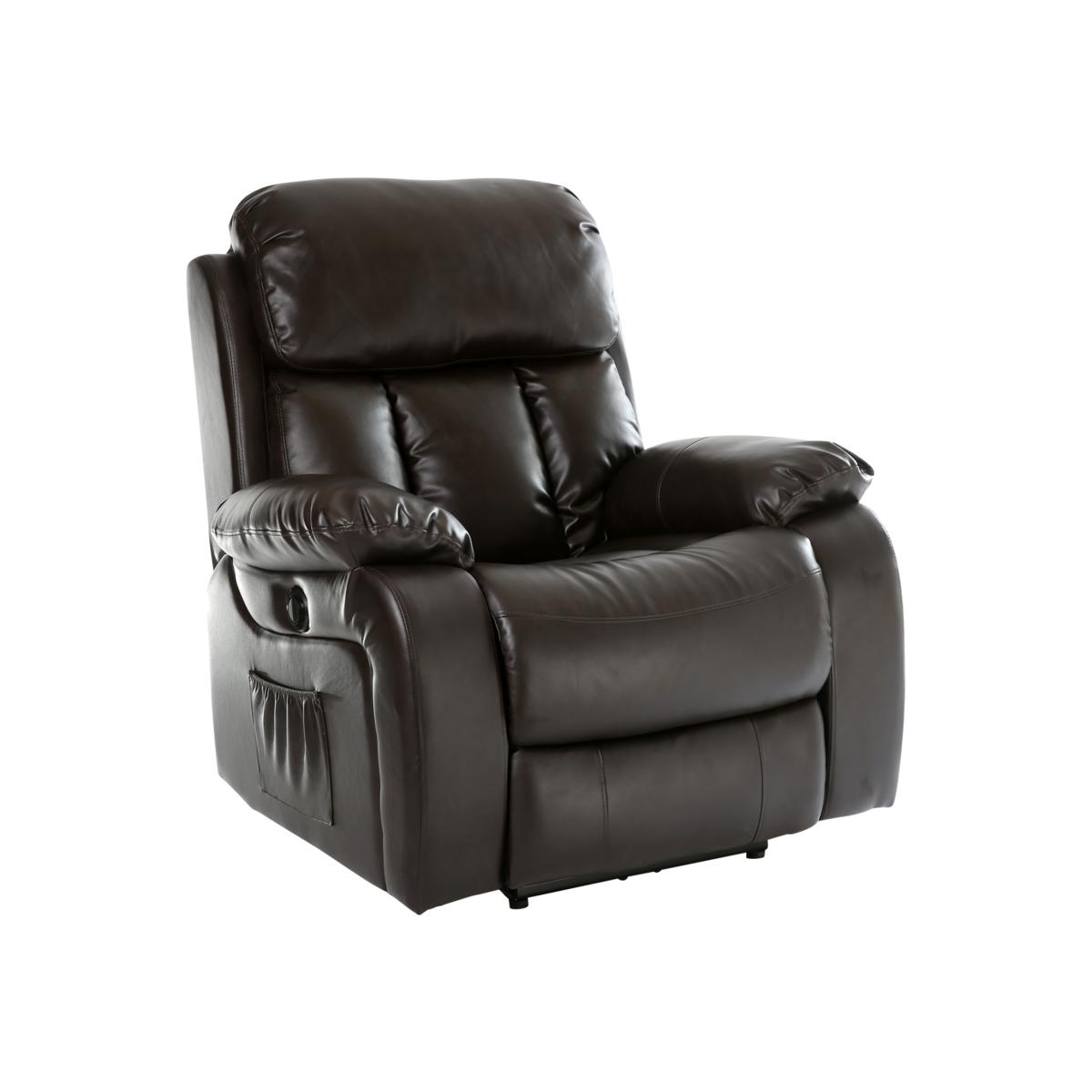 Heated massage chair with built-in footrest Although this very comfortable bonded leather armchair can be used for or watching TV, it is particularly suited to those who need support for their back or find it hard to relax. The soft foam padding in the backrest and headrest offers just the right balance between comfort and support. And the comfortable padded armrests help you choose a position that offers complete relaxation for your arms. The backrest can be reclined to a comfortable position by pressing the buttons below the armrest, the electric motor will then effortlessly reline the chair to the desired position. The footrest is also raised using the same buttons. The attached controller lets you heat the base of the backrest to warm the muscles in your lumbar region. You can also choose to have a soothing massage of your upper and lower back, thighs and calves. This vibration massage is provided by eight built-in pads placed at strategic points in the chair to relieve tired or aching muscles. The controller for the chair can be neatly stored in the side pocket. Available in three colours black, brown and cream. Also Available with a manual latch mechanism for a more cost-effective option, please see our other items.